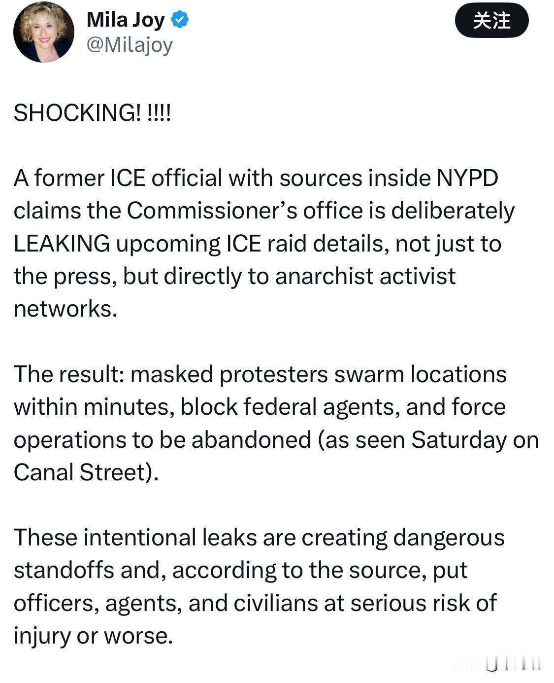 太震惊了!!! 一位与纽约警察局内部有联系的前移民执法局官员声称,局长办公室故意泄露即将进行的移民执法局突袭行动的细节,不仅泄露给媒体,还直接泄露给无政府主义活动人士网络。 结果:蒙面抗议者在几分钟内涌入各个地点,阻挡联邦特工,迫使行动中止(如周六在运河街所见)。 这些蓄意泄露的信息造成了危险的对峙局面,据消息人士称,这些信息使警官、特工和平民面临受伤甚至更严重后果的严重风险。