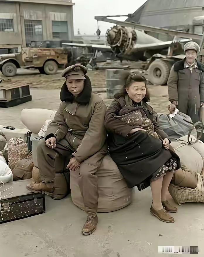 老话说的好,兵败如山倒,画面显示的内容,就是大势已去的国军及家属,收拾好大包小裹一大堆,准备去湾湾,画面中的这几个人,从他们脸上似乎并没有看到太多的紧张,尤其是这一男一女,男子吸着烟,女子怀里抱着的不知道是什么,也许是襁褓中的婴儿,两人的脸上还有一些笑容!