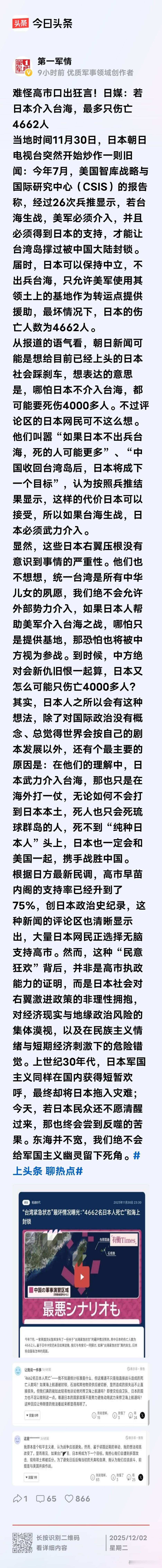 4662人伤亡,代价不是很大!小日子自己推算,如果武力介入台海,最多伤亡4662人,也不知道这是如何推算出来的。现在高市挑衅性言论引发的后果越来越复杂,它们已经在实际行动上迈出了一步步大胆的试探,无所顾忌,十分的狂妄,很多事情都是经过周密计划的,也是蓄意谋精心准备多年的结果,普通民众的热情也特别的高涨,小日子这是要重蹈覆辙的节奏!