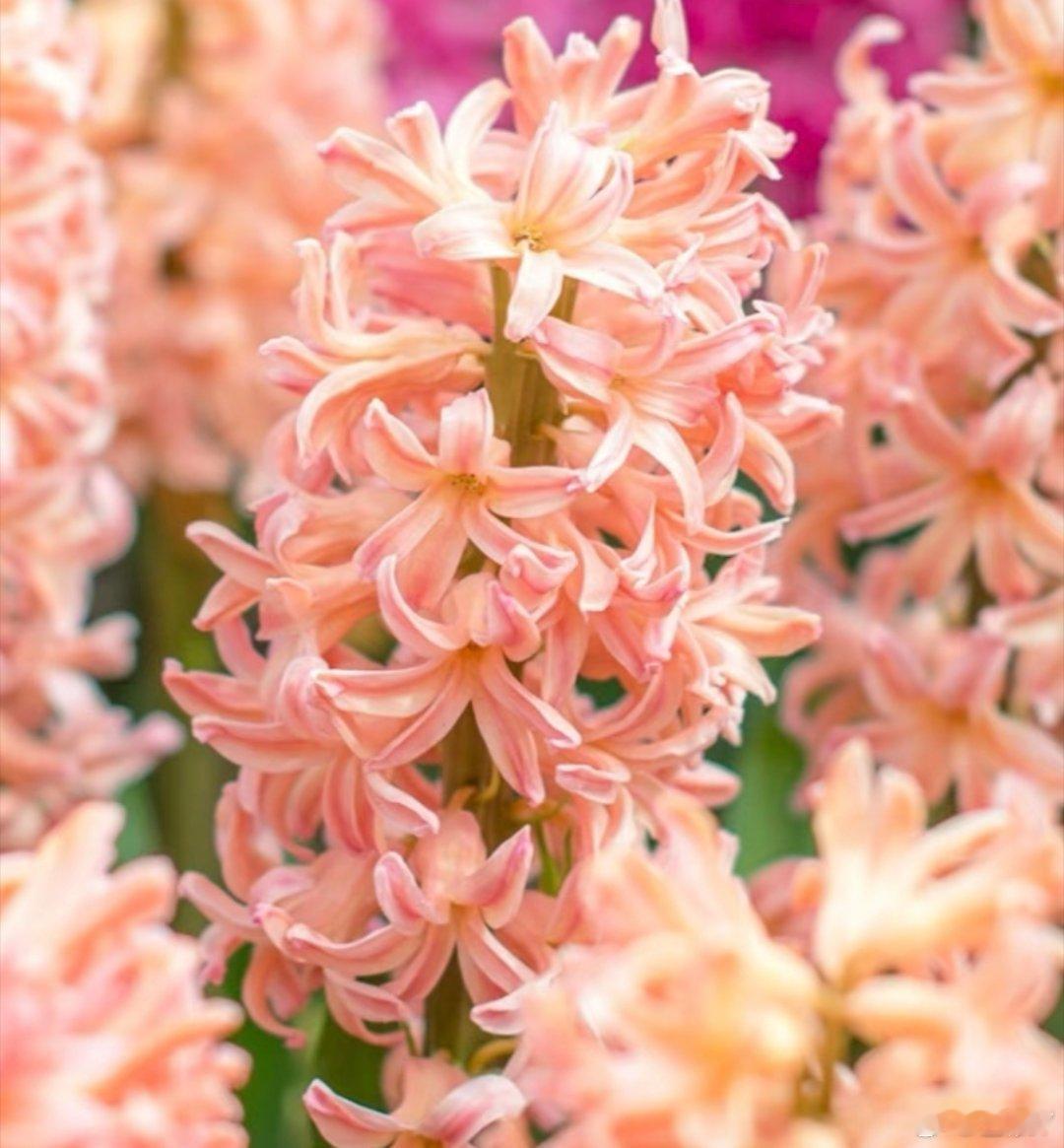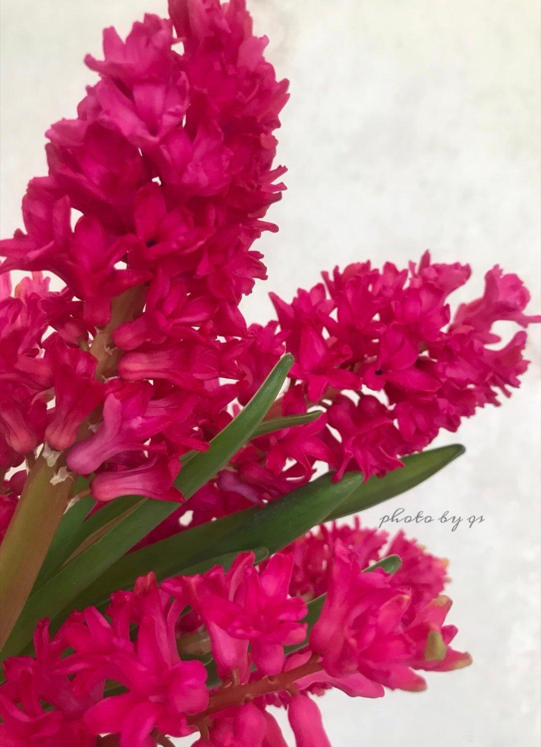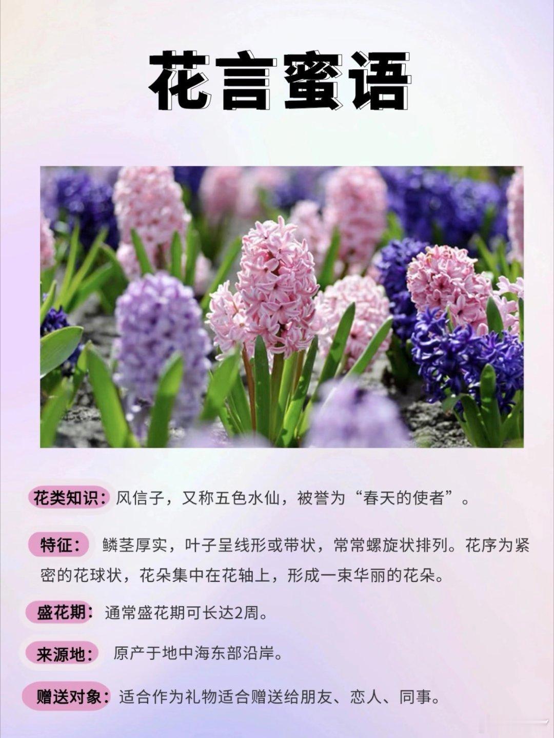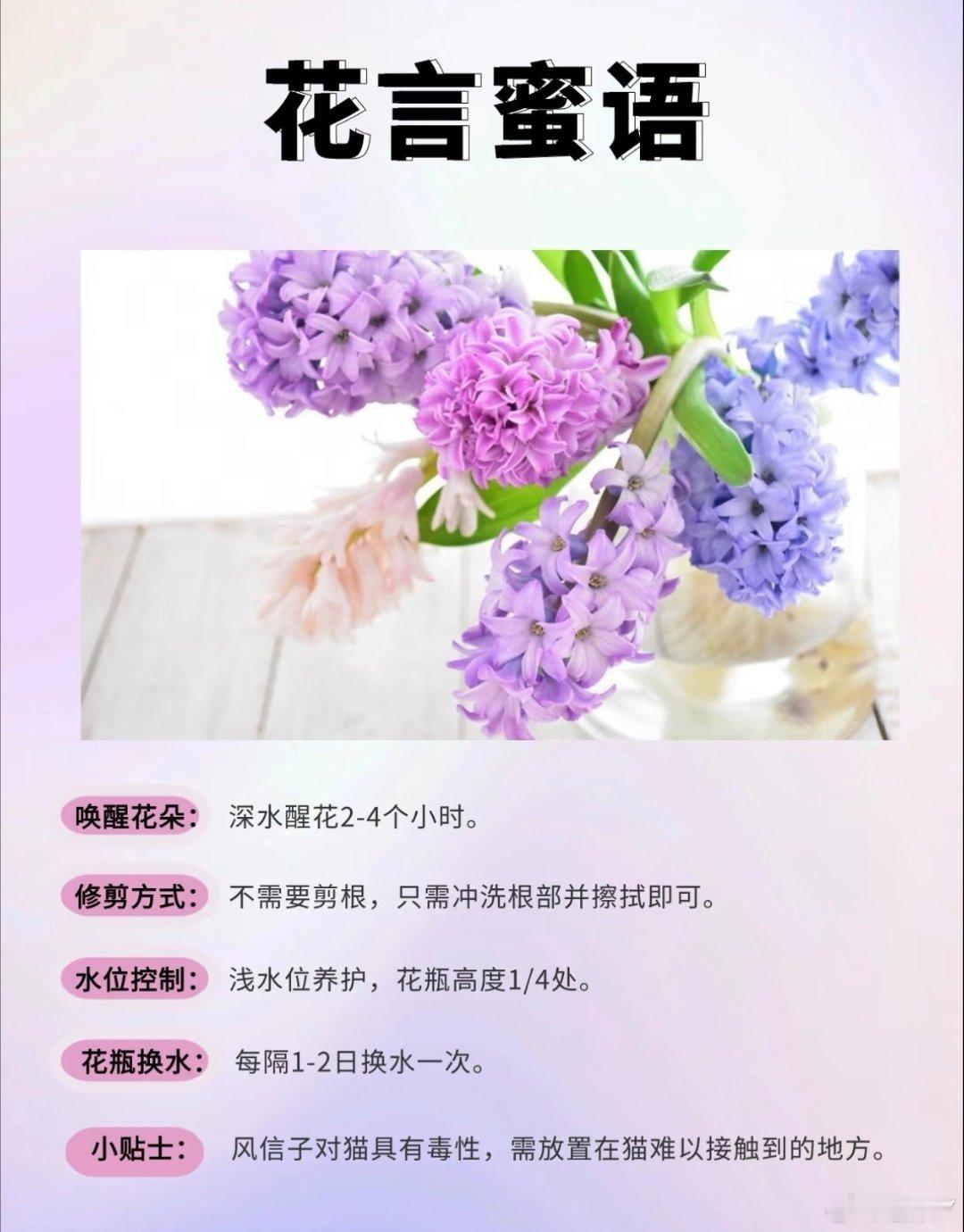 风信子学名:Hyacinthus orientalis L.别名:西洋水仙、五色水仙、时样锦花语:励志、向上、燃烧生命之火、生机盎然花期:夏季7天左右 冬季14天左右特点:风信子是经研究发现会开花的植物中最香的一种花卉,草本球根类植物,其花数量众多,体势粗壮,花头硕大,很惹人喜爱的一种花。搭配:风信子可搭配现代风、国潮风等风格花束,其特别的形态和硕大的花头能够增添花束的层次和韵律,让花束显得更加高级;在插花中常作为主体呈现,一枝独秀,配以一些碎花小草,给人一种生机活泼的感觉。养护1⃣️换水:夏季每1~2日一次  冬季每3~4日一次2⃣️清洗:花瓶清洗干净,擦掉水渍3⃣️水位:花瓶高度1/44⃣️修剪:风信子无需剪根,直接冲洗根部擦拭即可