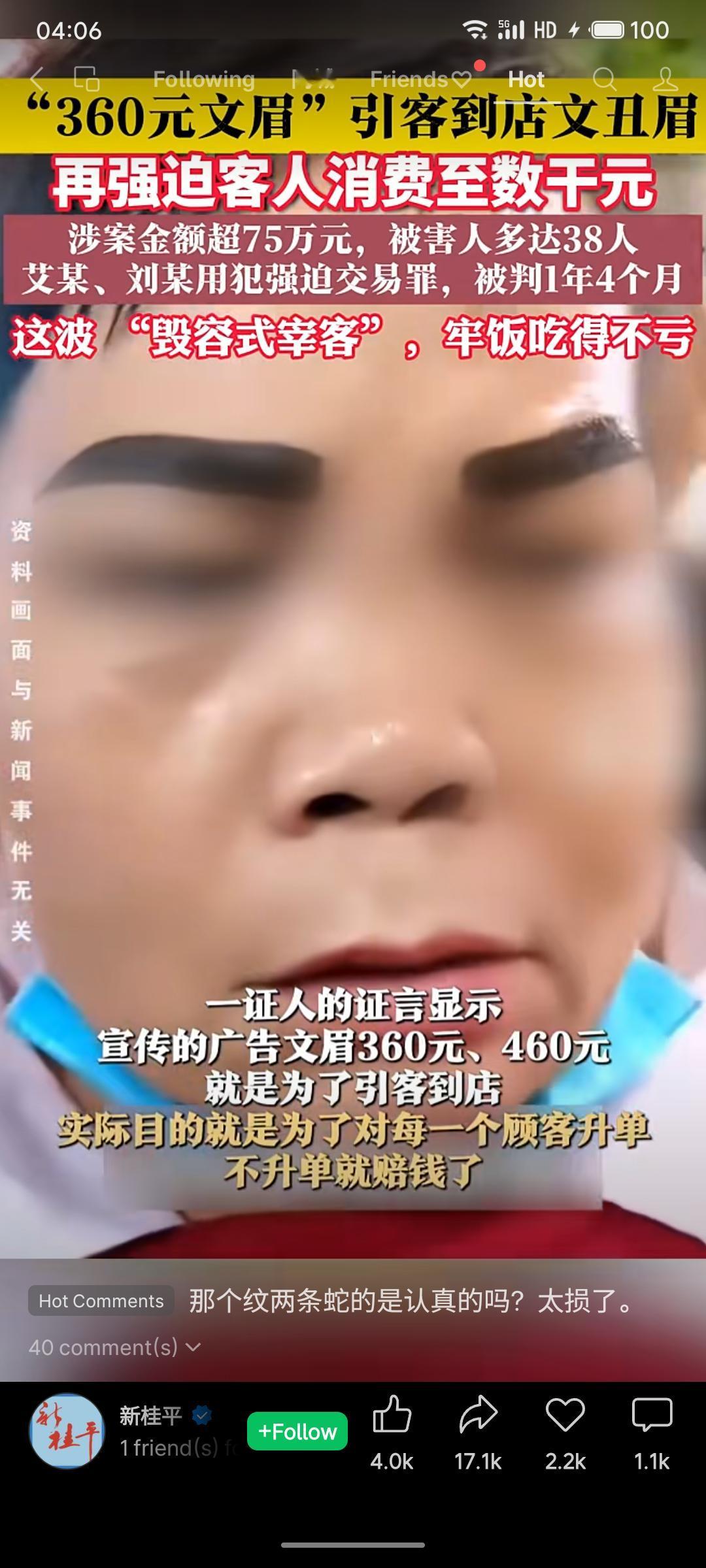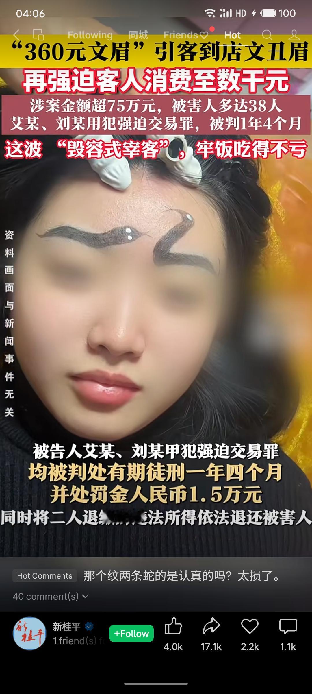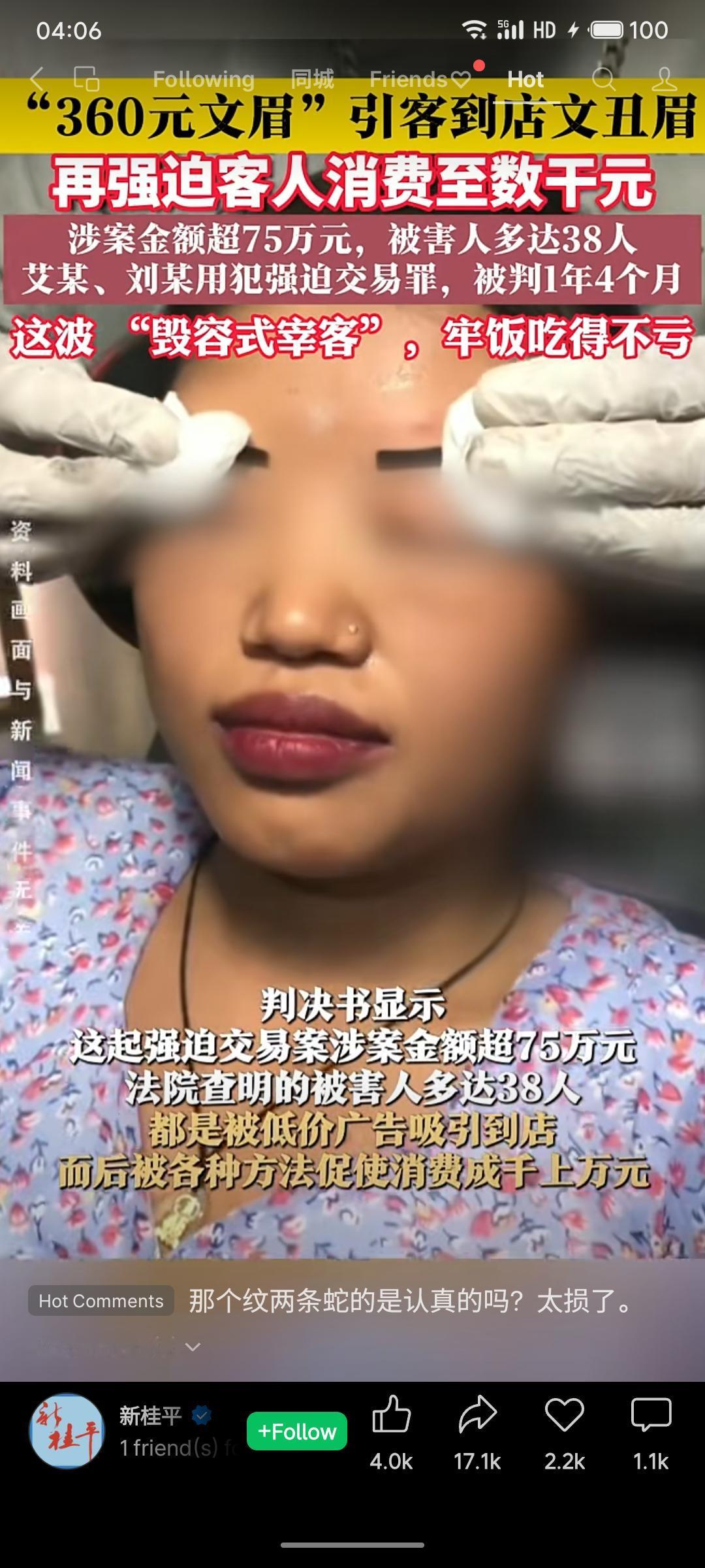 河南淇县一美容店以“360元文眉”低价广告诱客进店,随后通过强迫手段迫使38名顾客消费升级,涉案金额超75万元。法院以强迫交易罪判处主犯有期徒刑一年四个月。此案揭露了美容业“低价引流、强买强卖”的宰客套路,判决有力维护了消费者权益与市场秩序。
