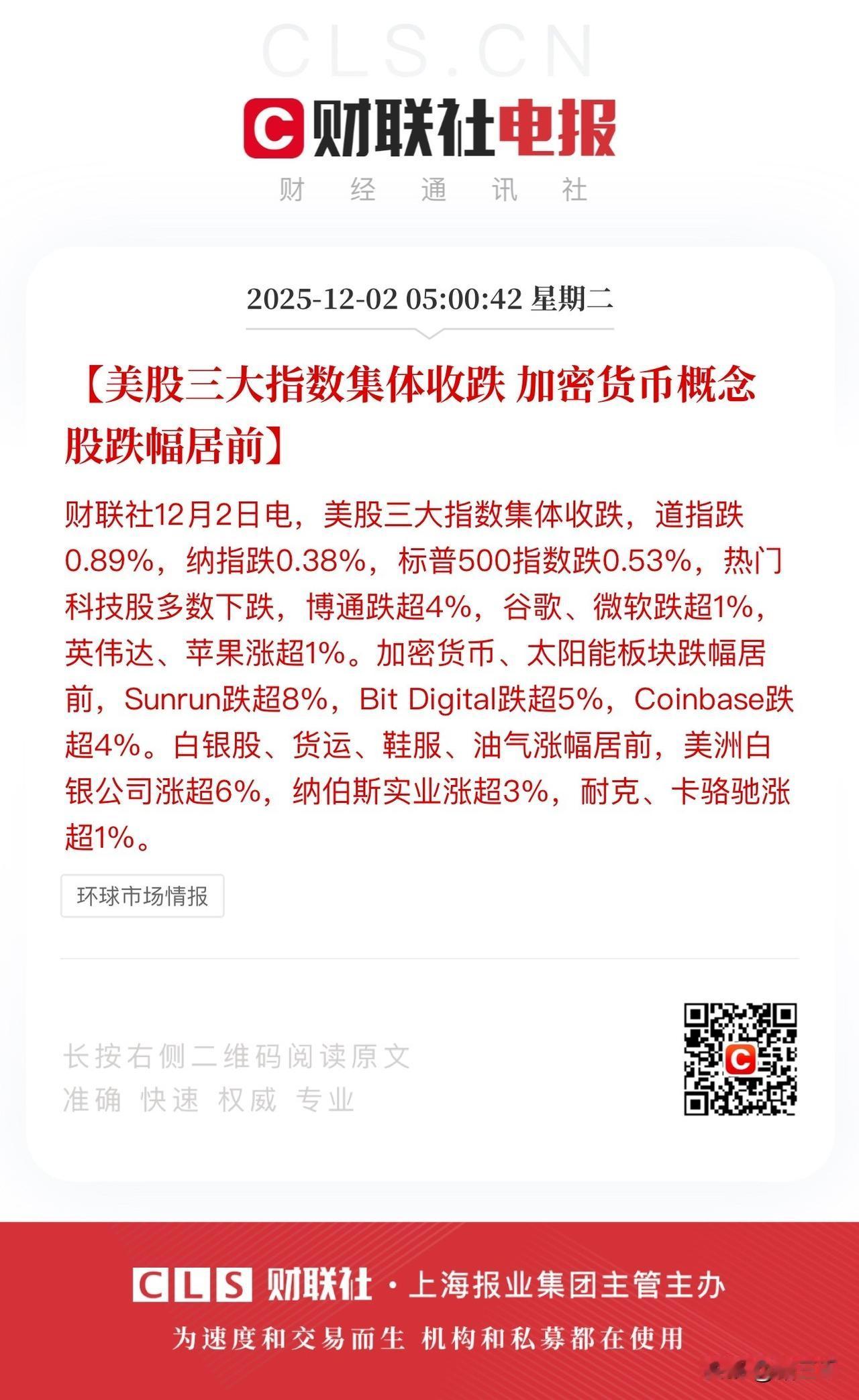 今晚美股寡淡中却又理所当然! 白银牛市轰轰烈烈, 华尔街资金肯定聚焦在白银板块, 这是意料之中, 因为只有在顶峰, 多空双方才能快速完成筹码交换! 上一次期货盛宴还是黄金4400美元/盎司, 再往前就数137美元/桶的原油了。 全球期货人的盛宴。 三大指数集体收跌, 英伟达止跌, 苹果继续创新高。 中概股阿里巴巴再顶大阳线, 这一轮科技牛市还未结束, 最后一站AI应用牛市势必轰轰烈烈!