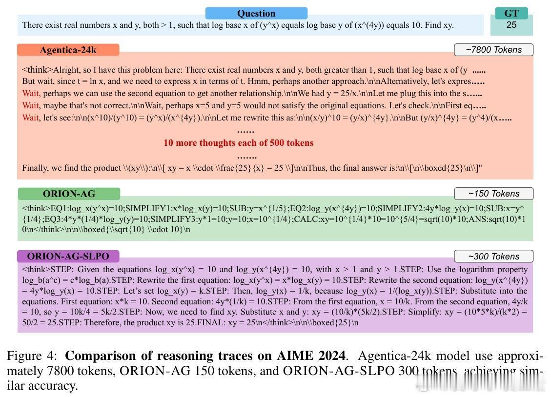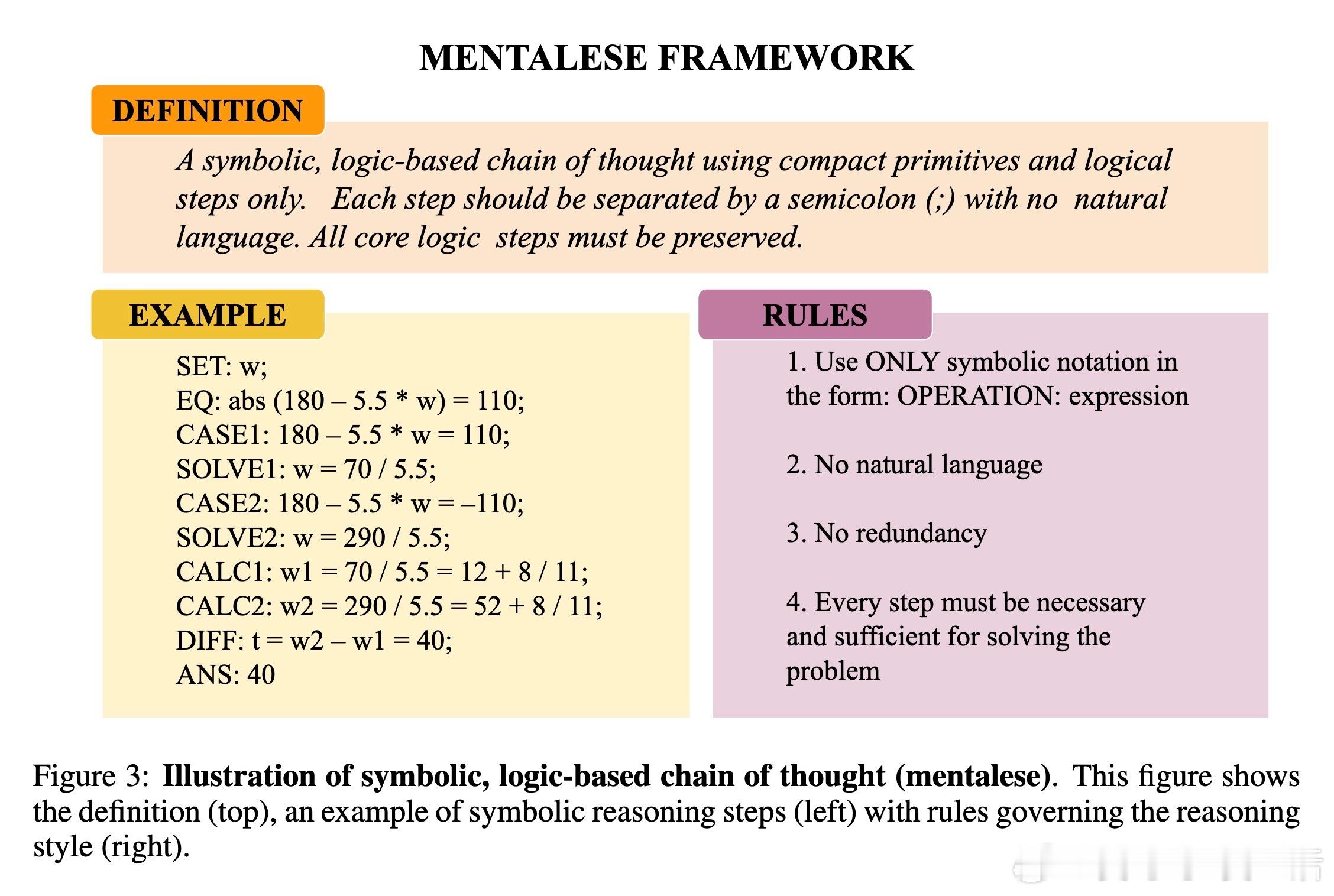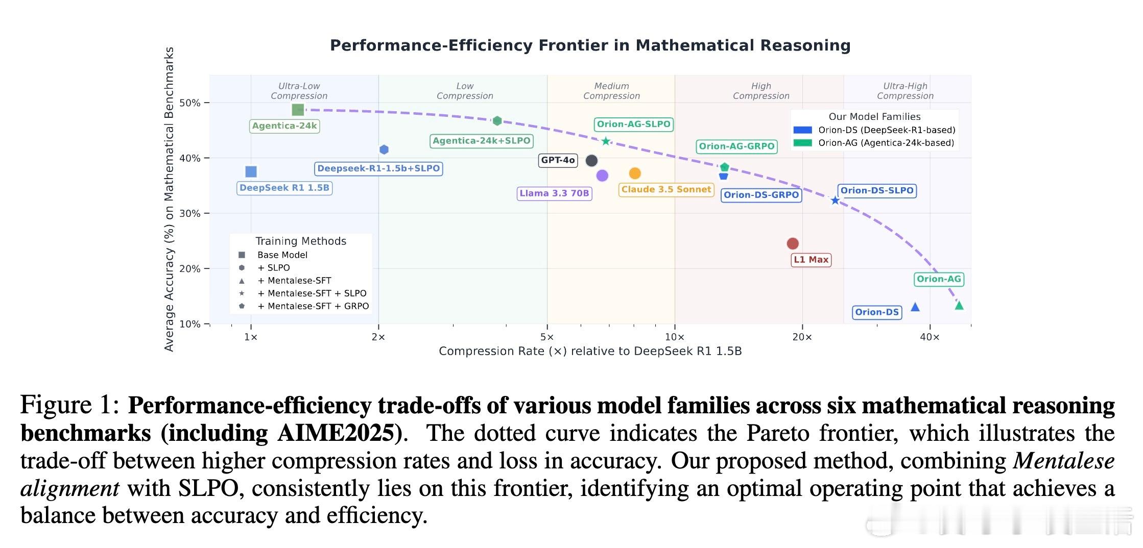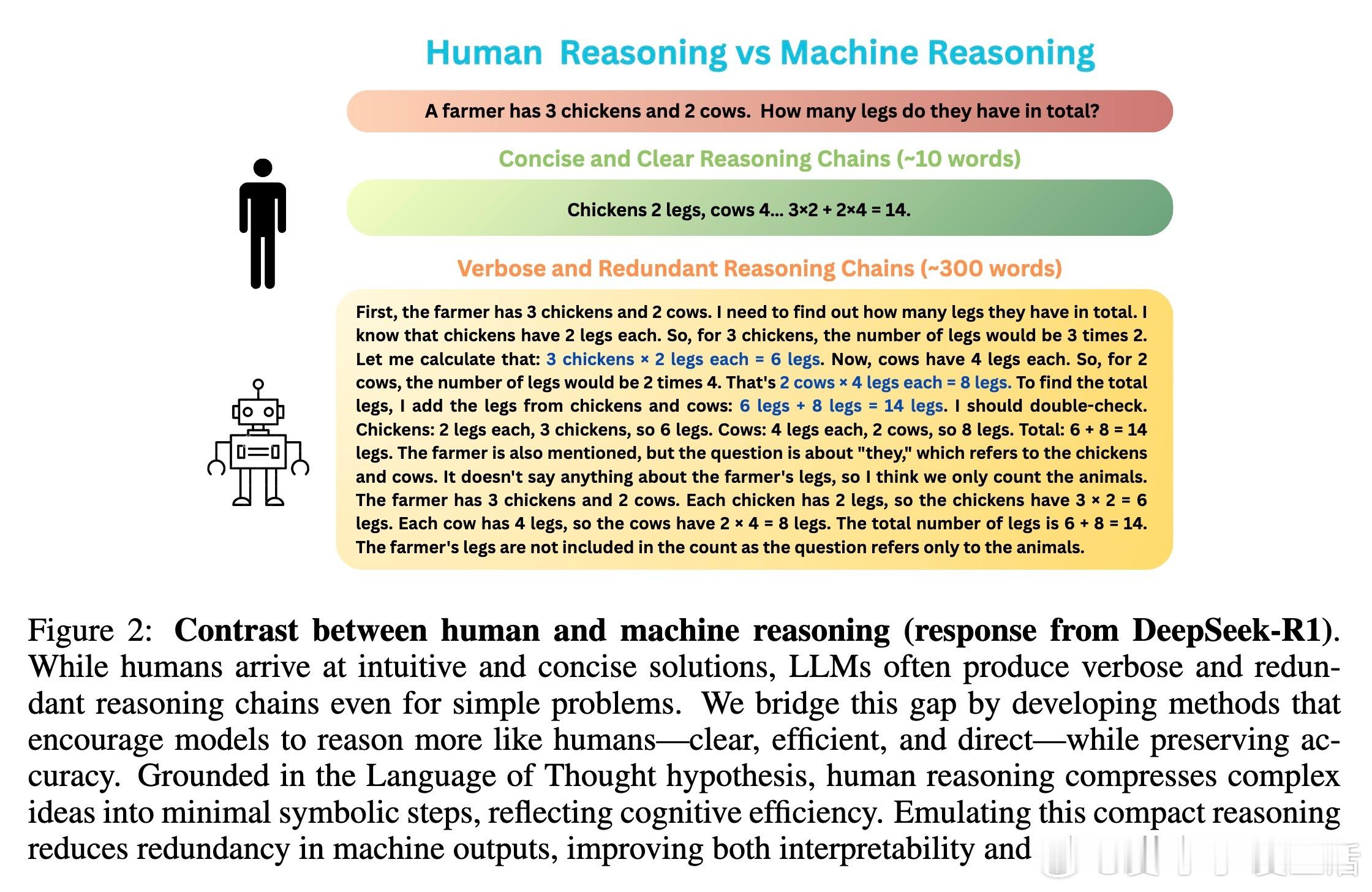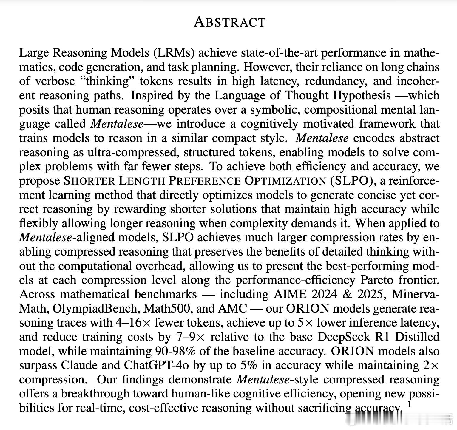 [LG]《ORION: Teaching Language Models to Reason Efficiently in the Language of Thought》K Tanmay, K Aggarwal, P P Liang, S Mukherjee [Harvard University & Hippocratic AI & MIT] (2025) 本文介绍了ORION,一种灵感源自“思维语言假说”(Language of Thought Hypothesis)的语言模型推理新框架。现有大型推理模型往往依赖冗长且重复的“思考”文本,导致推理效率低下且路径不自然。ORION通过引入“思维语言”Mentalese——一种紧凑且符号化的推理表达方式,实现了推理链条长度缩短10倍以上,同时保持90%-98%的准确率。核心创新包括:1. Mentalese:基于符号操作和表达式的形式推理语言,替代传统自然语言链式思考,极大压缩推理步骤,提升认知对齐和可解释性。2. 短长度偏好优化(SLPO):一种强化学习算法,智能权衡推理简洁性与正确性,不采用固定长度惩罚,而是通过奖励相对更短的正确推理路径,自适应地处理不同复杂度的问题。3. 训练流程:先通过监督微调使模型适应Mentalese格式,再通过带验证器奖励的强化学习(RLVR)恢复性能,避免了直接强化学习中常见的训练不稳定与推理路径冗长问题。4. 实验验证:在数学竞赛题库如AIME 2024/2025、Minerva-Math、OlympiadBench、Math500和AMC上,ORION模型产生的推理路径长度较基线DeepSeek-R1缩短4-16倍,推理延迟降低最多5倍,训练成本节约7-9倍,且准确率超越Claude和ChatGPT-4o达5个百分点。5. 通用性与稳定性:ORION在非数学领域(GPQA、LSAT、MMLU)同样表现出良好泛化能力,且训练过程更稳定高效,避免了直接SLPO训练时的崩溃现象。这项工作表明,推理无需冗长表达,符号化、结构化的“思维语言”结合智能优化策略,可以打造既高效又准确的推理模型。ORION为实时、高效、低成本的认知智能系统提供了新思路,特别适合对推理效率要求高的智能代理系统。全文详见:arxiv.org/abs/2511.22891代码即将开源于:网页链接——“真正的智慧,往往藏于简洁之中。推理的力量,不在于字数,而在于结构。”