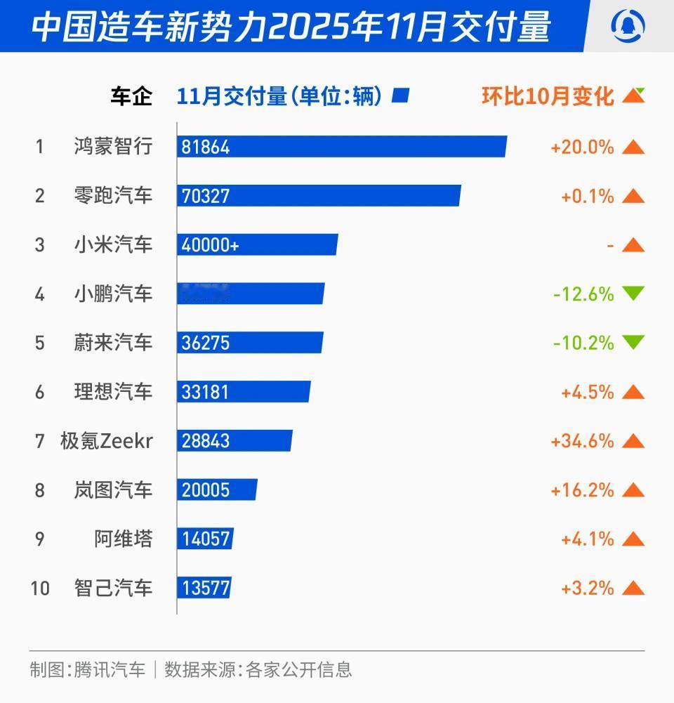 各家电车销售成绩单,有你在开的车吗?零跑汽车:全系交付创新高达70327台,领跑新势力 鸿蒙智行:全系车型交付新车81864台,同比增长89.61% 小米汽车:交付量持续超过4万台,全年预计交付超40万辆 岚图汽车:月交付量首次突破2万辆,年度销量目标完成率41.3% 智己汽车:月销量13577台,年度销量目标难达成 极石汽车:交付1452台,仅1款车型在售 理想汽车:月交付33181辆 蔚来汽车:月交付36275辆 小鹏汽车:月交付36728辆 极氪汽车:月交付63902辆 阿维塔:月销量14057辆 深蓝汽车:月销量33060辆