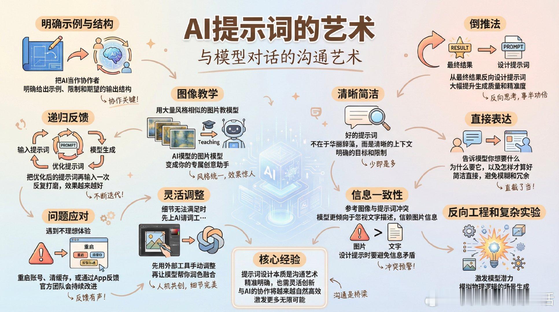 Gemini 3和Nano Banana Pro的实用提示词技巧:1. 把AI当协作者,明确给出示例、限制和期望的输出结构。倒推法——从最终结果反向设计提示词,能大幅提升生成质量和精准度。2. 利用递归反馈,把模型帮你优化后的提示词再输入一次,反复打磨,效果越来越好。3. 用大量风格相似的图片“教”模型你的审美,再让它创造匹配的提示词,变成你的专属创意助手。4. 好的提示词不在于华丽辞藻,而是清晰的上下文、明确的目标和限制。告诉模型你想要什么,为什么要它,以及怎样才算好,剩下的交给它。5. 简洁直接,告诉模型你期望的输出,避免模糊和冗余。6. 如果遇到不理想的体验,比如图像生成异常或功能失效,建议先重启账号、清缓存,或通过App反馈,官方团队会持续改进。7. 当模型某些细节无法满足时,可以先用外部工具手动调整,再让模型帮你润色融合,灵活应对限制。8. 参考图像与提示词描述冲突时,模型更倾向于忽视文字描述,信赖图片信息。这提醒我们设计提示时要避免信息矛盾。9. 反向工程和复杂实验式提示能激发模型潜力,比如模拟物理逻辑的场景生成,实现惊艳效果。10. AI提示词的艺术在于与模型对话,理解它的“思路”,而非死板命令,真正做到“心有灵犀一点通”。这些经验告诉我们,提示词设计本质是沟通艺术,既要精准明确,也需灵活创新。未来,随着模型不断进化,我们与AI的协作将越来越自然高效,激发更多无限可能。原文:x.com/GeminiApp/status/1995585884142665938