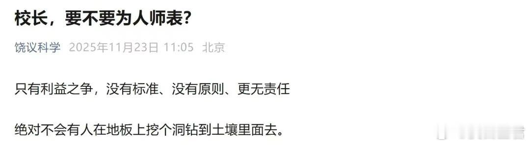 饶毅炮轰院士评选“潜规则”饶毅最近火力全开,公开质疑院士评审。这架势,像是拿鸡蛋碰石头,又像是堂吉诃德冲向风车。但饶毅的质疑,会改变当选院士的结果吗?不会,绝对不会。人家能评上,程序上肯定天衣无缝,大佬们严肃认真地投了票,达成了高度共识。这时候你要翻盘,置投票的院士于何地?置评审程序的权威于何地?更重要的是,置那些萝卜拔出后带的泥于何地?所以,结果必然毫无悬念:尘埃落定,落袋为安。人家已经上桌分蛋糕了,你这时候喊这蛋糕有毒,那不是让所有人下不来台吗?于是,团结压倒一切,稳定高于一切,错了也就将错就错。这不叫坚持真理,这叫维护体面。饶毅这下陷入了一个精妙的陷阱:说轻了,等于给新科院士挠痒痒,反而成就一段连饶毅都挑不出毛病的佳话;说重了,文章能活着出小区算我输,更有人要嘀咕:这老饶是不是想红想疯了?更诛心的是,饶毅每质疑一次,就像祥林嫂多念叨一回我真傻,我以为行政人员该做榜样……起初还有人同情,念叨多了,就成了笑话。小丑自然没人爱,怪兽自然要被打。你看,他们说要带着光驯服每一头怪兽,他们说要缝好你的伤,唯独没人爱那个说真话的小丑。但我依然要为饶毅的孤勇喝彩。他让国人看见,中国知识分子还没死绝。十四万人齐解甲,尚有一人是男儿。有些鸟儿的宿命,就是不能沉默。饶毅这只不合时宜的鸟,至少证明了学术圈还有声带,还有脉搏。他让行政资源挤占学术名额这个话题,从潜规则变成了明规则。千万网友一边倒的支持,形成了强大的社会共识。这共识就像一把悬在头顶的剑,让那些暗箱操作的人,从此夜不能寐。孔子作《春秋》而乱臣贼子惧,饶毅作檄文而学术官僚惧,庶几近之。他精准地划出了灰色地带,把权力渗透评选跨领域避战为评而研这些脓包,一个个挑破。唯有把脓血放干净,制度才能真正长出健康的皮肉,让顶尖原创者不再被卡脖子,而是能挺起腰。当然,理想很丰满,现实很骨感。某985高校举报学术不端的老师,直接不续聘;高中生首席科学家,靠学生举报才翻车。老师早发现了,谁敢发声?那个不顾大局的帽子,谁戴得起?所以你看,我也陷入饶毅式的两难:夸他夸轻了,对不起这份孤胆;夸他夸重了,又怕被重点关照。但我最后还是决定写下这些字,因为如果连键盘都不敢敲,我们这一代人,还有什么脸面,去嘲笑那个挡车的螳螂?螳螂虽弱,尚知车之不义;我等若默,不如抱薪而亡。