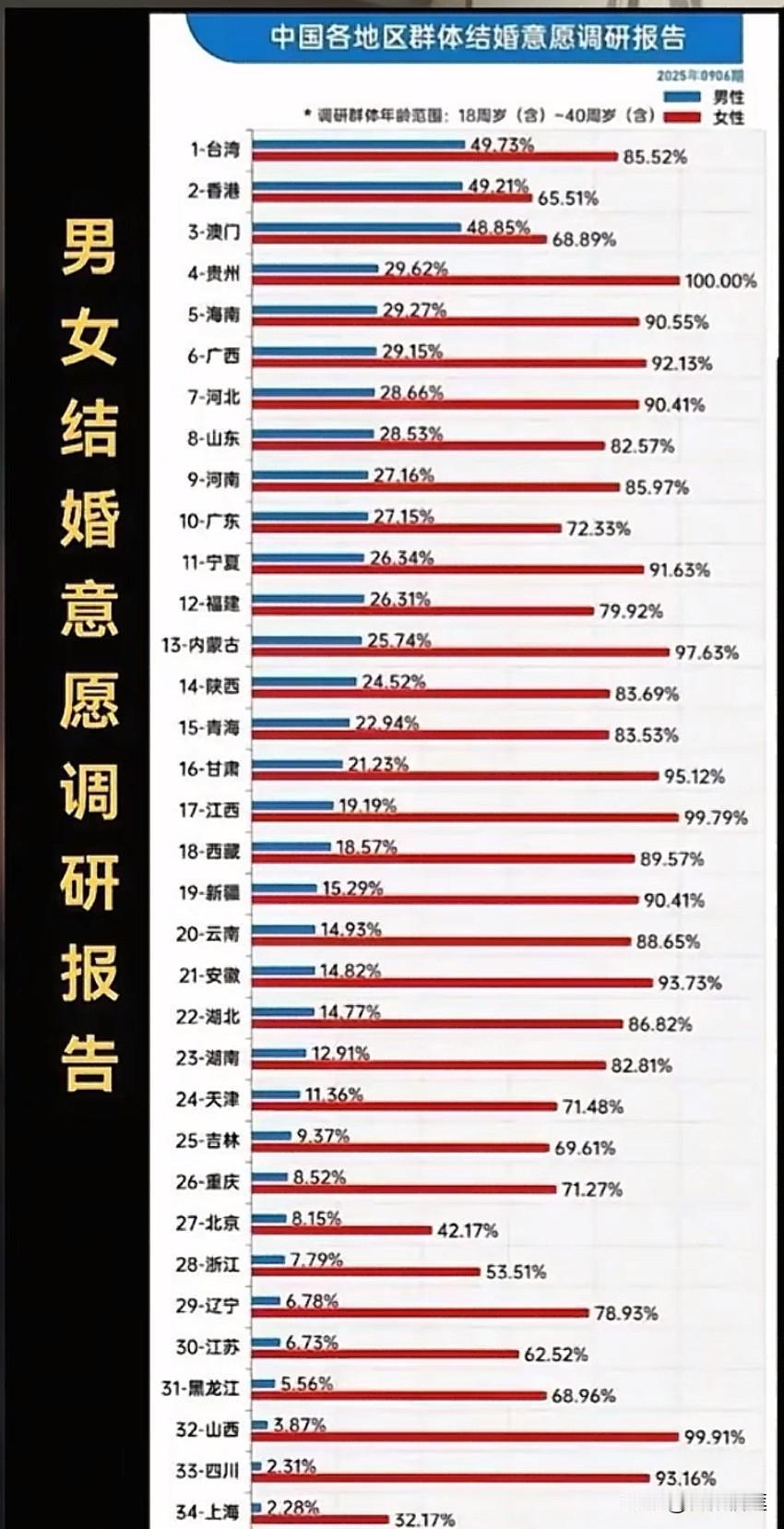 知道下图啥意思吗? 在当今中国,男女结婚意愿显示:每100对适龄男女当中,结婚意愿最强的男性来自台湾,达到49.73%,也就是说将近一半的男性愿意结婚。而结婚意愿最弱的男性来自于上海,只有2.28%。是不是很意外?是不是很无奈? 整个图表很明显告诉我们,女性的结婚意愿极其强烈,每个省的比例几乎都是男性的几倍或者几十倍,为什么? 同时男性的结婚意愿为什么如此低下? 男人没钱选择不婚,女人爱钱又赚不到钱而选择婚姻。 看来只有台湾的男性活得比较滋润。 是不是这样的?