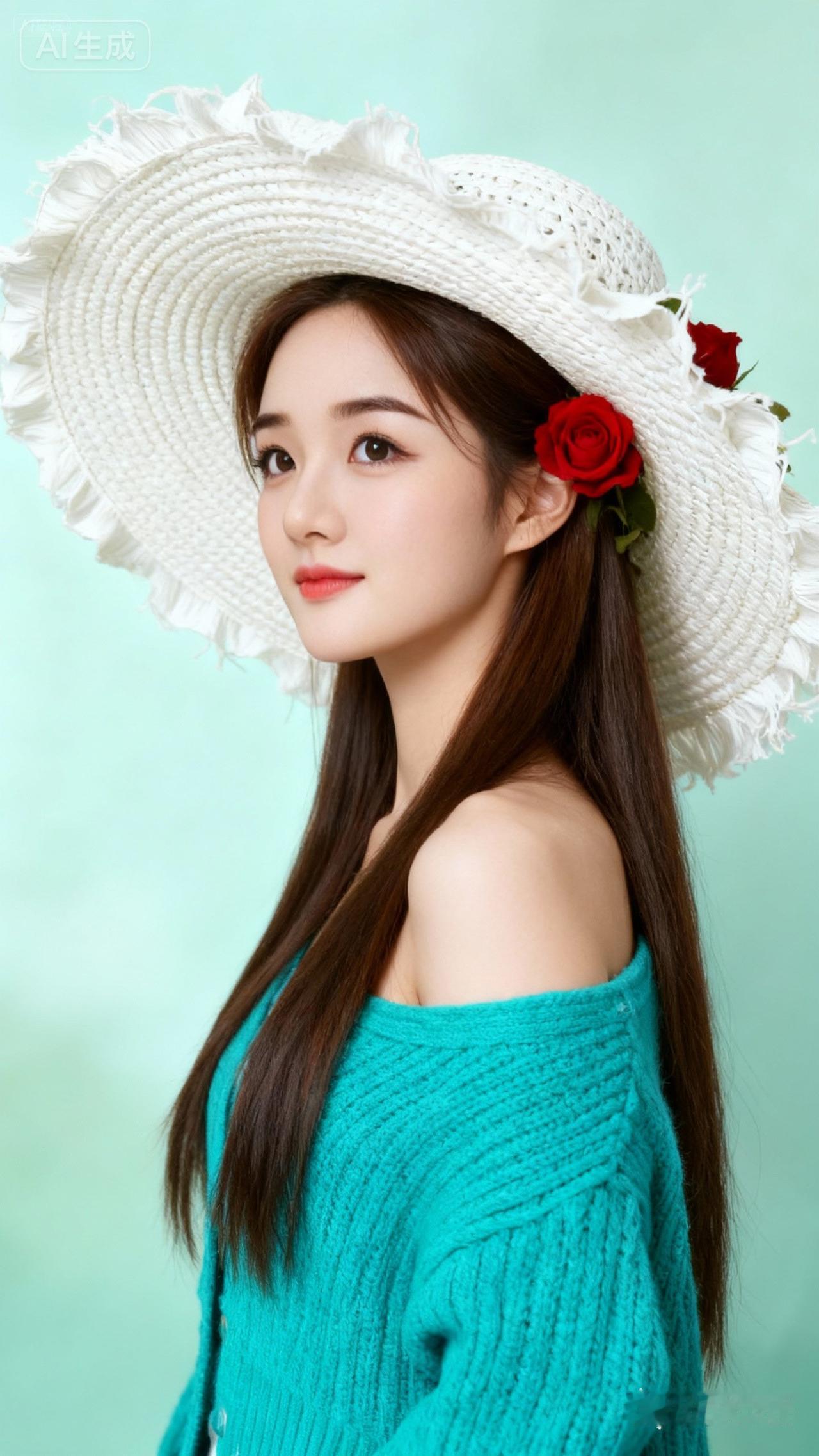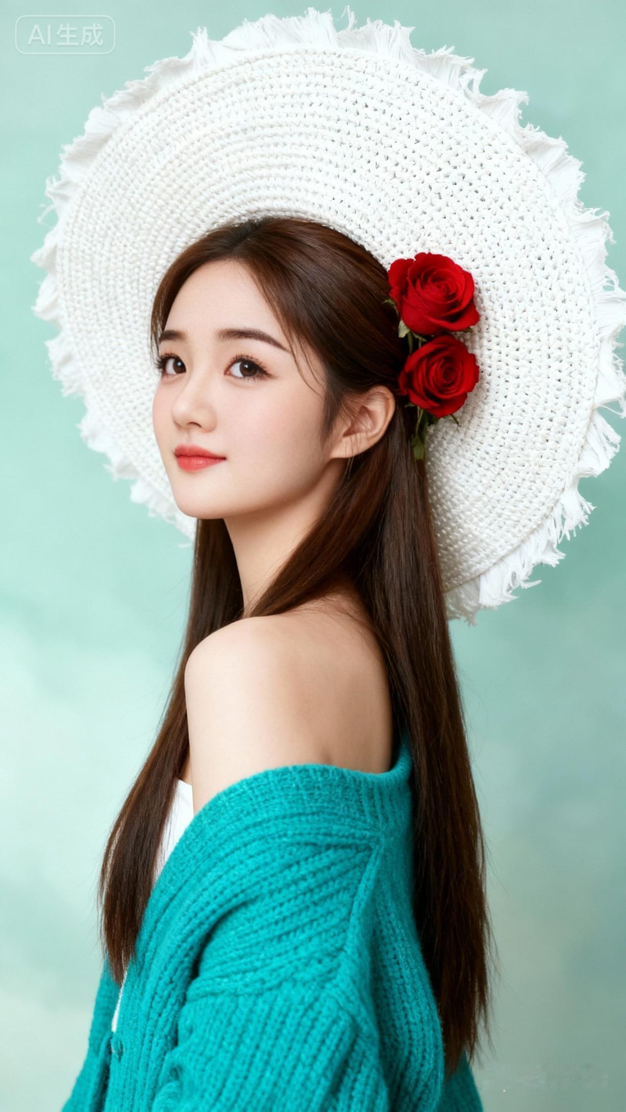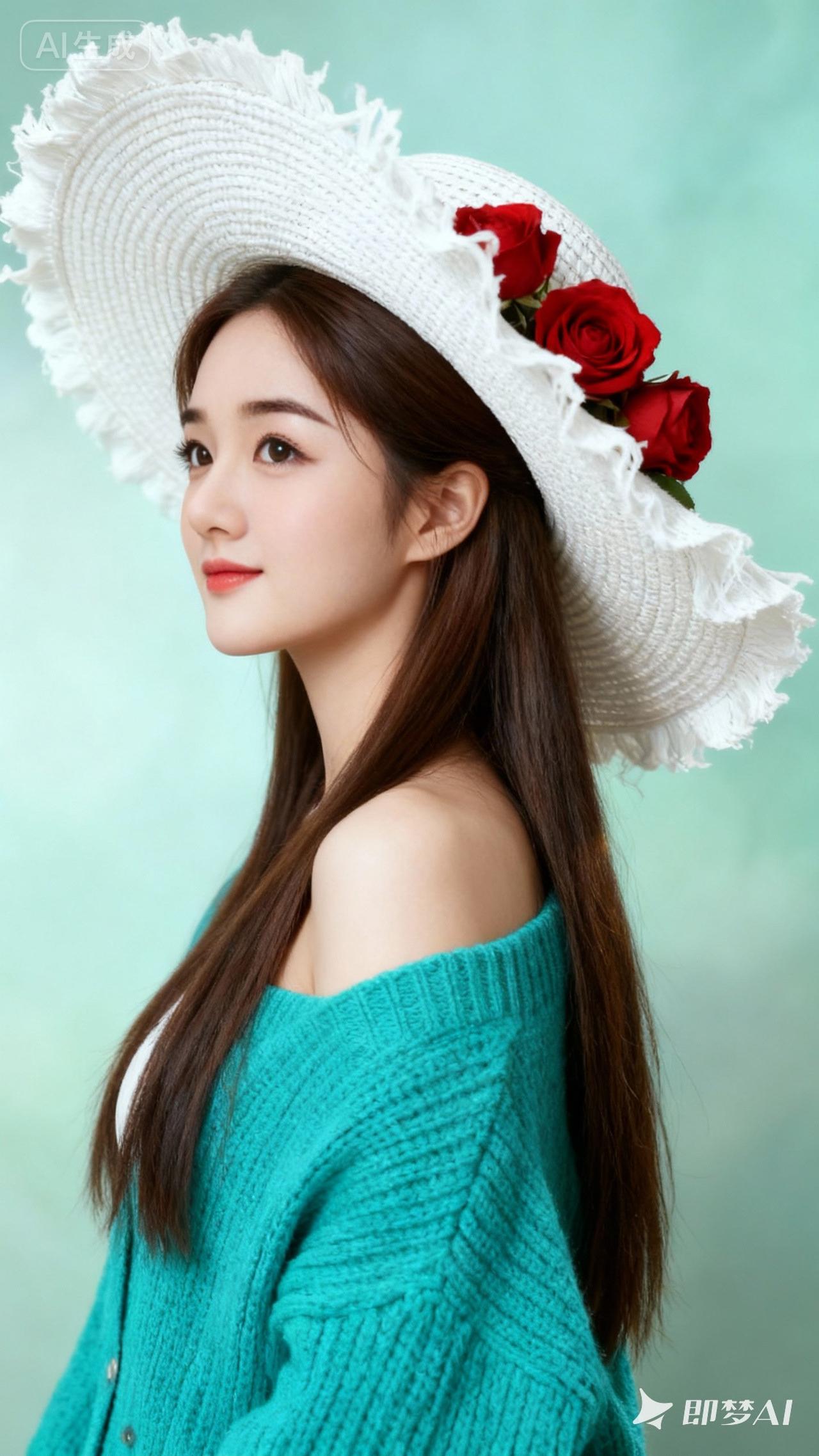 现代美女,容貌俱佳,尤其是侧面形象更好,长发,诱人的眼神,红红的嘴唇,穿露一个肩青色针织开衫,头戴大型白色编织圆帽,帽缘层次不齐,帽缘处有朵红色玫瑰花,美女侧立(位于画面在边)