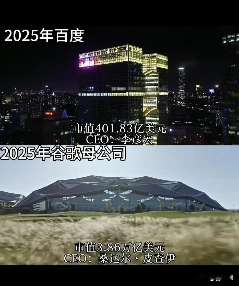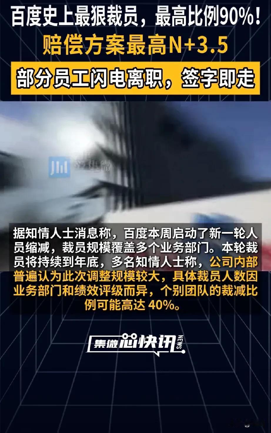 传百度大裁员,15年后和谷歌的差距一落千丈,市值不及谷歌零头,有时候优越的成长环境和垄断的土壤才是没落的根基,希望其他企业不要走一样的命运。2011年左右,百度市值570亿美元,那时候谷歌市值2000亿美元,约是百度4倍。 然而2025年左右,百度市值不增反降只有约400亿美元,2024年营收仅180亿美元,净利润为32亿。而谷歌当前市值已达到38600亿美元,是百度的近100倍,2024年全年营收3500亿美元,净利润1100亿美元。 有传言百度2025年三季度出现亏损,因此导致将实行大裁员,给予员工的补偿是N+3.5,还是很良心的方案。当年风起云涌的BATJ(百度、阿里巴巴、腾讯、京东)第一个倒下的可能是百度了,虽然京东2024年利润仅90亿美元,但是营收达到1588亿美元。 2025年谷歌市值是百度100倍 传百度将大裁员补偿方案为N+3.5 消息称百度三季度财报亏损
