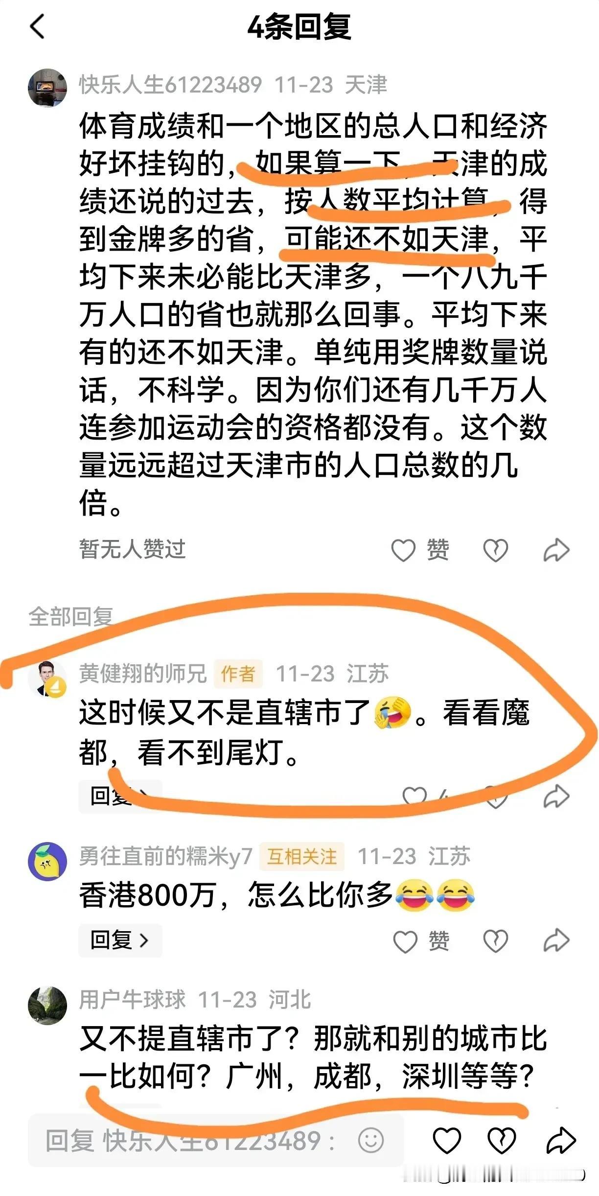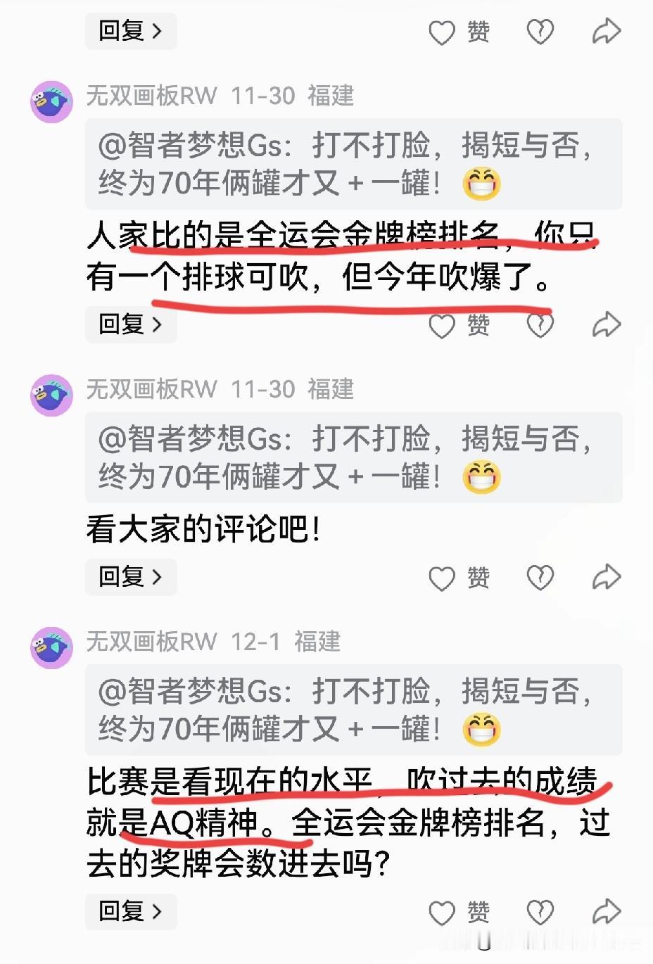 [不承认事实上的落后,反而用各种比说来强词夺理,掩人耳目求心慰,真是不可理喻] [玫瑰][玫瑰]竞技体育比的是现在,现在不行,脑子里还停留在过去,嘴上还在喋喋不休的吹过去的成绩,这是一种什么精神?这是一种什么心态,典型的阿Q精神和落后被打后, 找理由来掩饰掩盖差劲的表现。 一域号称运动之都,可在全运会上竞技体育比拼中排名19,名不副实,名落孙山。一城号称排球之城,可在全运会排球八个项目上,都是兵败如山倒,0奖与无人问金。这都是事实。 可紫人们却不这么看,他们歪理邪说特别多。你若讲金牌数排名,他来讲人口基数,讲金牌的人口平均数。你反驳说:讲人口多,印度人口世界最多,为什么金牌在亚运和奥运会上比人口少的许多国家的金牌少?紫人们哑囗无言。 你进而反驳说:讲人口少,香港人口只有750万人,比天津1300多万少很多,但在全运会上的9金也比津6金多3金。对此,津粉又有话说:说香港人有很多都长着一张欧洲脸(这也间接承认了自己的脸不行,没有欧洲脸厉害)。于是有球迷朋友反问说:排超联赛天津外援的脸是哪里的脸(欧洲脸、美国脸、巴西脸、土耳其脸、日本脸)?津粉顿时哑口无言。[笑哭][笑哭] 脸最怕的是什么?最怕被打脸,最怕不要脸了。