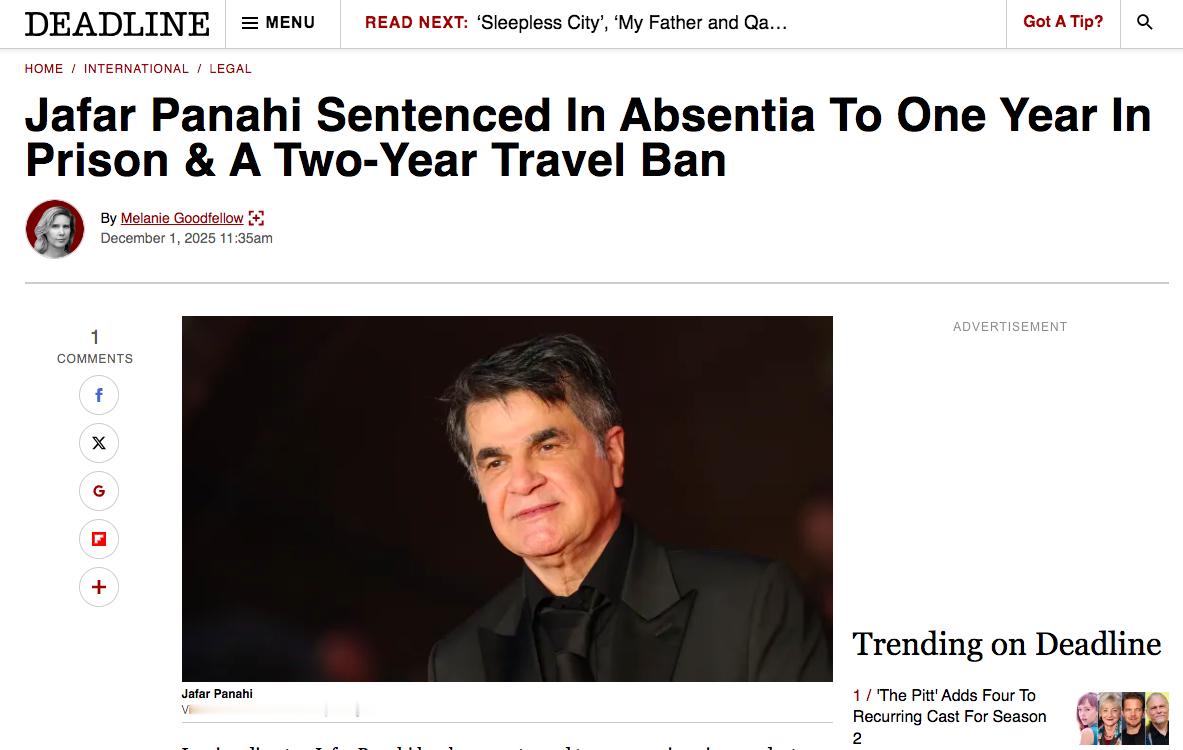 TNABO 《普通事故》编导贾法·帕纳西被伊朗当局判处一年监禁,两年禁止离境,禁止加入任何政治或社会团体判决理由是“参加反政权宣传”,但是伊朗当局并未给出具体指控,也没有说明哪些言行属于反政权。从以往历史来看,此次判决可能跟今年荣获戛纳金棕榈奖的电影《普通事故》有关。这部影片改编自帕纳西先前两次入狱经历,讲述一位曾被不当指控为政治犯的男子,意外遇到曾在监狱中折磨自己的审讯人员,于是跟身边各持己见的伙伴们联手绑架对方,针对该杀还是该原谅的安排展开了辩论。目前帕纳西人在境外,参加《普通事故》的颁奖季宣传活动。他上一次入狱是2023年,被关押了七八个月,在经历绝食抗议后得到释放。