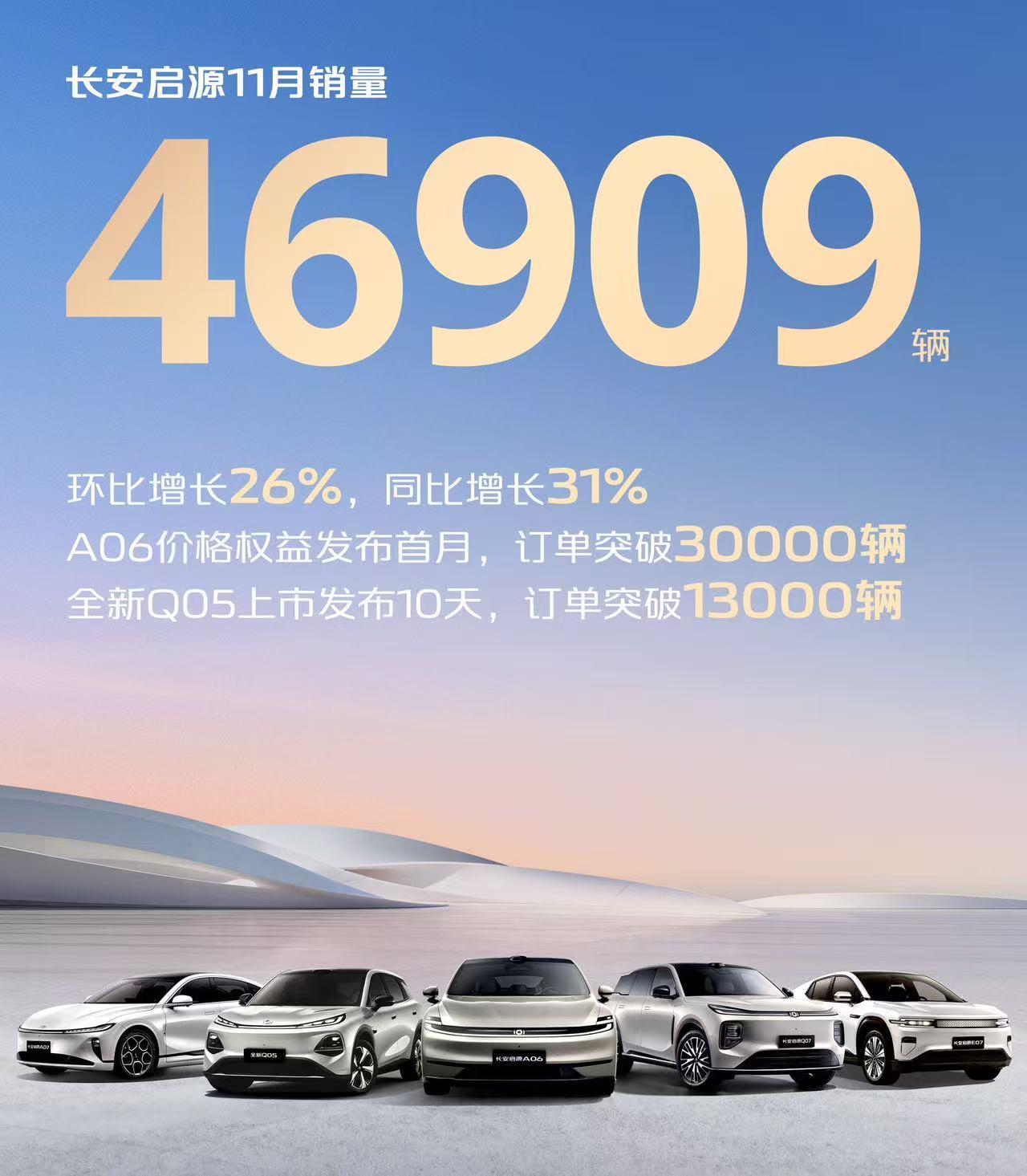 【创新高!长安启源11月销量超4.6万辆】日前,长安启源官宣:11月销量46909辆,环比增长26%,同比增长31%。其中,长安启源Q07单月销量9126辆。值得一提的是,长安启源A06首月订单突破3万辆,长安启源全新Q05上市发布10天订单突破1.3万辆!未来随着两款新车订单释放,销量有望再上一个台阶。【来自懂车帝车友圈】