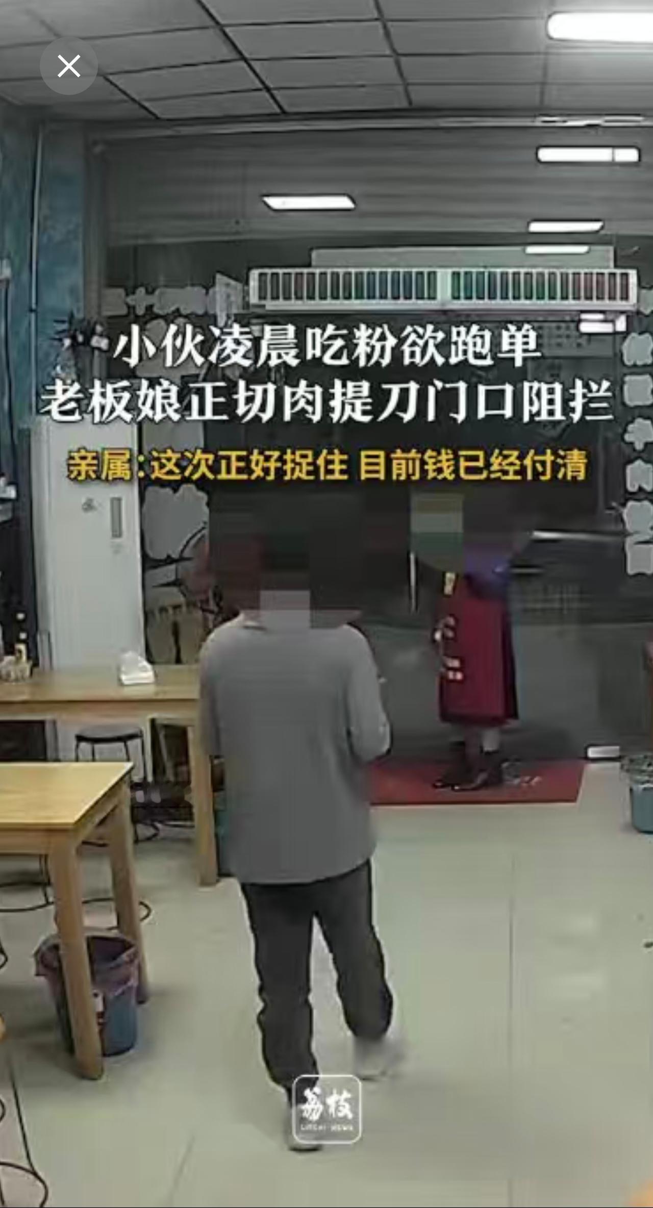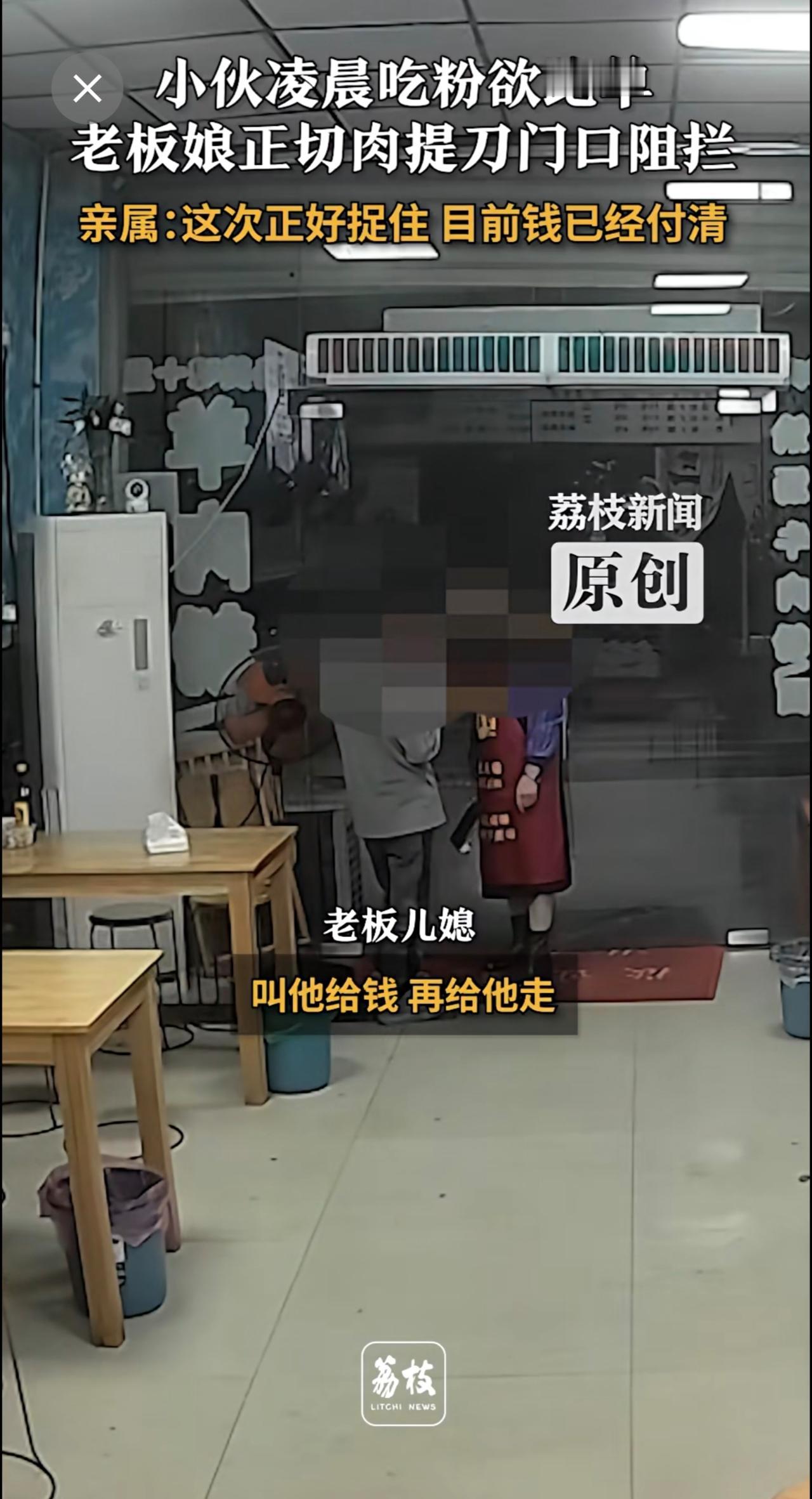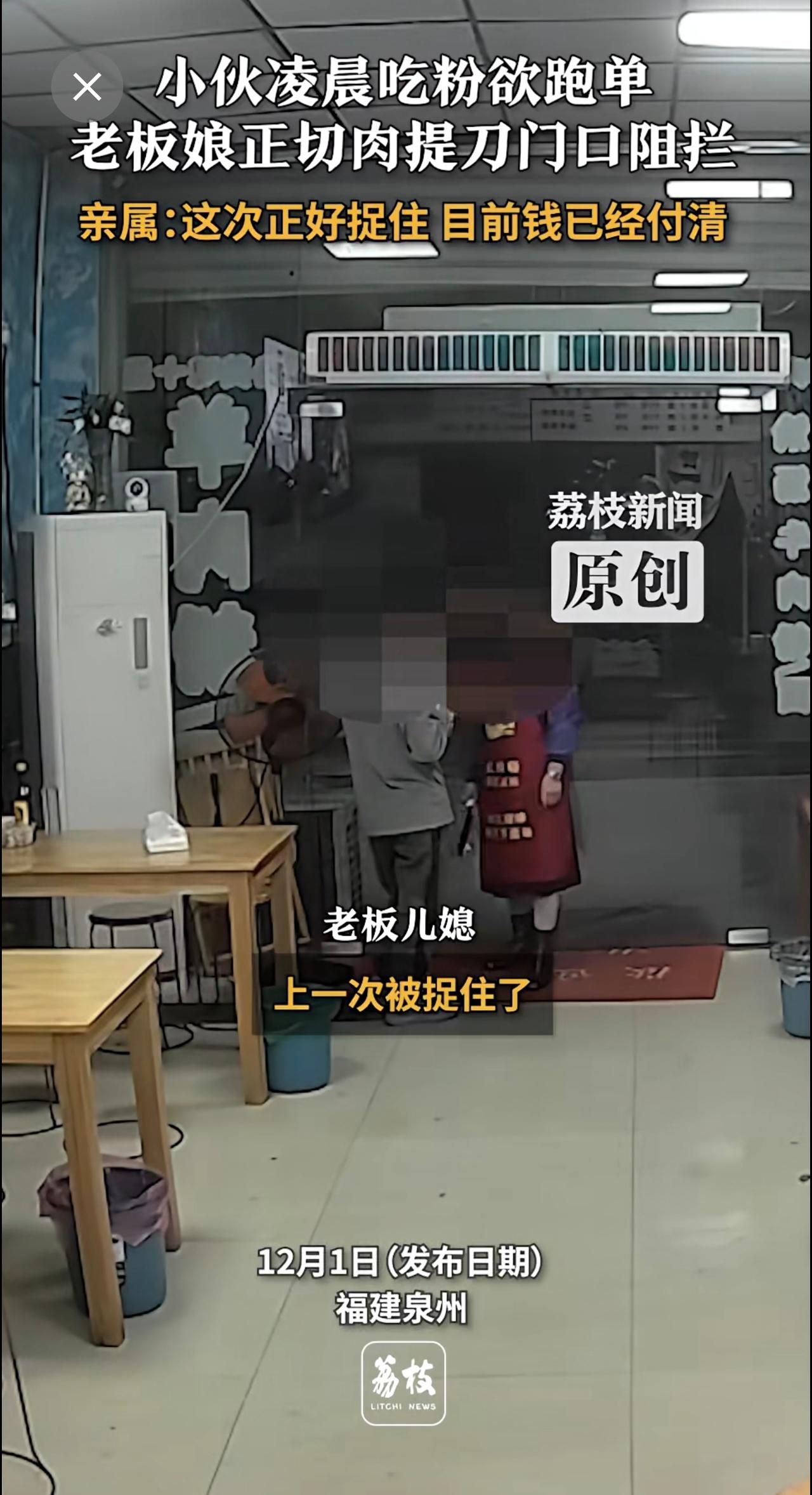 小伙欲跑单老板娘正切肉提刀阻拦。 亲属:这次正好捉住 目前钱已经付清