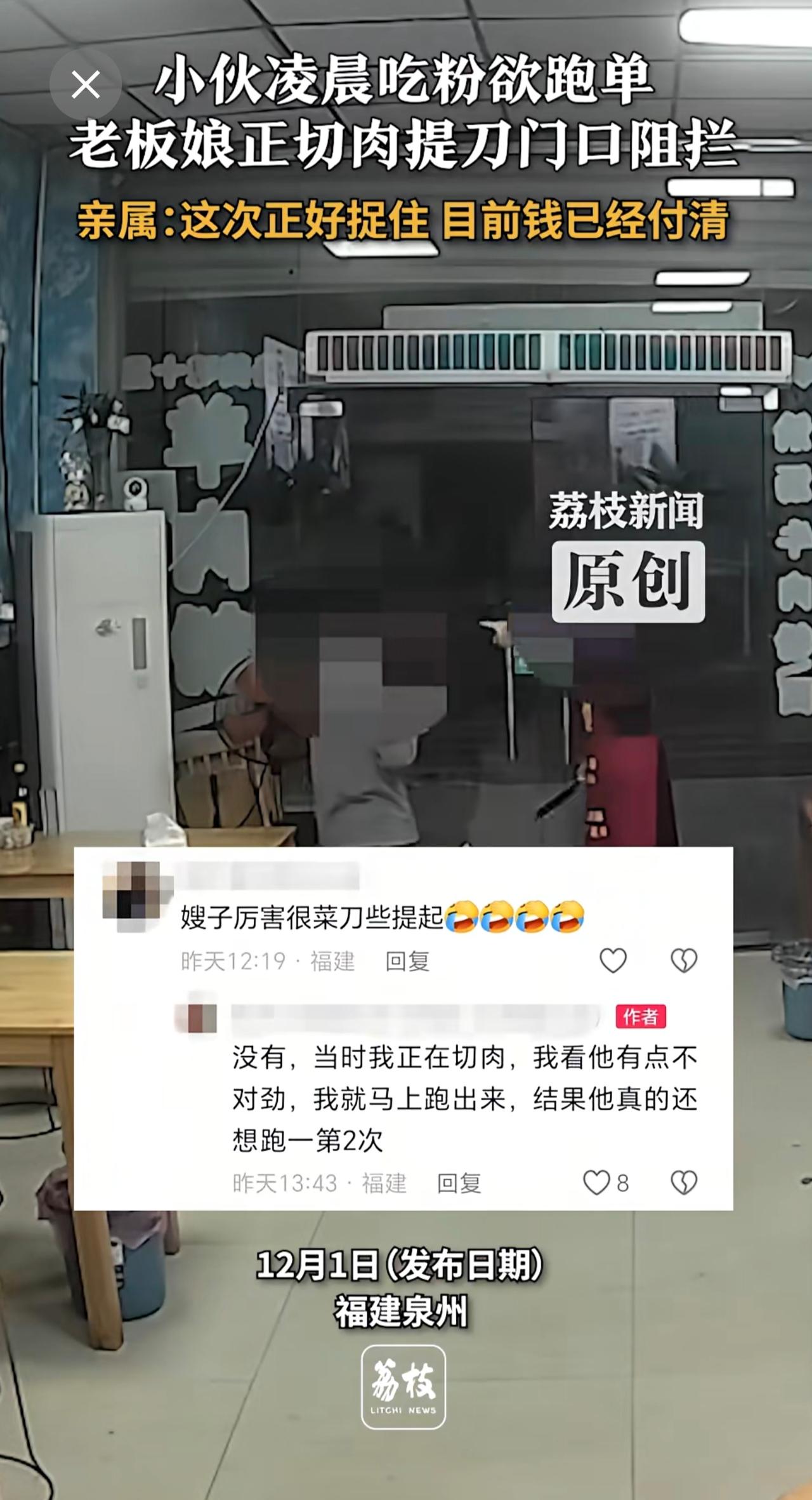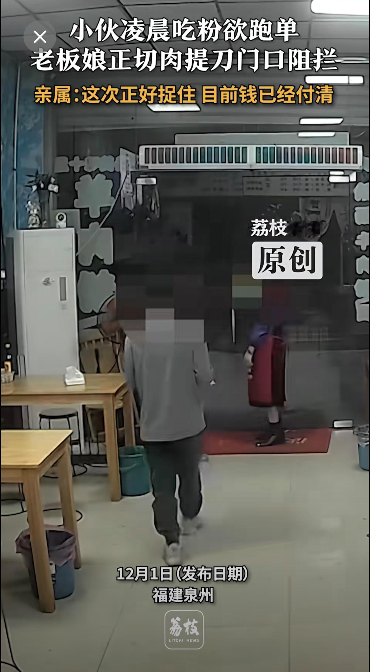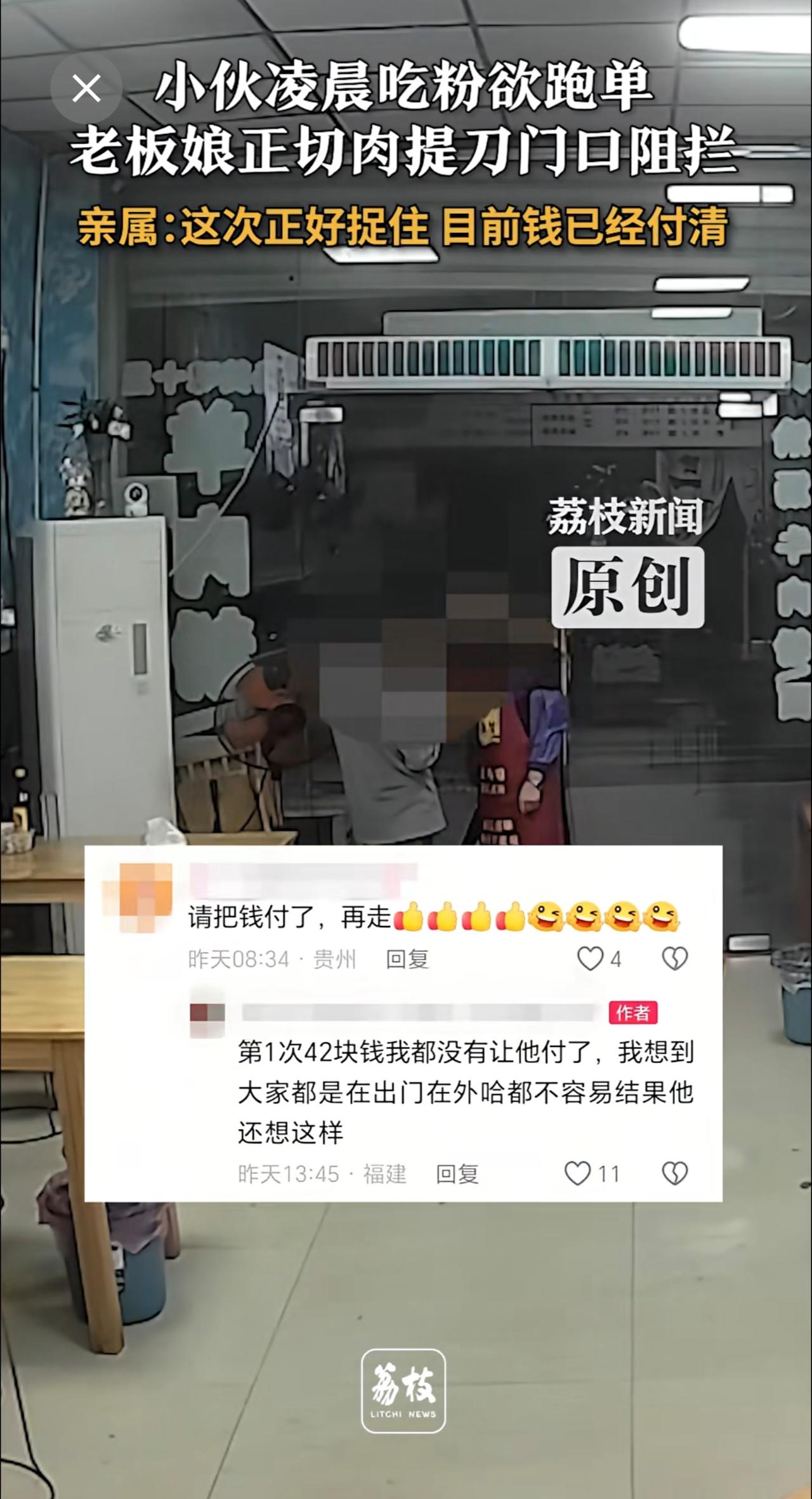 小伙欲跑单老板娘正切肉提刀阻拦。 亲属:这次正好捉住 目前钱已经付清