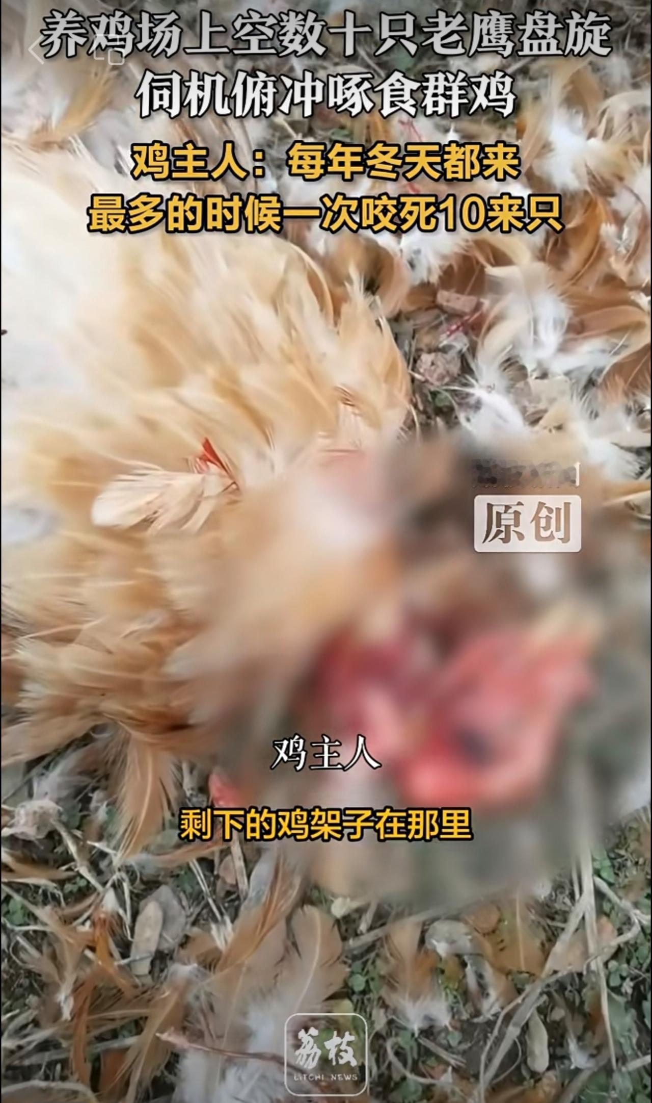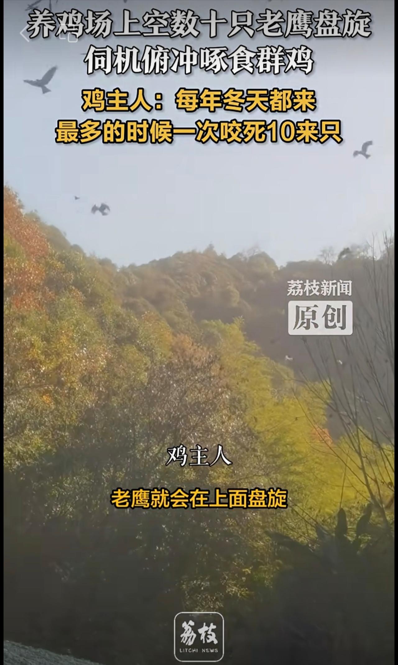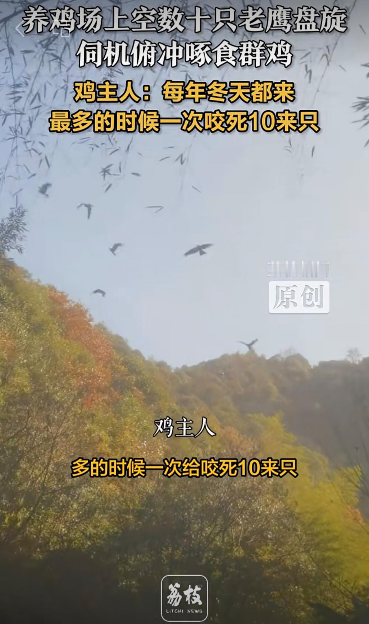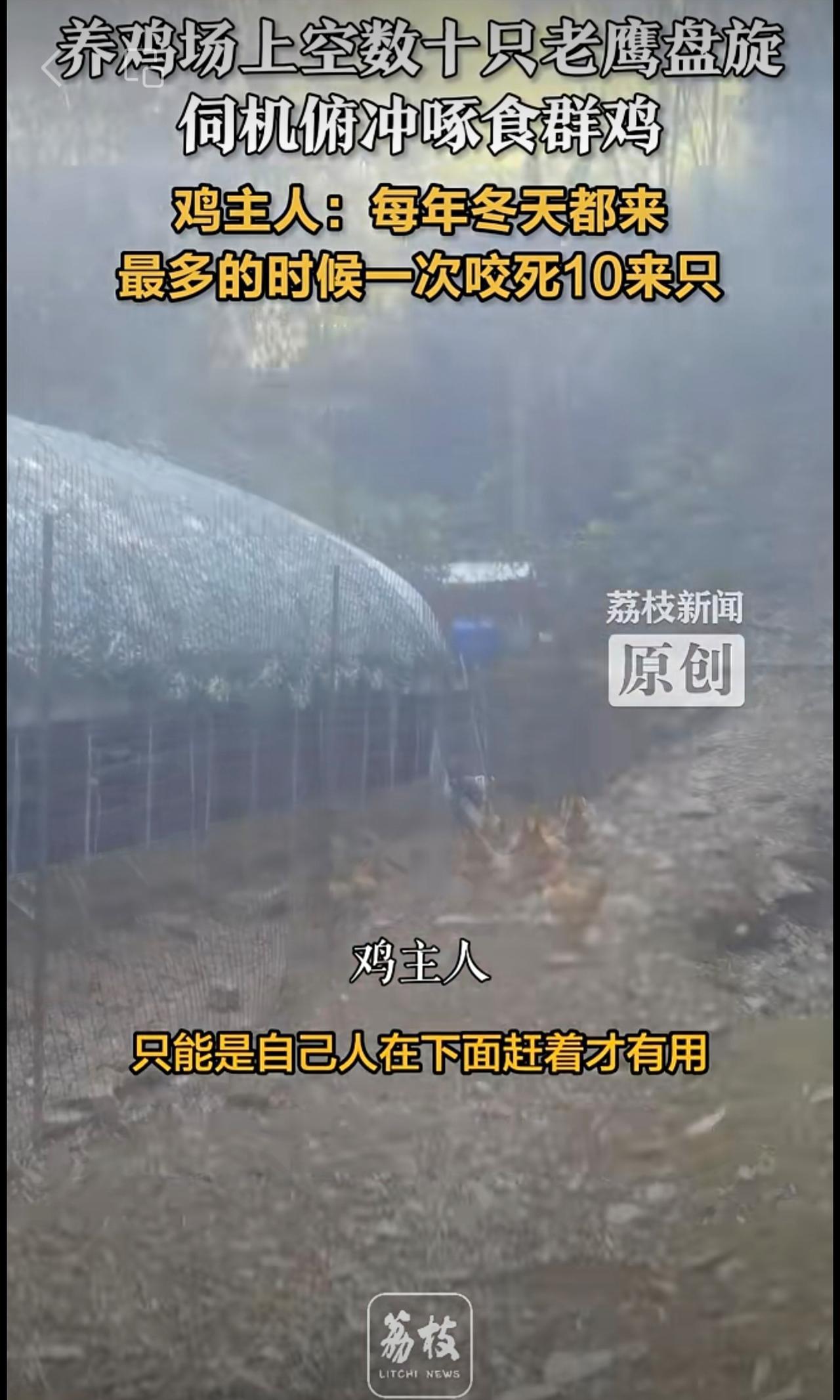 养鸡场上空数十只老鹰盘旋伺机啄食群鸡 鸡主人:每年冬天都来,最多的时候一次咬死10来只。