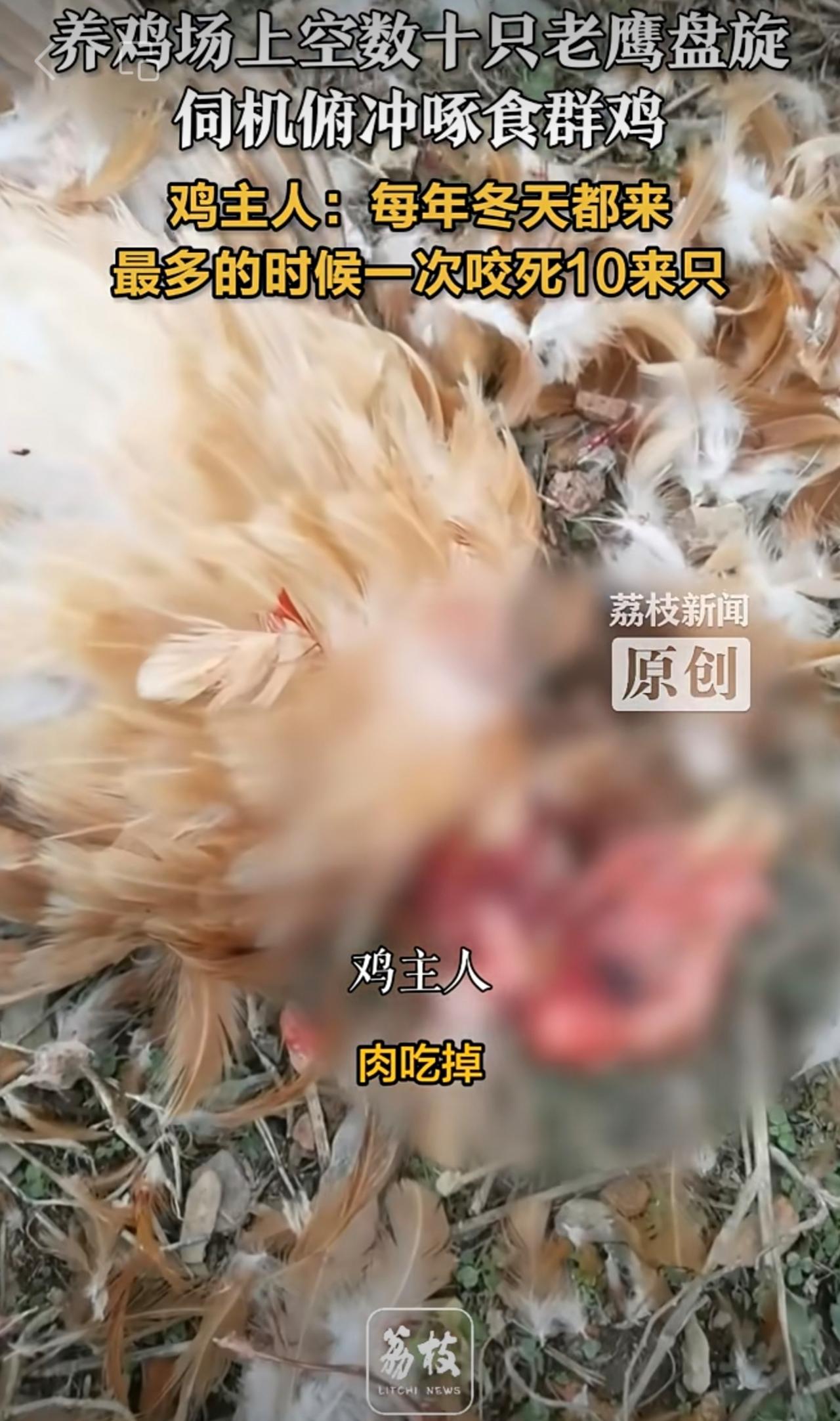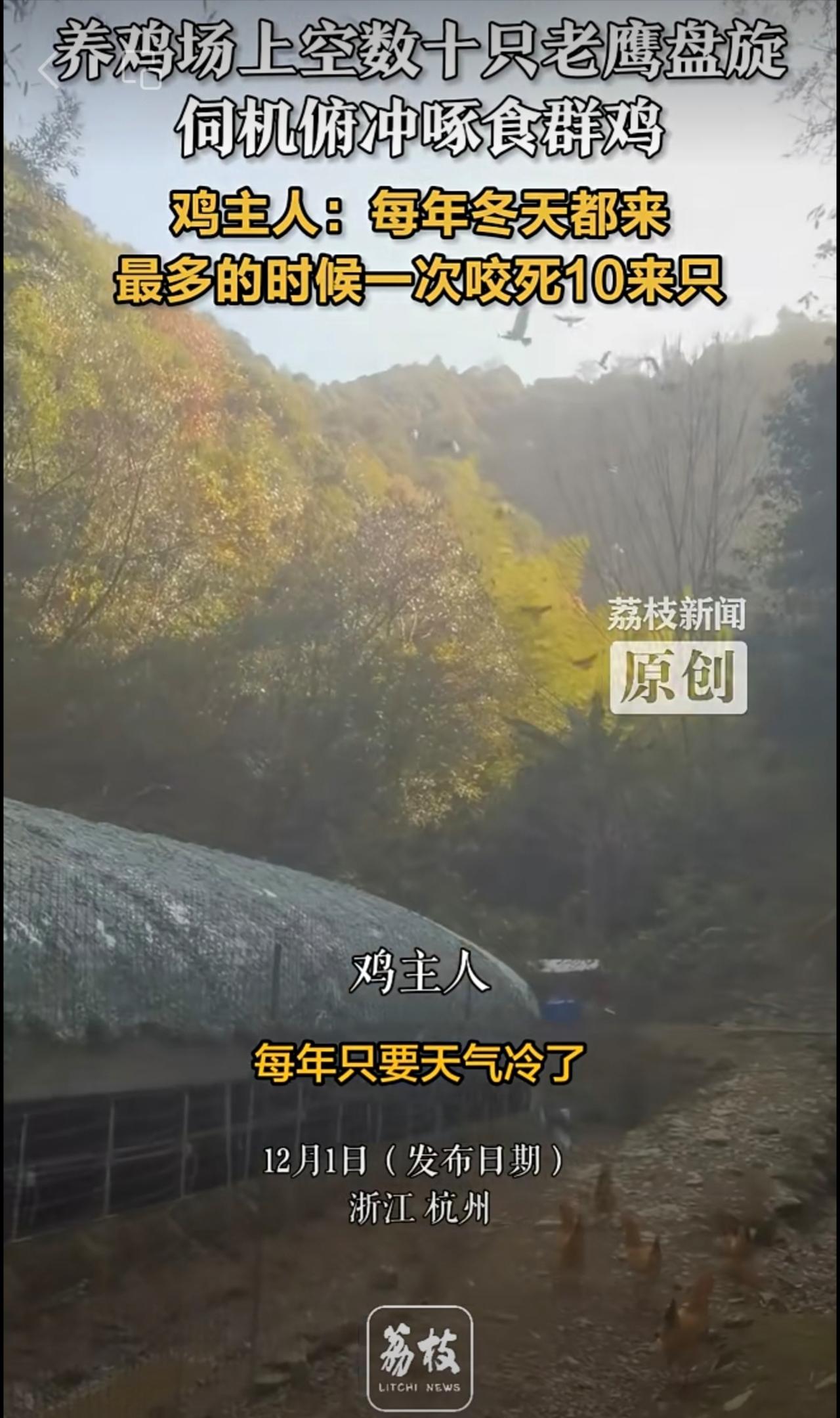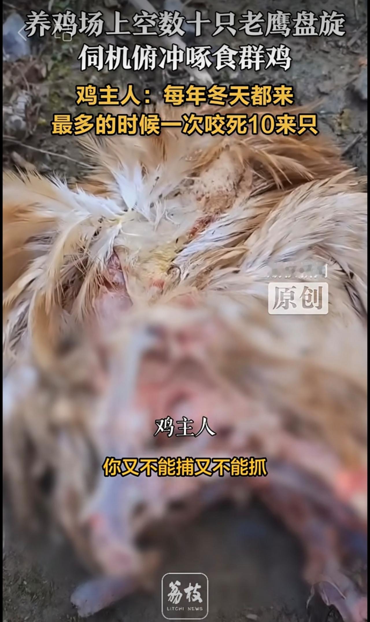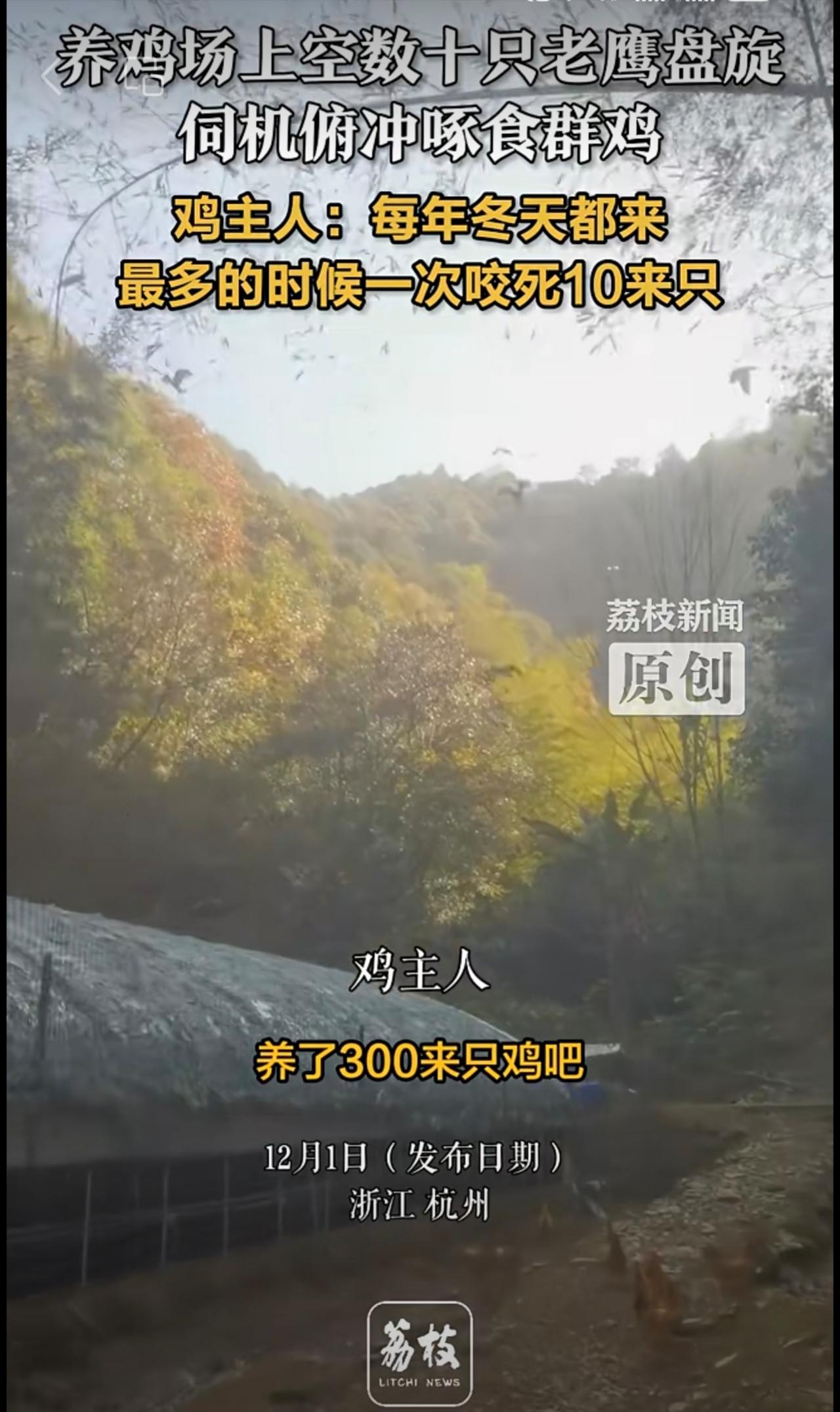 养鸡场上空数十只老鹰盘旋伺机啄食群鸡 鸡主人:每年冬天都来,最多的时候一次咬死10来只。