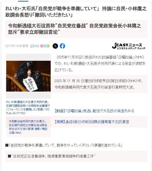 11月30日,日本的NHK电视台播出了一档讨论节目,节目中多名在野党议员严厉批评了首相高市早苗的涉台言论。 高市早苗此前在公开场合提到,如果中国对台湾采取军事行动,日本应该予以回应,这一言论引起了日本国内外的广泛关注和争议。 高市早苗的言论立即引发了政治风暴,她的表态在日本国内的执政党自民党内也引起了不少波动。 自民党内部的高官在面对这一言论时表现出明显的不满,迅速做出了反应,自民党党内的多位高层人士表示,高市的言论过于激进,可能导致日本在国际社会中陷入更大的政治风险,呼吁她立即撤回这番言论。 与此同时,在野党议员对高市的言辞提出了严厉的批评,认为高市不仅言辞激烈,而且忽视了日本在处理与中国的外交关系时需要保持的谨慎态度。 一位在野党议员指出,日本应当专注于通过外交手段解决问题,而非采取过于对立的立场。 他们认为,言辞过激的言论不仅会加剧地区紧张局势,还可能影响日本的经济和外交稳定。 高市早苗此番言论的背景与台海局势密切相关,近年来,台海问题一直是东亚地区的重要议题,尤其在中国大陆与台湾之间的关系日益紧张的背景下,日本的立场成为外界关注的焦点。 作为日本自民党的一员,高市早苗的言论反映了日本国内部分政治人物在这一敏感问题上的立场和态度。 虽然自民党高官的迅速反应表明,党内并非所有人都支持高市的立场,但这一事件无疑对日本的政坛造成了不小的震动,也再次提醒了各方在处理涉台问题时的敏感性和复杂性。 以上都是个人观点,对此您有什么不同的看法,可以在评论区留言讨论!!!
