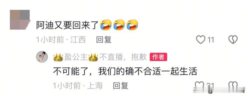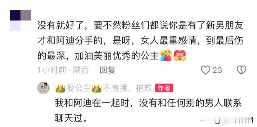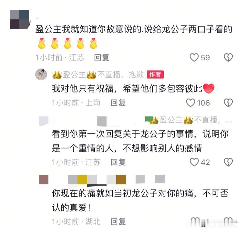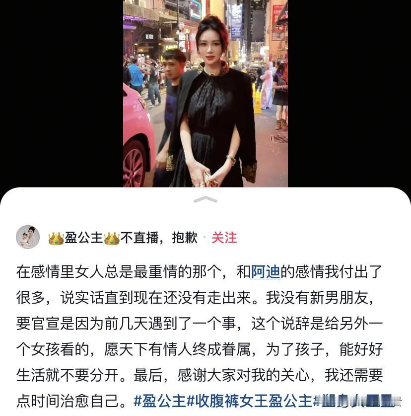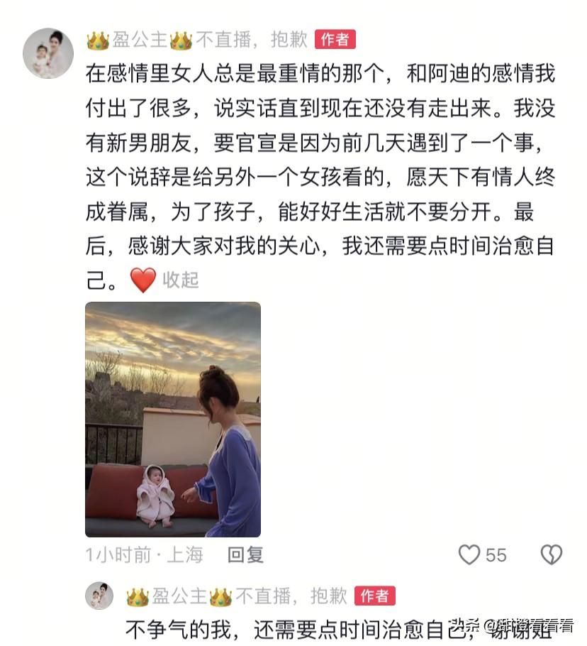盈公主本来说好今天直播宣布一件大事,却没有直播,原来她说官宣是故意说的,她之所以这样说是说给一个女孩听的,她也没有所谓的新男朋友,一米九的新男友也是她故意说的。 她说还没有从上一段感情里走出来,还需要一点时间,她之所以说官宣一件事,是因为她前几天遇到一件事,说辞是给另一个女孩看的,她希望他们为了孩子不要分开。 原来,这件事情的起因是,盈公主的前男友跟现任老婆突然分手,里面牵扯进了盈公主,盈公主无辜躺枪,为了让他们俩解除误会,盈公主还劝前男友,改改脾气。