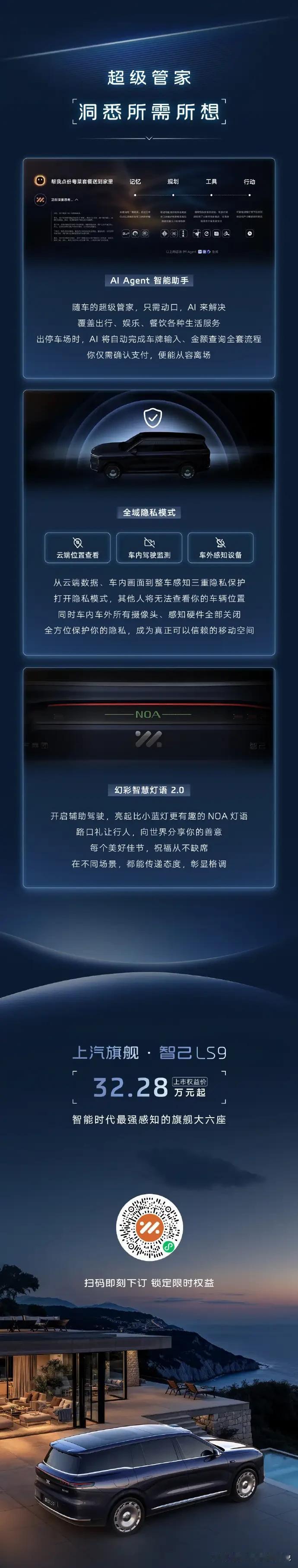 11月12号,品牌旗舰大型SUV智己LS9闪亮登场,一下推出俩车型,LS9 52Ultra版32.28万,LS9 66Ultra版35.28万。这车一上市就火得不行,25分钟订单量就突破5000,它可是业内首批搭载AI Agent的旗舰车,高端大气上档次! 外观上,智己LS9线条流畅纯粹,巧妙化解了大型SUV的笨重感。前脸贯穿式日间行车灯拉宽视觉,纵向灯组与格栅呼应,科技感十足。车顶的激光雷达和智慧探射灯,不仅吸睛,还藏着智能驾驶的硬实力。 这车尺寸大,但开起来可灵活了。5.28米的车长,3.16米的轴距,配上灵蜥数字底盘3.0的后轮转向技术,转弯半径才4.95米,简直“举重若轻”。恒星超级增程技术也厉害,纯电续航四百公里,加油能跑一千六,动力还媲美4.0T大V8。 安全配置上,智己LS9也是下足了功夫。瞬净新风系统1分钟就能换完整车空气,PM2.5过滤效率高达99.97%。车身结构坚固,关键部位用1500MPa级热成型硼钢,电池也是航天级安全标准。 还有啊,这车还搭载了中国品牌首搭的B&O高端音响,4D机械按摩座椅力度堪比专业按摩椅,长途越野还能供应热水洗澡,简直太享受了! 现在购车还有七重好礼和限时金融方案,现金礼5000元预付款能换15000元现金折扣券,金融方案0首付起,前两年0息,后面三年年化费率才2.99%。这配置,这价格,智己LS9绝对是同级里的“卷王”,你喜欢不?