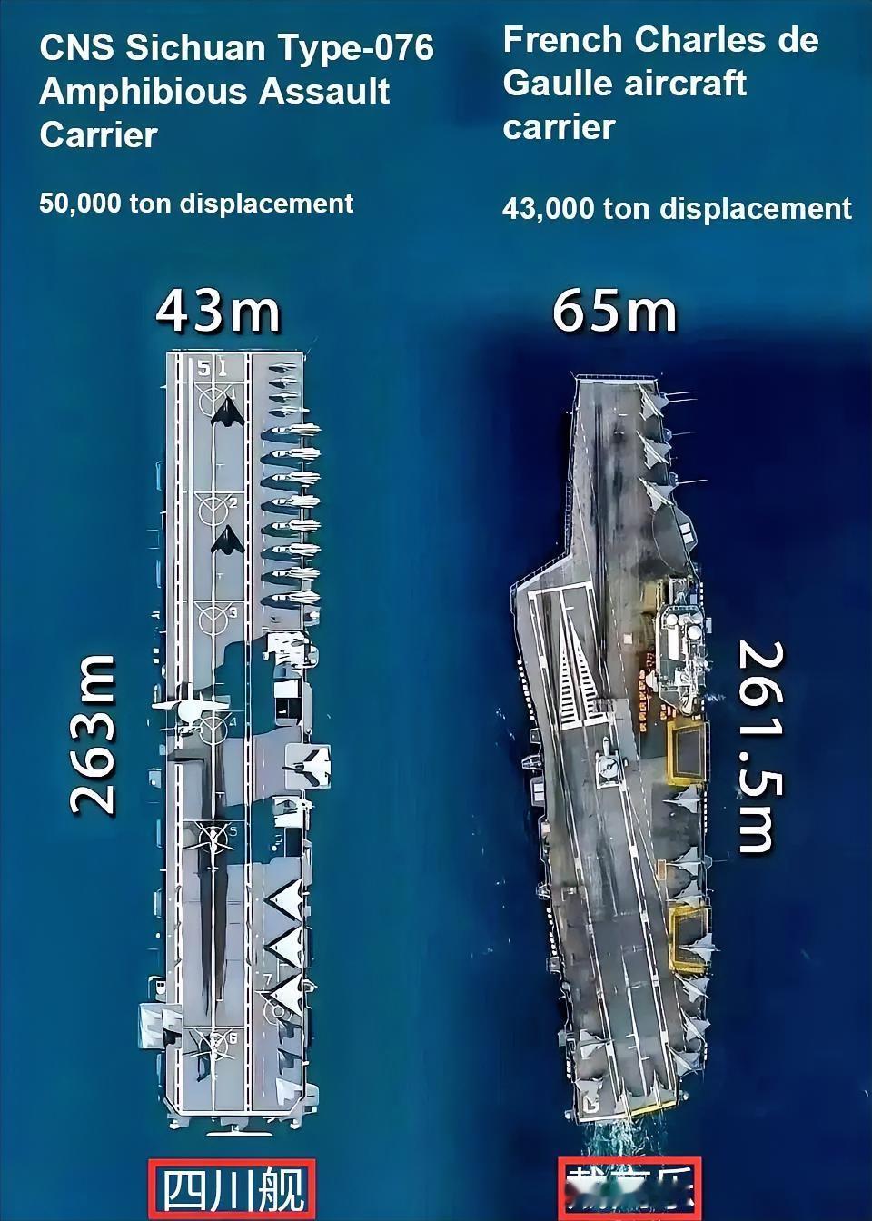 我们的076和法国的戴高乐航母放在一起对比来看,076的长度和排水量都超过了戴高乐航母,我们官方只说是4万余吨,有没有说标排还是满排,考虑到国产装备比较保守,最后大概率是接近5万吨。至于宽度,戴高乐是中型航母,做了很大的外飘。 戴高乐是“老派贵族的远洋排面”,是他们的传承与象征,作为法国海军的“脸面”,也是全球唯一一艘非美国系的核动力航母,4.3万吨的满载排水量,能搭载阵风M战机、E-2C预警机,还有成熟的弹射拦阻体系,妥妥的欧洲战力天花板。 虽然戴高乐是核动力,但076用的是2燃+6柴的混合动力,稳定又好维护,没有核反应堆的安全隐患;更牛的是装了福建舰同款的110米“满血版”电磁弹射器,效率高达90%,90秒就能弹一架飞机,不管是歼-35隐形战机还是攻击-11无人机,都能稳稳弹射。 功能也无短板,作为两栖攻击舰,它保留了能装3艘气垫艇的大型坞舱,1100名带装备的陆战队员说投送就投送,抢滩登陆硬实力拉满;作为“准航母”,它能搭载歼-35+攻击-11的隐身组合,歼-35满油满弹起飞,作战半径1000多公里,比戴高乐的阵风M强出了代差。 法国海军中将就吐槽过,“076的吨位和甲板面积都超过戴高乐,如果076是两栖攻击舰,那戴高乐算什么?”其实答案很简单:戴高乐是“老派贵族的排面”,而076是“新势力的革命”。它不用跟戴高乐比“血统纯正”,只需要在实战中用“效率+多功能”取胜,就已经改写了海上作战的规则。