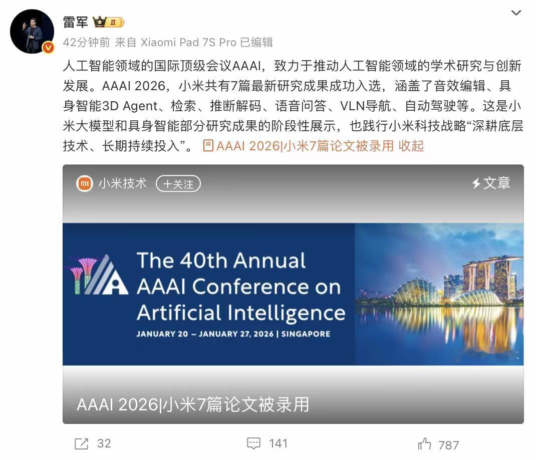 1. 雷军称小米7篇论文入选AAAI2026:雷军发文称小米7篇研究成果入选A