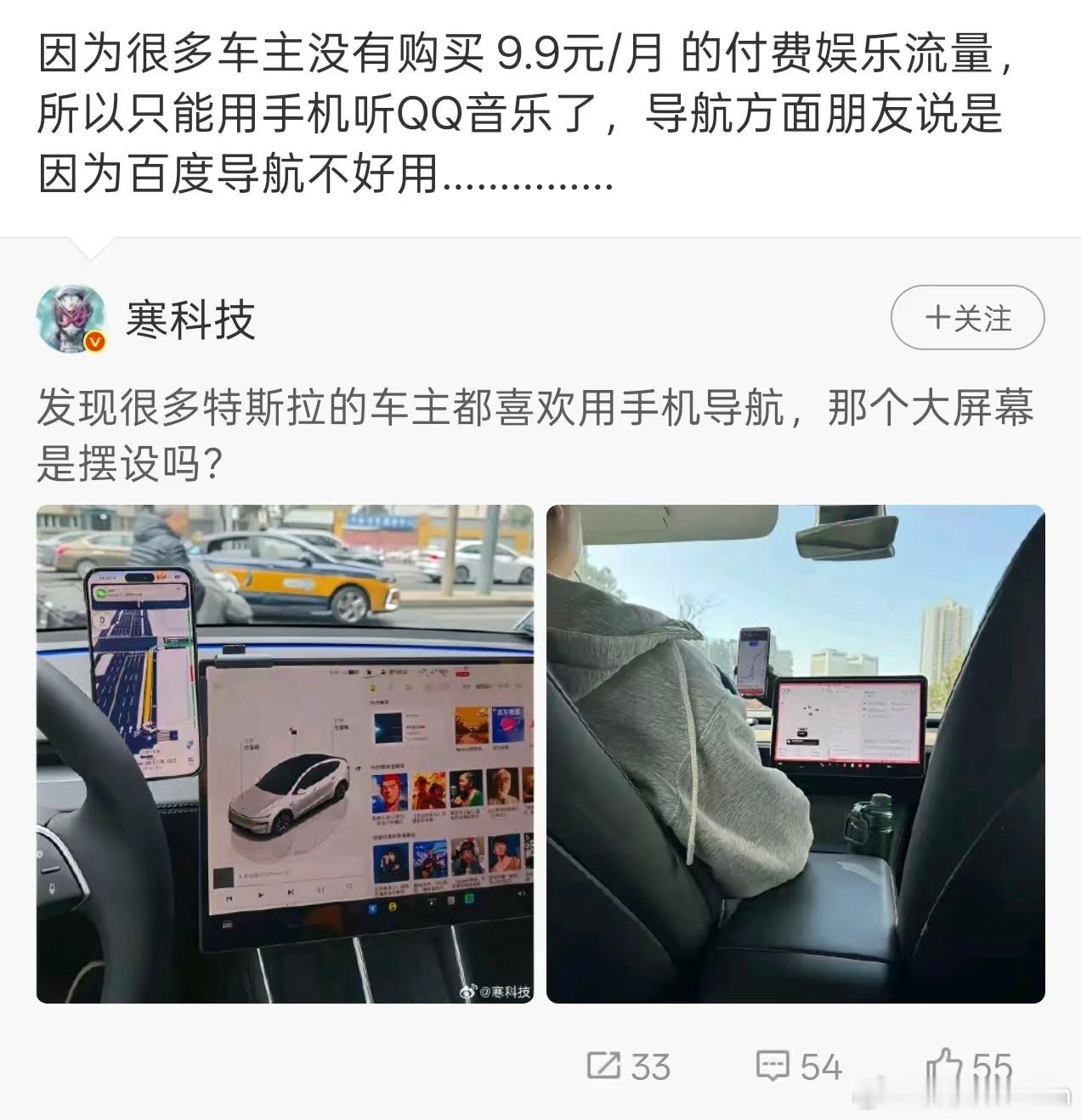 我只能说,纯个人习惯问题我有高级车载娱乐连续包月,但我也手机蓝牙音乐+高德地图导航评论区特斯拉车主兄弟们,聊聊你们的习惯?特斯拉