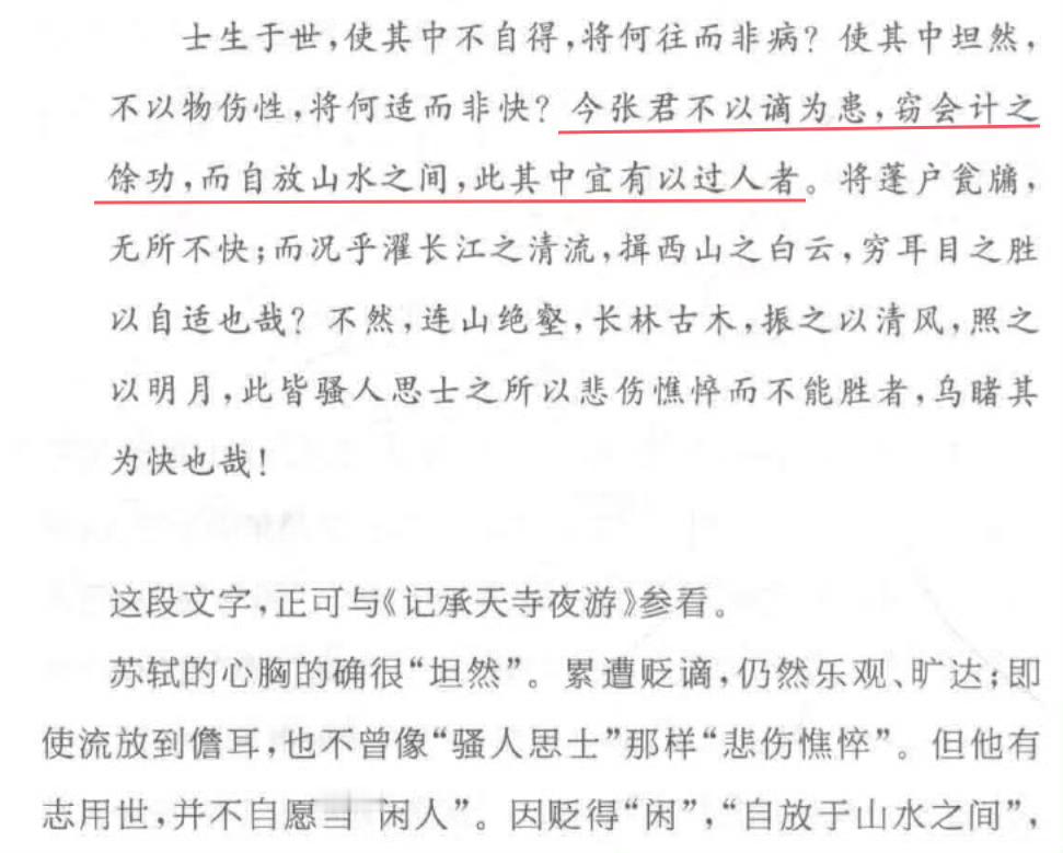 怀民亦未寝942周年现在流行的解读把苏轼、张怀民都给矮化了。这两年突然流行说张怀民被贬,难受得睡不着觉;苏轼专门过来安慰老朋友。。。¹ 听起来很合理。但假如我们不知道这篇短文谁写的,完全可以这样子解读。然而,我们已经知道作者是苏轼,知道他的老朋友是张怀民,就可以根据其他文献记录知道,他俩都不是容易“苦闷”的人。相反,他俩都有“坦荡快哉”心胸。² 张怀民被贬后见到苏轼,赠墨二枚,苏轼写《书怀民所遗墨》。张怀民修亭子,“以览江流之胜”,苏轼给张的亭子取名“快哉亭”。苏辙写《黄州快哉亭记》,其中明确说“张君不以谪为患”,“自放山水之间”,把长江清流、西山白云都当成一种精神享受。张君并没有像古代骚人那样,“悲伤憔悴”。³ 如果我们读苏轼作品够多,比如《临皋闲题》里面说,“临皋亭下八十数步,便是大江。其半是峨眉雪水,吾饮食沐浴皆取焉,何必归乡哉。江山风月,本无常主,闲者便是主人。”再比如,“竹杖芒鞋轻胜马,谁怕?一衰烟雨任平生”,就会发现一种特别的苏东坡乐天气质。联系苏辙评价二人说的话,就可以知道他们都以这种拥有心境为荣:自适、自乐、自我排遣。⁴ 越是年龄大越能理解这种“自适、自乐、自我排遣”的重要性。当一个人被贬谪,生命的“规范时间”已经被打破,不用去汲汲名利,劳心费力,当然也不用到时到点就睡觉,反而获得了一种自由,一种“闲”。这时候,自己真正成为了“江山风月”的主人,岂不快哉!所以苏轼得意地说,“何夜无月?何处无竹柏?但少闲人如吾二人耳。”⁵ 明朝人陆树声还记载了苏东坡另外一件“自我排遣”的闲事:东坡在海南,食蚝而美,贻书叔党曰:“无令中朝士大夫知,恐争谋南徙,以分此味。”⁶ 以上解读推荐给中学老师。热点科普