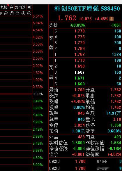 科创50增强ETF,大涨接近5%,而科创50小跌开盘,所以这是流动性问题造成的,秒下来。