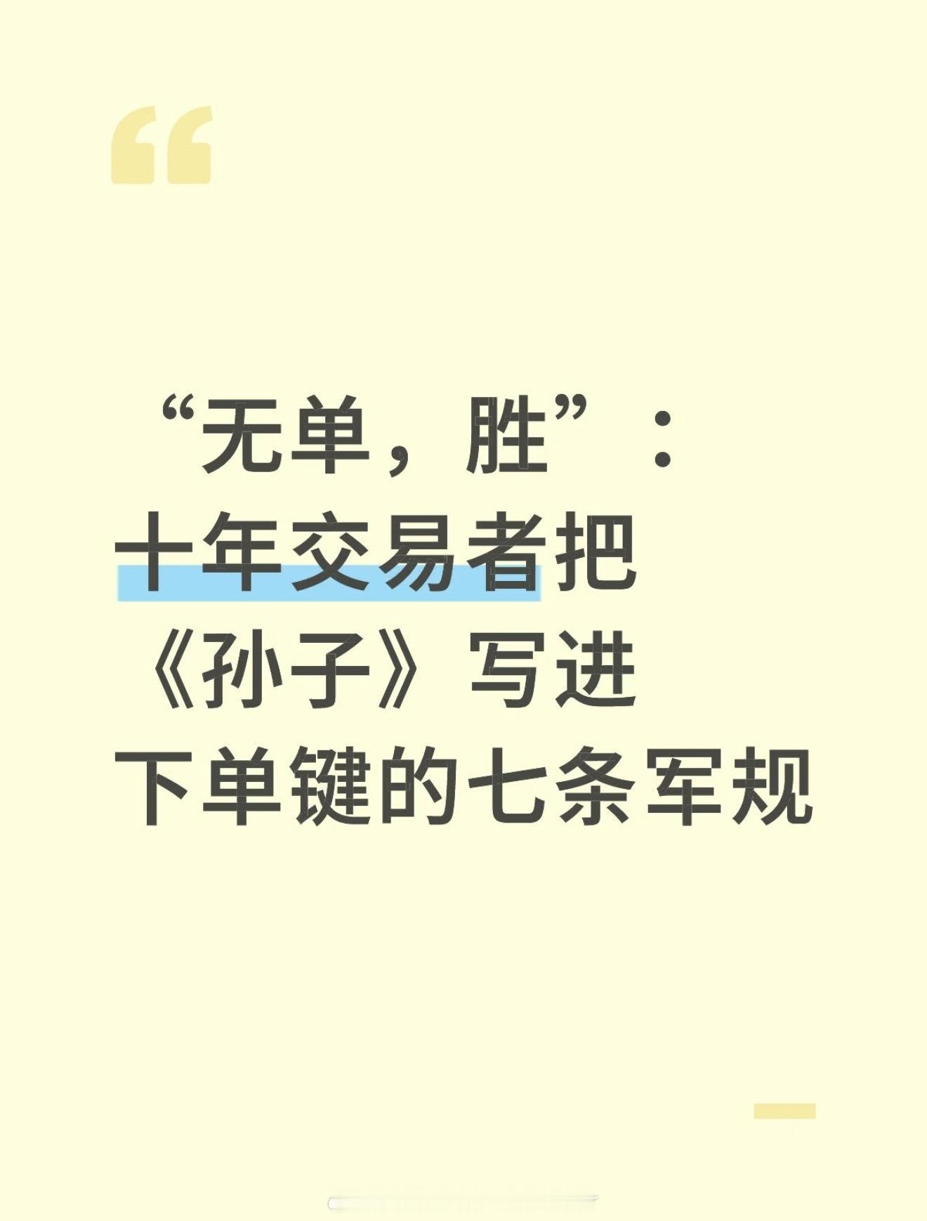 “无单,胜”:十年交易者把《孙子》盘前读完《孙子》,盘后合上《通鉴》,我把两本书扫进抽屉,心里只剩八个字——“先胜后战,以局吞势”。交易十年,今天才算把这句话真正写进下单键里。1. 胜在键盘之前过去我以为“胜”是盈利,现在明白“胜”是下单前那一秒的坦然。系统信号给不出、风险金不够、心情不静——这三样缺一,我就空仓。不战而屈人之兵,原来就是“今天没单,但账户也赢了”。2. 把周期调到“上帝视角”孙子说“势如扩弩”,我把它拉到周线月线:日内的闪电再炫,也抵不过月线一根均线。只要 250 周线向上,我就只找多;向下,我就只找空。顺百年气候,不赌一夜暴风雨。3. 止损是“先斩宠姬”孙武杀吴王爱妃,告诉交易者——规则面前无女神。我的“宠姬”是每笔订单的“回本幻想”。开仓同时挂止损,触发即砍,不补仓、不纠结,砍完泡一杯茶,看行情继续演。4. 资金是兵,调度是命我把账户切成三队:侦察队 5%,主力 15%,预备队 80%。任何一次入场,先派侦察,赢了才呼叫主力,预备队永远不动。亏到预备队报警,直接停战一个月,读读书、跑跑步,让市场忘了我。5. 空仓是“最高仓位”以前觉得空仓是错过,现在明白那是持仓净值曲线在回血。天天满仓,等于夜夜攻城;月月空仓,等于日日积粮。等敌人(行情)自己乱,再上去摘桃,比硬啃城墙便宜多了。6. 每日三省,只问“贪惧急”收盘写三行:① 今天贪了吗?② 今天怕了吗?③ 今天急了吗?只要有一笔单子是因这三字出手,第二天自动降半仓。三个月下来,曲线斜率自己变陡。7. 最后一条:把“盈利”改名叫“利息”利息是市场借给我的,随时可能收回去。抱着“还利息”的心态,人就不飘;不飘,就能继续等下一笔高胜率的买卖。等得越久,利息越厚,这才是职业交易者真正的复利。合上笔记,屏幕漆黑,我今天的操作只有一行:“无单,胜。”