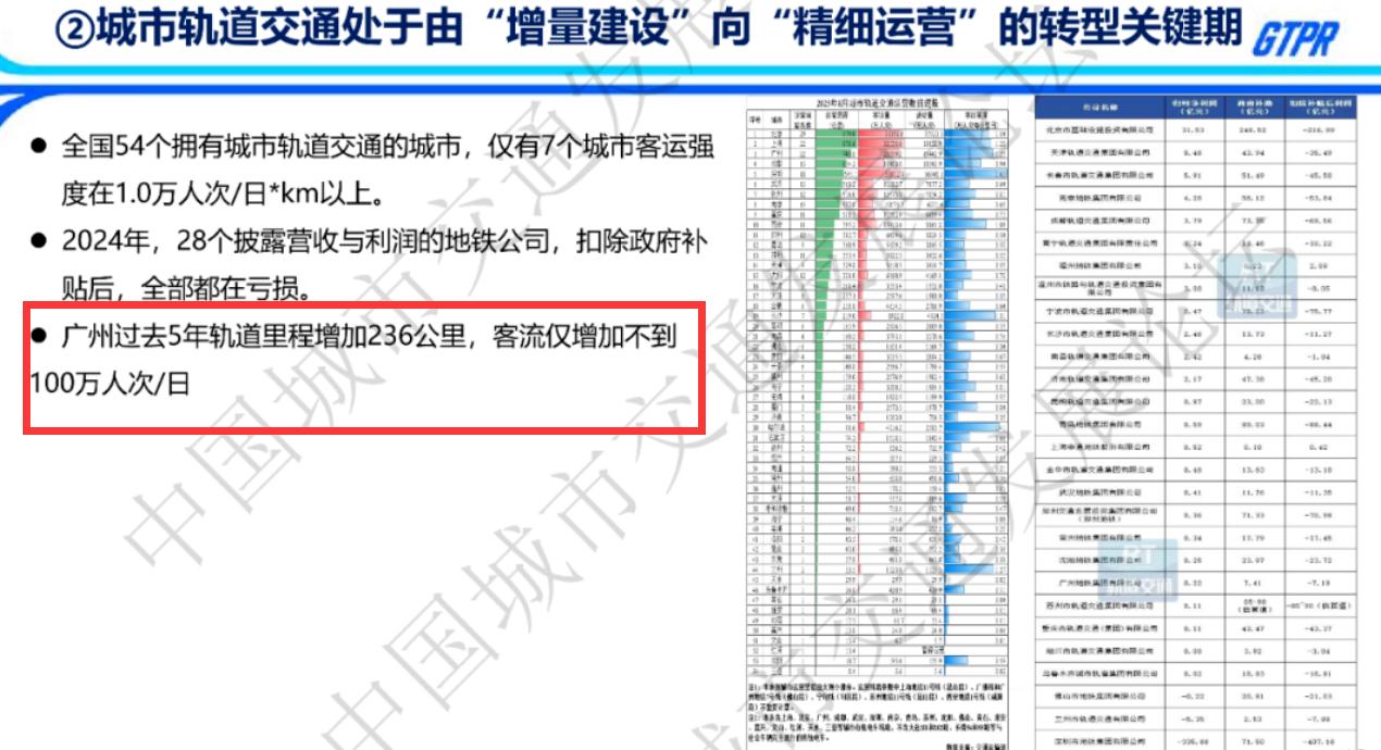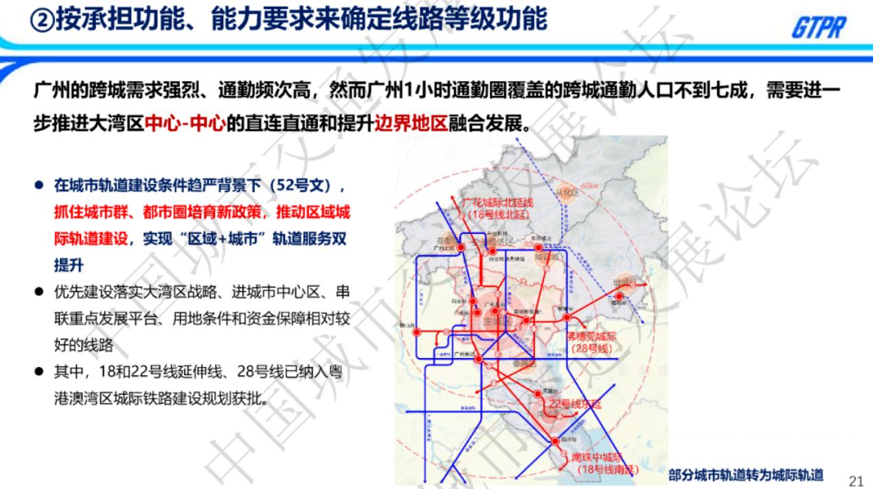 【好消息!22号线延伸线已纳入城际铁路建设规划】广州市交通规划研究院有限公司董事长发布《超大城市轨道交通的效率变革思考——广州轨道交通线网发展探索》文章。 文章指出传统轨道规划偏道路网式,注重线路建设,忽视了运营特点。存在快线通道资源统筹不足、地下空间资源统筹不足、不同时期线路换乘设计统筹不足等等问题。 他还表示轨道交通建设投资巨大,需认真考虑可持续运营,城市轨道交通处于由“增量建设”向“精细运营”的转型关键期。2024年,28个披露营收与利润的地铁公司,扣除政府补贴后,全部都在亏损。广州过去5年轨道里程增加236公里,客流仅增加不到100万人次/日。 他建议从规划调整做起,进行多网功能等级融合。他表示广州的跨城需求强烈、通勤频次高,然而广州1小时通勤圈覆盖的跨城通勤人口不到七成,需要进步推进大湾区中心-中心的直连直通和提升边界地区融合发展。在城市轨道建设条件趋严背景下(52号文),部分城市轨道转为城际轨道。其中,18和22号线延伸线、28号线已纳入粤港澳湾区城际铁路建设规划获批。 建议规划轨道快线通过主支线、贯通运营、过轨等方式直达中心区,其中广州在建芳白城际-22号线、广花城际-18号线、佛穗莞城际均为穿城快线/城际。 不过比较可惜的是,大湾区轨道交通规划一期中并没有22号线东延,而一期的规划年限是2020-2030年,这意味着22号线东延进入第二期规划的话,是猴年马月的事情了。运气好的话,如果可以进入修编的话,倒是可以插队提前。不过不知道大湾区轨道交通规划会不会有修编的机会呢?
