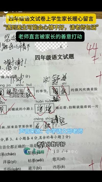 太戳心了!湖北襄阳,一爷爷在孙子的语文试卷上留言安慰老师,简单几个字让老师瞬间绷不住。四年级期中考试刚过,邱老师收回了一张只有44分的语文试卷。可让她没想到的是,卷子角落里,孩子的爷爷写下几句朴素的话:“老师您好,遇到差生可能会心情不好,请老师包涵,谢谢!”这短短一行字,让原本焦虑的老师愣住了,也让无数网友破防。 有些温情,是靠手机截图传递不出去的。现实中的爷爷奶奶,没什么高深学问,但那份善解人意,真比鸡汤管用多了。反观某些“鸡娃”家长,动不动就甩锅,真该学学这位老人。 邱老师那天其实一肚子烦闷。班里成绩拖后腿的孩子,一向是她心头的“结”。卷子刚发下去,小男孩就低着头把试卷藏进抽屉,生怕同学看到。 老师收卷时,原本以为又要做思想工作,没料到看到爷爷的字条,一下子心软了。 这位爷爷没有批评,也没推卸责任,只是先替孩子、替自己,甚至替老师考虑了几分。那一刻,老师所有的“气”都变成了一种心疼。 现在社会,急脾气、推卸锅的家长太多。总想着“我的孩子不能输”,可越是逼得紧,越容易变成两败俱伤。倒不如多一点理解,少一点戾气。 要说这孩子,家里情况其实不新鲜——父母常年在外地打工,丢下他和爷爷奶奶一起生活。 老人年纪大了,农活家务压身,文化水平也有限,辅导作业根本是“隔靴搔痒”。 试想一下,夜深人静,爷爷推开孙子的书桌,看到那鲜红的分数,心里肯定不是滋味。 可老人家没选择责骂,只能写上几句道歉和请求,连行文格式都规规矩矩,像在给老师写一封“求情信”。 孩子的分数不只是成绩单,更是家庭境遇的缩影。别动不动就甩锅给老师和学生,谁家不是抱着一肚子苦水熬日子? 有些家长,孩子考砸了,第一时间冲进群里质问老师:“是不是你教得不行?”也有老师,成绩一拉胯,直接冷处理,眼不见心不烦。 这种互相推诿的“拉锯战”,到头来,苦的还不是孩子? 我想说的是,别让“分数”成了彼此指责的武器。教育不只是分数,理解和善意,才是孩子成长最好的土壤。 谁还没个拉胯的时候?有些大人嘴上说“望子成龙”,实际上一点耐心都没有。你不理解孩子,孩子也就更难理解你。 其实很多老师都懂:成绩倒数的学生,往往是班里最难带却最让人牵挂的。 但有时候,老师也是普通人,累了一天,被家长质疑、被分数刺激,谁心里不堵得慌?这时哪怕是一句体谅的话,都能让人心头一软,干劲又回来了。 这位邱老师后来也说,正是这句话,让她决定再多帮孩子一把。她在教室里会特意关注男孩的反应,课后抽空给他补课。男孩也慢慢变得认真起来,调皮少了,胆子大了。 好老师不是靠鸡血和吼叫养成的,是靠共情和耐心慢慢熬出来的。谁说教育非得冷冰冰,换个角度,也许你收获的是两份温暖。 不少网友阅读后,纷纷讲起了类似经历: 有网友说,自己小时候也是留守儿童,每次拿着不及格的卷子回家,奶奶总是拍拍头说一句“下次再努力”,没有责骂,反倒让她记了一辈子。 还有人分享,班主任曾经在家长会当众表扬一个成绩倒数的学生,“你们都看不起他,其实他最努力,是我最喜欢的学生”,结果那孩子后来真的考上了重点中学。 也有人调侃:“有的家长一看孩子考差了,恨不得立刻换老师。你倒是去教教试试?你能坚持三天算我输。” 现在流行“家校共育”,可现实里不是推来推去就是甩锅。真正能互相体谅的,才是稀缺品种。 家长和老师,嘴上都是“为了孩子好”,可真碰上事,谁能多站一步,孩子就多一分幸运。 每回看到这样的故事,我总觉得中国教育的希望,其实就藏在这点滴温情里。 这位爷爷的留言,说白了就是中国农村千千万万个普通家庭的缩影。老人没什么文化,也不懂“家庭教育理念”,但他有一颗体谅人的心。 他不是装可怜,也没有找理由推卸,只是朴实地希望老师不要因为孙子心情不好。 这种低姿态,其实不是自卑,而是一种善良的智慧。老人知道,孩子成绩差,老师压力大,所以宁愿自己先道歉,也不让老师和孩子之间添隔阂。 “润物细无声”的善意,在忙乱的教育战场里,未必能立刻提高分数,但它能让三方都卸下防备。 老师收到这份体谅,自然更愿意多帮一把。孩子感受到理解,也会慢慢找回自信。教育不是流水线,也不是比赛场。每个孩子的背后,都是一个家庭的希望和坚守。 你怎么看爷爷的留言和老师的反应?你小时候有没有遇到过理解你的长辈或老师?家长和老师之间的那点“小心思”,你觉得该怎么解决? 【麻烦您点击“关注”,多多点赞、评论、收藏,成为我的铁粉,致力于每天把知识和快乐带给您[玫瑰]】