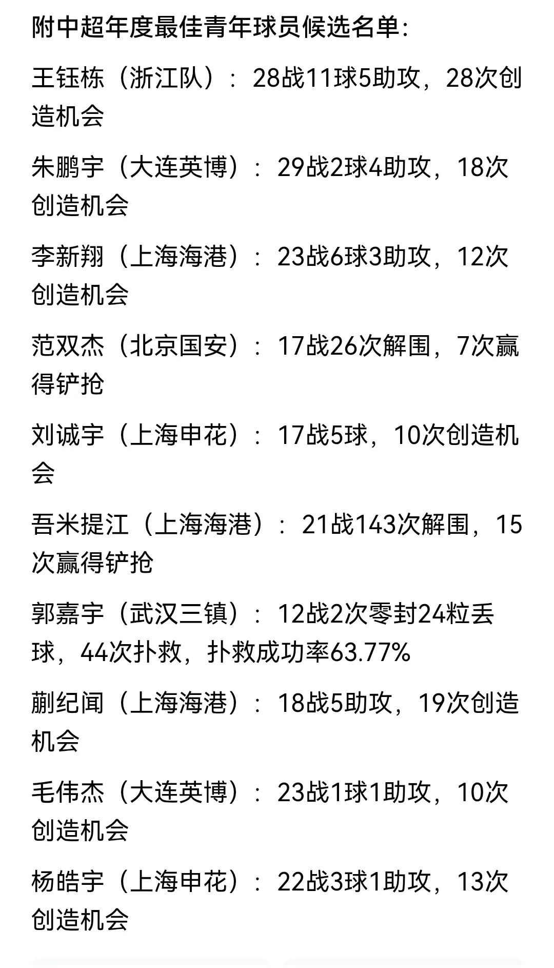 中国10名最佳年轻球员出炉,中超官方公布2025赛季年度最佳青年球员候选名单,谁能最后夺魁,让我们拭目以待吧!他们分别是: 1. 王钰栋(浙江) 2. 朱鹏宇(大连英博) 3. 范双杰(北京国安) 4. 李新翔(上海海港) 5. 刘诚宇(上海申花) 6. 毛伟杰(大连英博) 7. 吾米提江(上海海港) 8. 郭嘉宇(武汉三镇) 9. 蒯纪闻(上海海港) 10. 杨皓宇(上海申花) 最有希望获2025年最佳青年球员的应该是王钰栋,王钰栋中超28战11球5次助攻,28次创造机会,中超本土第一射手,本土金靴,王钰栋在2025年各级国家队也是表现相当神勇,在U20,U22,成年国家队都有进球,王钰栋已成中国各级国家队的绝对主力,王钰栋获奖实至名归!大家认为谁能最终获奖?