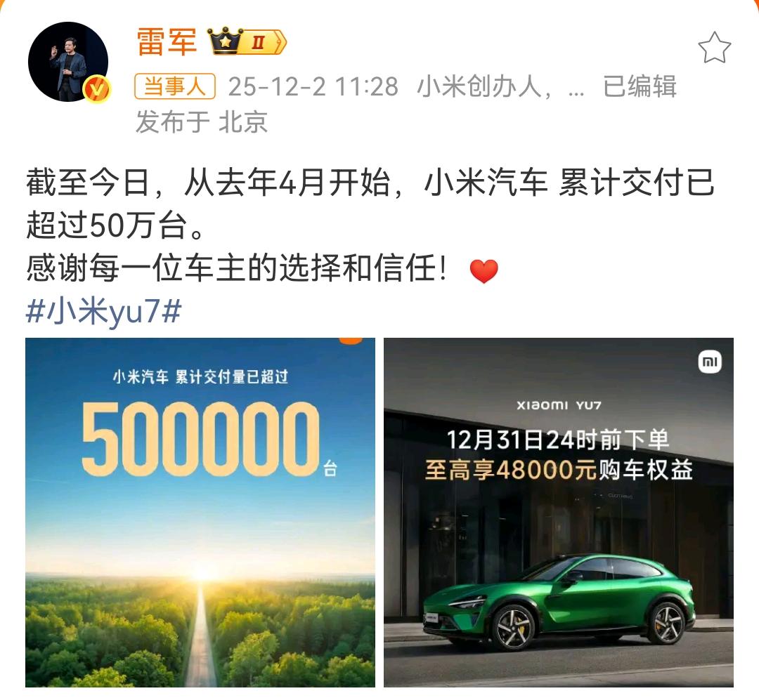 雷军:截至今日,从去年4月开始,小米汽车 累计交付已超过50万台。 感谢每一位车主的选择和信任! 50万辆确实是一个非常快的增长速度,这即使放在传统车企里面,也是很难做到的,特别是一个企业从零开始做到50万那样的成绩,这真的是非常不容易实现的。 目前小米汽车一共有三款产品,两款主流的产品,一款性能产品,三款产品都取得了预想的销量,甚至还超过了很多人的想象。 各位是怎么看的?欢迎评论区留言。