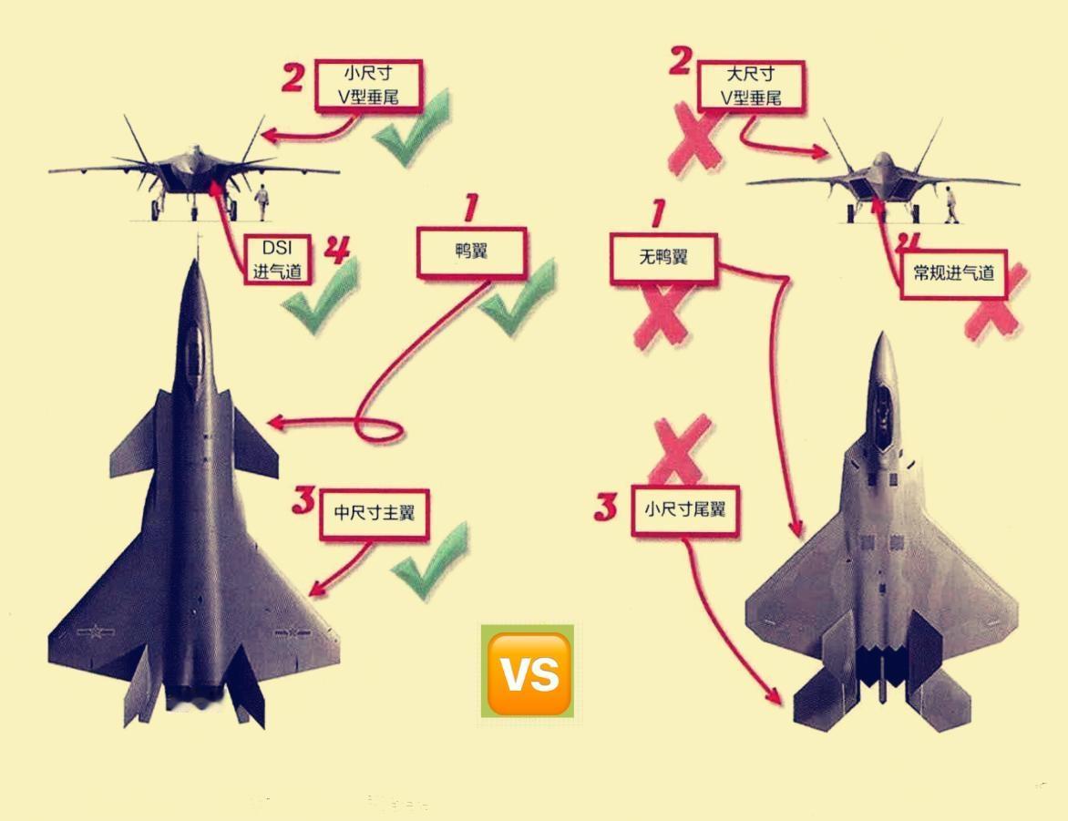 从机腹视角看,歼-20整体上比F-22更大。歼-20的机身长度超过21米,翼展接近15米。F-22机身长约19米,翼展接近14米。歼-20在长度和翼展上都大于F-22。 ​ 歼-20主弹舱长约4.5米、宽约2.4米、深约0.7米。F-22主弹舱长约3.9米,宽约2米,深约0.4米。歼-20的机腹主弹舱在长、宽、深三个维度上均大于F-22,这使得歼-20主弹舱的容纳能力更强。 歼-20的DSI进气道鼓包从机腹两侧向前突出,形成独特的弧形;F-22则是传统的附面层隔道设计,从机腹看有一道明显的纵向缝隙。 歼-20机腹前端有一个明显的椭圆形红外窗口(IRST),用于被动探测;F-22机腹无类似设备,传感器主要集中在机头。 从机腹看,两款战机展现了截然不同的设计哲学:F-22强调完美隐身与超机动的结合,机腹线条简洁,喷口扁平,弹舱布局紧凑;歼-20则追求更大尺寸带来的武器载荷、航程优势,以及后发技术带来的航电系统优势。 F-22诞生于冷战末期,核心任务是在欧洲战场上穿透严密的苏联防空网,在开战初期就彻底摧毁敌方空军,夺取绝对制空权。它追求的是极致的单机性能,隐身是为了不被发现先敌开火,超音速巡航是为了快速接敌和脱离,超机动性是为了在视距内格斗中占据绝对优势。其武器配置也反映了这一思路。但为此也付出了航程相对较短、维护成本高昂的代价。 歼-20的设计则明显针对西太平洋特定的地理环境和现代战争形态。广袤的海洋和潜在对手的海外基地,要求战机必须有巨大的航程和作战半径。现代战争是体系对抗,因此歼-20在设计上更强调作为信息网络中的一个强大节点,利用先进的传感器获取信息,并通过数据链与预警机、无人机和其他战机共享。这种设计思路与F-22在理念上就存在着代差。