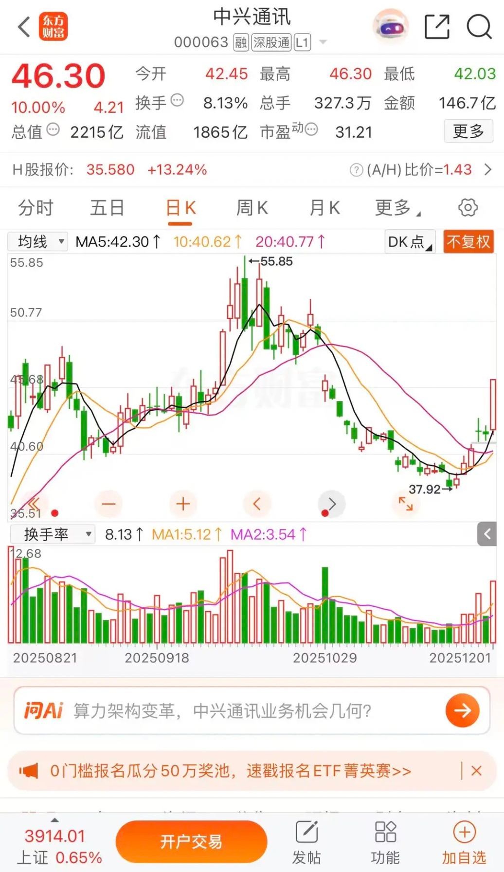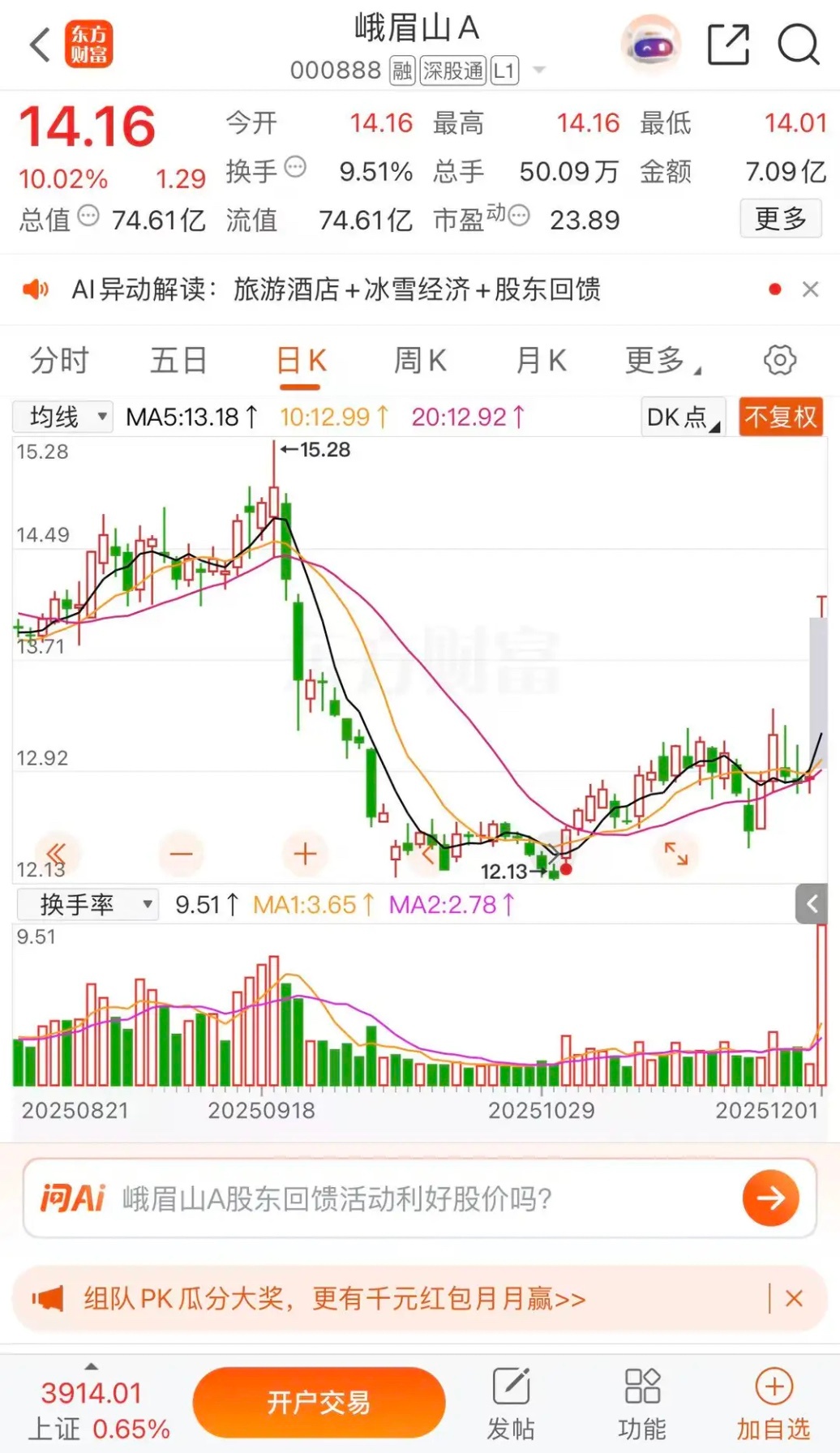 航天发展,中兴通讯,峨眉山A买500股免门票涨停航天发展涨停板收盘报收14.86元每股,成交金额21.09亿元,风口浪尖的福建股这波牛强强强,跨年妖在其中。峨眉山A涨停板收盘报收14.16元每股,成交金额7.09亿元,真牛气,2个月不减持持有500股免景区,索道门票费,真有意思,还一字板,不过人家板上出货。中兴通讯涨停板收盘报收46.30元每股,成交金额146.7亿元,AI带动涨停,冲高