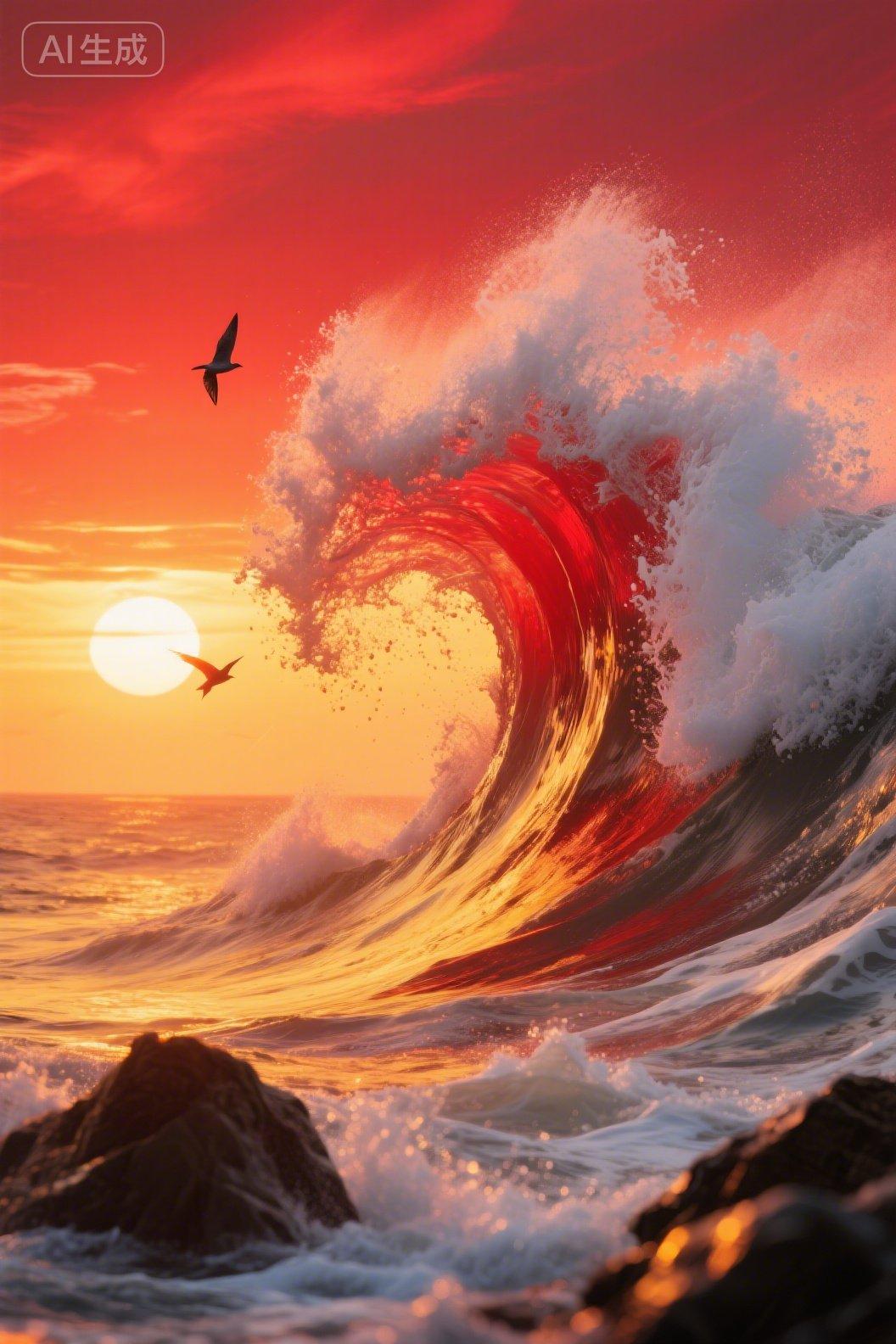 赤浪卷金吞晚照,鸥逐涛光破赤霞,沧波烧尽一穹霞。