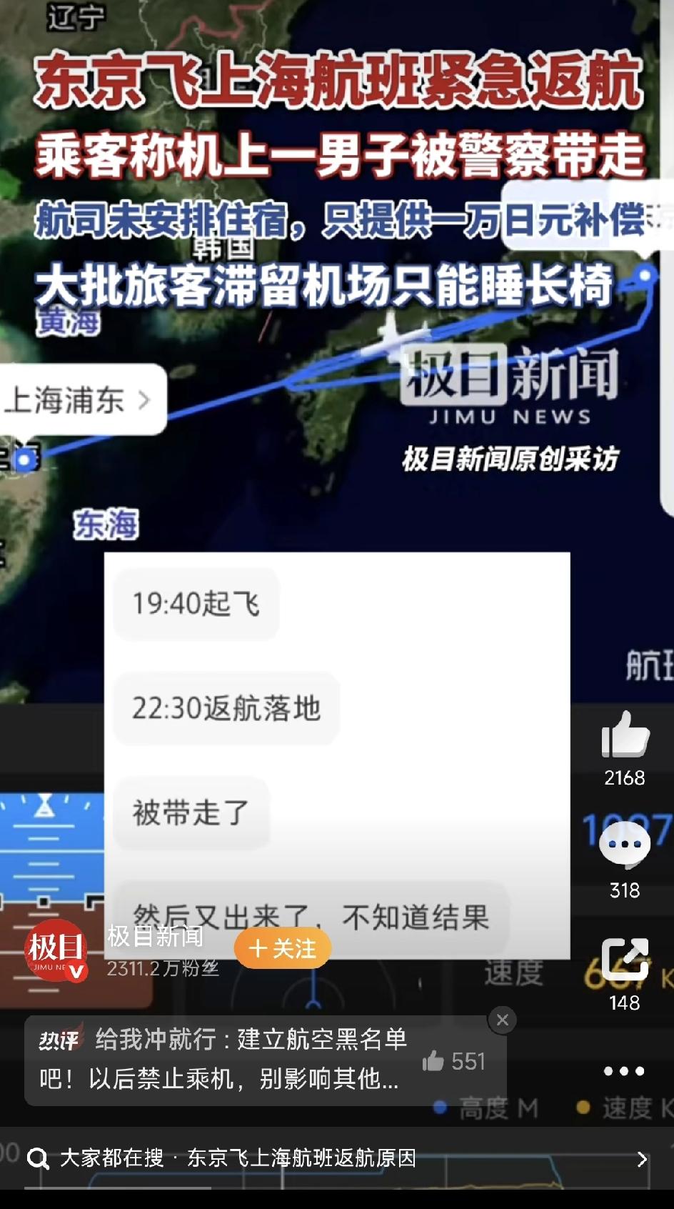 12月1号晚间发生的一起航班意外:春秋航空日本执飞的IJ005次航班,从东京飞往上海途中突发状况紧急返航,机上百名乘客被迫滞留机场,经历了一场糟心的过夜之旅。 这趟航班原本计划于当地时间12月1号晚上7点43分从东京起飞,直飞上海。然而飞机升空1小时40分钟后,却突然掉头返航,最终在晚上10点40分左右降回东京成田国际机场。据机上乘客透露,返航的起因竟是一场小小的座位纠纷——一对同行男女登机后发现座位并未相邻,男方随即向空乘提出换座请求,遭到拒绝后双方爆发言语冲突。这场争执愈演愈烈,乘组人员最终选择报警,航班也因此启动返航程序。另一位乘客白晨表示,涉事男子与机组人员的纠缠持续了近2小时,飞机落地后,该男子便被当地警方带走调查。 深夜返航让满机乘客的行程彻底被打乱。原本满心期待抵达上海的大家,只能滞留机场无助等待。更让人无奈的是,航空公司并未为滞留乘客安排住宿,众人只能在机场长椅上和衣而卧,在疲惫与困意中熬过漫漫长夜。 据白晨描述,机场与航司仅向每位乘客发放了1万日元(约合人民币454元)的补偿。后续航班被调整至12月2号上午10点起飞,航班号变更为IJ005D,计划于当地时间中午12点40分抵达上海浦东机场。 这起事件也给所有出行人提了个醒:乘坐飞机时遇到问题,务必保持冷静理性沟通。仅仅为了换个相邻座位,就引发如此严重的冲突,不仅让自己面临警方调查、行程泡汤,更耽误了一飞机人的时间,实在得不偿失。大家出门在外都不容易,多一份互相理解,多一点耐心协商,很多问题都能妥善解决。 衷心希望这趟航班的乘客们能顺利抵达上海,也盼着今后出行能少些这类意外插曲,每个人都能平安舒心地抵达目的地。同时也想提醒航空公司,面对此类突发状况,应多站在乘客角度考虑,及时完善后续保障安排,让滞留的旅途少些糟心与无助。 来源:极目新闻