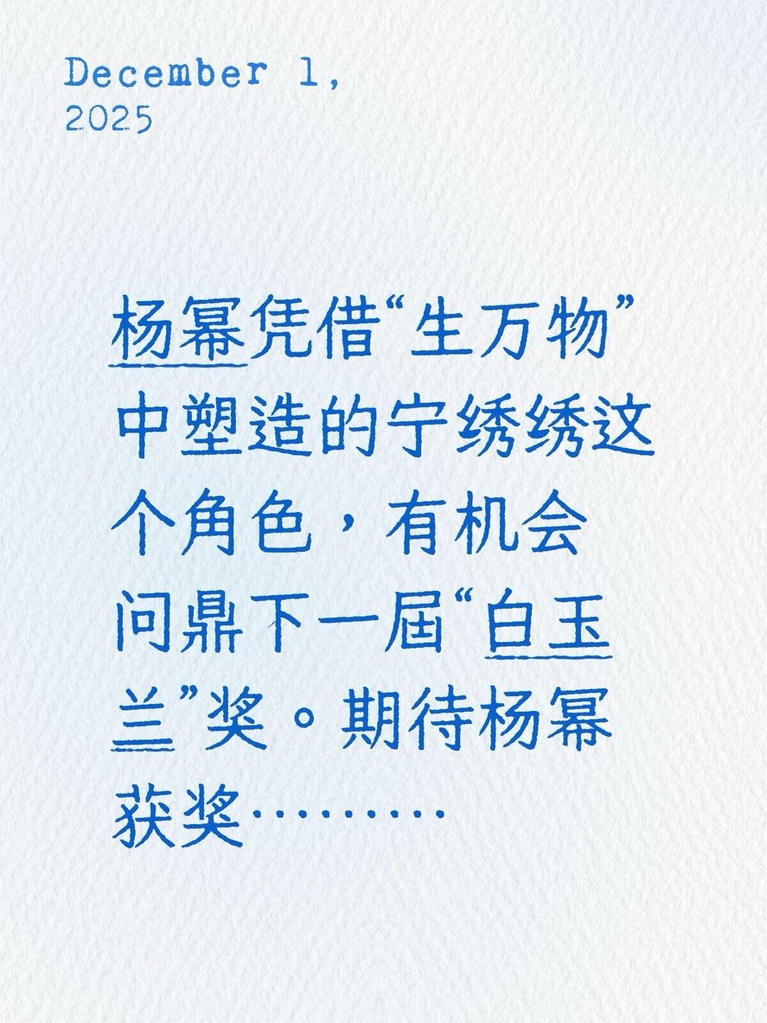 杨幂凭借“生万物”中塑造的宁绣绣这个角色,有机会问鼎下一届“白玉兰”奖。期待杨幂获奖………杨幂|