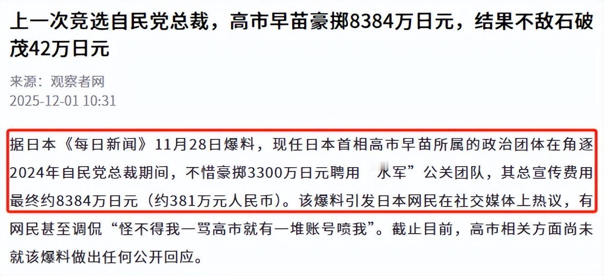 高市被曝重大丑闻,中国手握大招却按兵不动,只为届时打日本七寸! 新首相高市早苗上台还没站稳,就被一连串丑闻砸得晕头转向:先是涉嫌收受与“台独”势力有关的奢侈品,接着被爆出自民党总裁选举期间豪掷8000多万日元搞宣传,其中超过3000万疑似用于雇佣网络水军刷票。 这还没完,她亲手挑选的内阁成员也接连陷入政治献金丑闻,厚生劳动大臣被揭用政治资金出入高级俱乐部,其自身竞选团队更涉嫌违规超额接受捐款。 麻烦各位读者点一下右上角的“关注”,留下您的精彩评论与大家一同探讨,感谢您的强烈支持! 一时间,这位靠对华强硬言论迅速拉高支持率的政客,瞬间成了舆论的靶心。 自民党内部一片尴尬的沉默,右翼团体悄悄删帖,连一向爱指手画脚的美国也仅含糊其辞地表示“关注法治进程”,不再高调撑腰。 日本民众的疑问越来越响:这位首相,到底是在为国家谋前途,还是在为小圈子谋私利? 面对这样“送上门”的机会,中方的反应却异常沉稳。 言辞批评固然严厉,但实际动作却相当克制,并未如外界猜测那般挥出“经济重拳”。 这不禁让人深思:中国究竟在等待什么?是心慈手软,还是另有深谋远虑? 我们必须看清,中国手中的确握有能令日本经济震颤的“牌”。 且不说数千亿美元的日元外汇储备一旦集中释放可能引发的汇率风暴,单是每年超过1.7万亿日元的中国游客消费额,以及支撑日本众多产业的中国供应链和近5000亿美元的双边贸易额,任何一项若被实质性限制,都足以让本就脆弱的日本经济雪上加霜。 特别是当下,日本正承受着贸易逆差、日元疲软和巨额国债的三重压力,高市政府刚宣布的21万亿日元经济刺激计划(包括发放儿童补贴和能源券)严重依赖发债,若外部环境突变,这些“糖丸”恐瞬间被通胀吞噬。 中方至今引而不发,恰恰体现了一种成熟的战略定力。 其核心逻辑在于:要精准打击的是挑衅中国核心利益的少数政客,而非日本国民福祉与中日经贸合作的基本盘。 中日经济深度融合,伤敌一千可能自损八百,这不符合两国人民的根本利益。 中国始终将政治问题与经济交往区分对待,这种“嘴上强硬、手上稳健”的做法,既清晰划出了红线,也为未来关系转圜保留了空间。 更深一层考量,关乎中国长远的区域经济战略,加入CPTPP(全面与进步跨太平洋伙伴关系协定)。 日本作为该协定的关键主导国,手握重要话语权。尽管高市早苗政府目前姿态强硬,但CPTPP的决策绝非一人所能左右,日本经济界内部也存在重视对华合作的声音。 中国若因一时之气对日采取极端经济反制,无异于亲手关上这扇通往更高标准自贸体系的大门。 相反,保持克制,展现负责任大国风范,则有助于争取日本国内理性力量的理解,为未来与新一届日本政府重启对话奠定基础。 中国为达到CPTPP高标准已在诸多领域推进实质性改革,其加入将为整个亚太区域注入强大增长动力。 中方在等什么?答案很明确:等待高市早苗政治泡沫的自我破灭。 当前其看似高达70%的支持率,很大程度上建立在煽动民族主义的脆弱基础之上。 一旦日本民众切实感受到,对华强硬换来的不是安全与繁荣,而是物价飞涨、生计维艰,民意必将逆转。 日元汇率已在156关口徘徊,政府债务如山,若外部环境稍有风吹草动,经济窘境将立刻转化为政治压力。届时,自民党内部为求自保,很可能上演“逼宫”戏码。 中方当前采取的是“精准警示”与“保持常态”并行的策略。 一方面,通过官方渠道理性发声,发布赴日提醒,表明严正立场; 另一方面,维持正常经贸往来,不主动扩大事态。这种“外科手术式”的反制,目的正是以最小代价传递最清晰的信号:与中国对抗没有出路,合作才是正道。 这场博弈,远非简单的针锋相对,更像一场关于耐力与远见的考验。 高市早苗企图利用短期民粹情绪巩固权位,却忽视了日本经济与区域合作的深层需求。 而中方之所以沉稳如山,是因为看清了历史潮流,任何逆流而动的政客终将被现实淘汰,只有秉持相互尊重、互利共赢的理念,才能赢得未来。 你们如何看待这场政治风波?中国保持战略定力是明智之举吗? 高市早苗的政治命运又将如何收场?欢迎在评论区留下你的犀利见解,我们一起探讨!