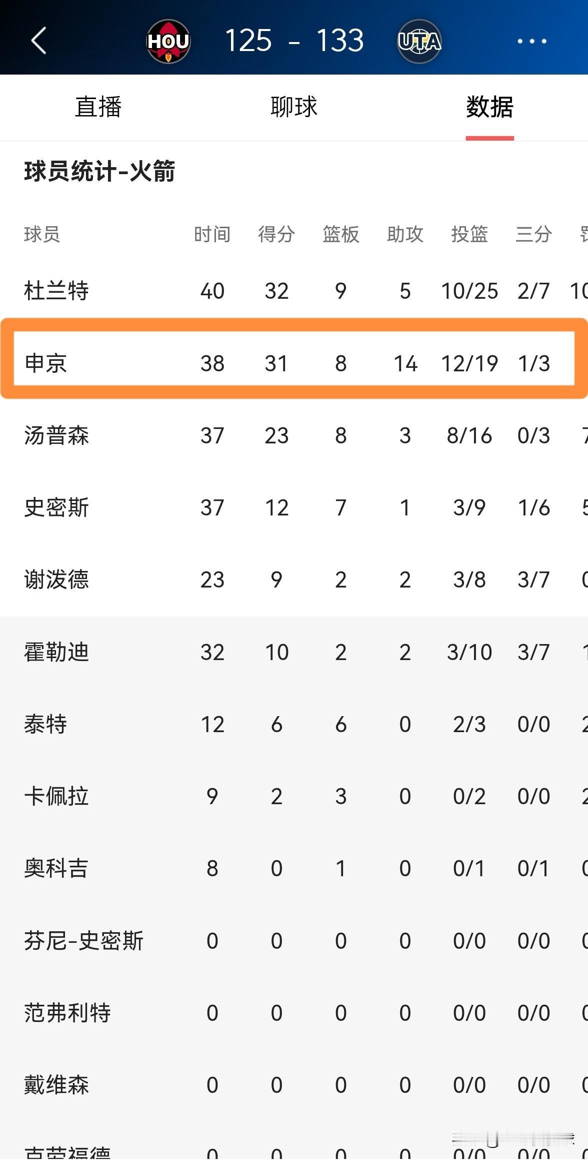 火箭超级中锋申京真是名副其实的数据刷子!在今天火箭客场以125:133输给爵士的比赛中,申京打出了极其出色全面的表现,可惜的是沦为了空砍。 整场比赛下来,申京首发出战38分钟,投篮19中12,其中三分球3中1、罚球8中6砍下31分8篮板14助攻2抢断,他的场上正负值为+3。 当我看到申京的数据表现时,我不由自主的想起了掘金巨星约基奇在今天输给独行侠比赛中的炸裂表现。