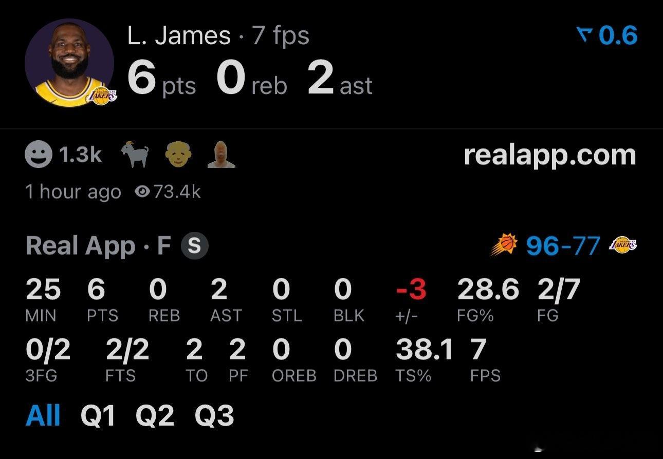詹姆斯 老詹到目前为止只拿到6分!这是我07看球以来,第一次看到他得分不能上双!他真的老了……太阳vs湖人