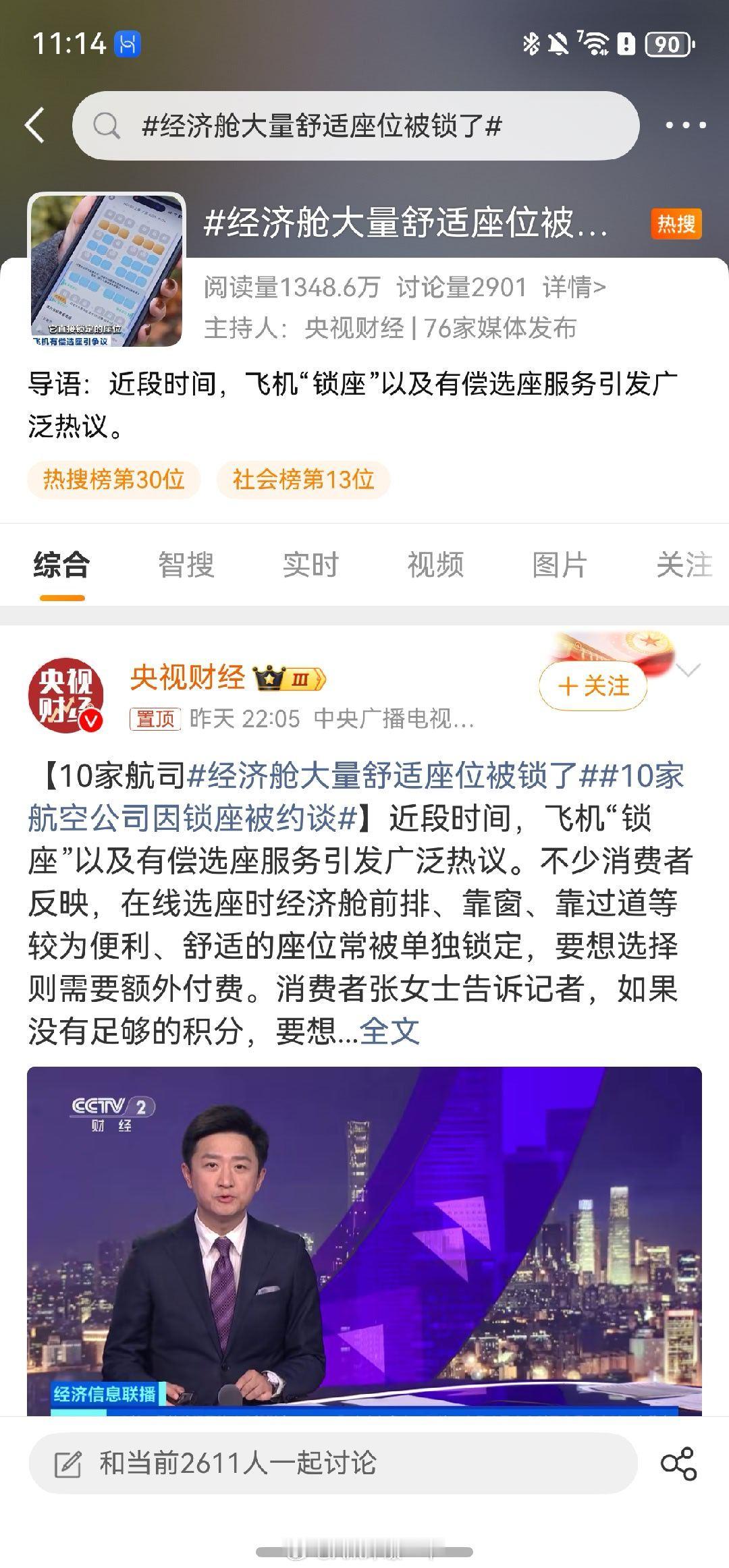 经济舱大量舒适座位被锁了央视注意到了这件事,希望航司能积极纠错,有的航班明明是有座位可选的,就是不给你选想换的,比如之前我从拉萨回成都想坐窗边,航旅纵横上显示都没靠窗的了,结果得亏去柜台问一下还可以选