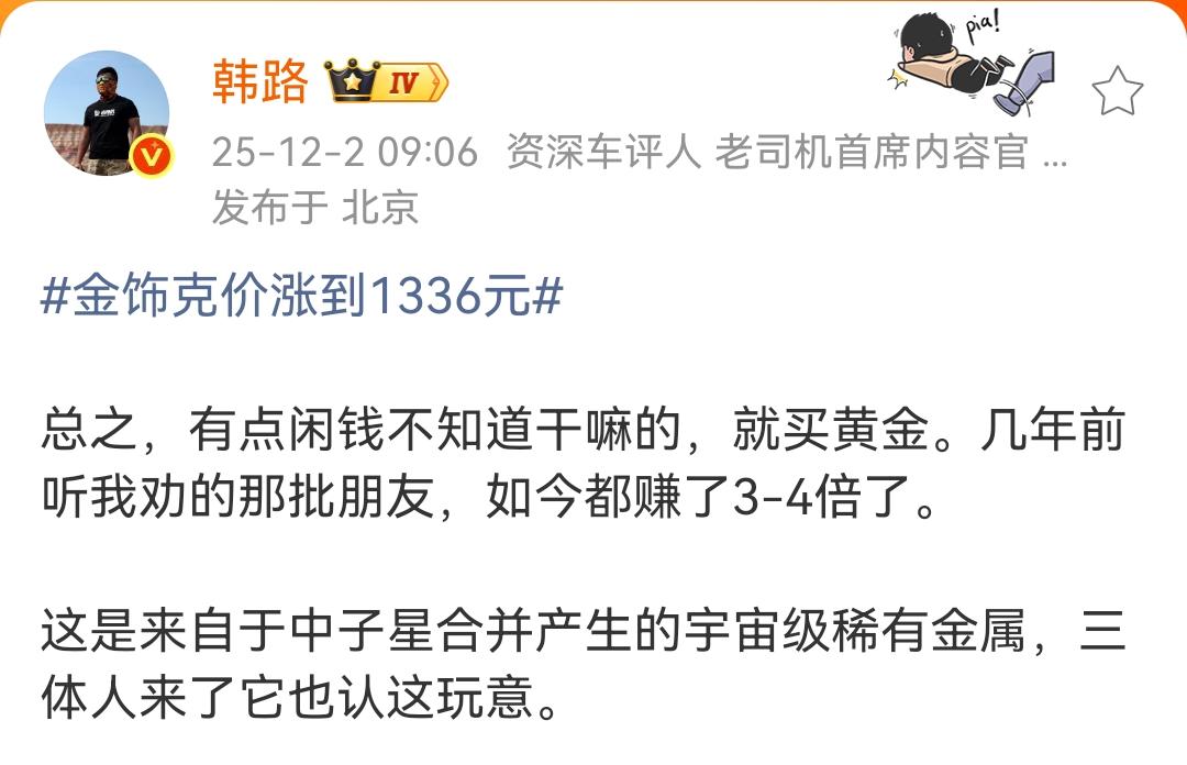 韩路:总之,有点闲钱不知道干嘛的,就买黄金。几年前听我劝的那批朋友,如今都赚了3-4倍了! 这是来自于中子星合并产生的宇宙级稀有金属,三体人来了它也认这玩意。 这个玩意儿对于没有闲钱的人千万不要买,因为有的人他是挣钱挣的比较多,也不知道买什么好,那买黄金确实适合,但是很多人本身手上就没有什么钱,就不建议买这个,万一亏了自己又心疼的很。 各位是怎么看的?欢迎评论区留言。