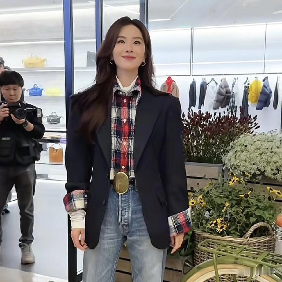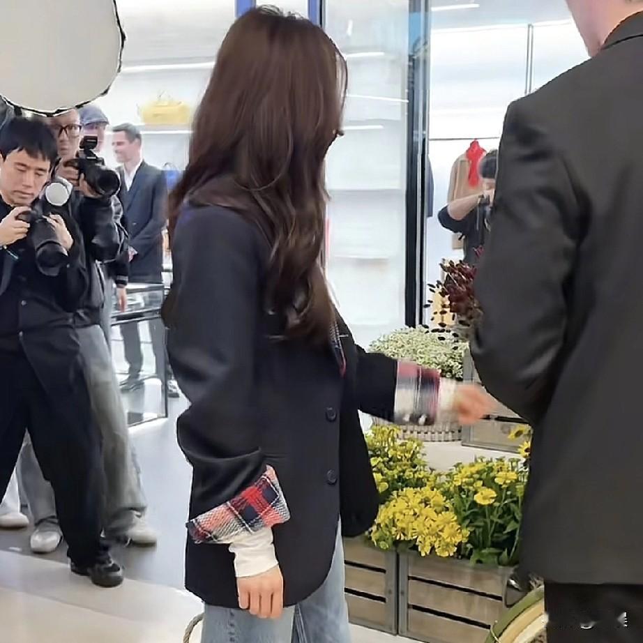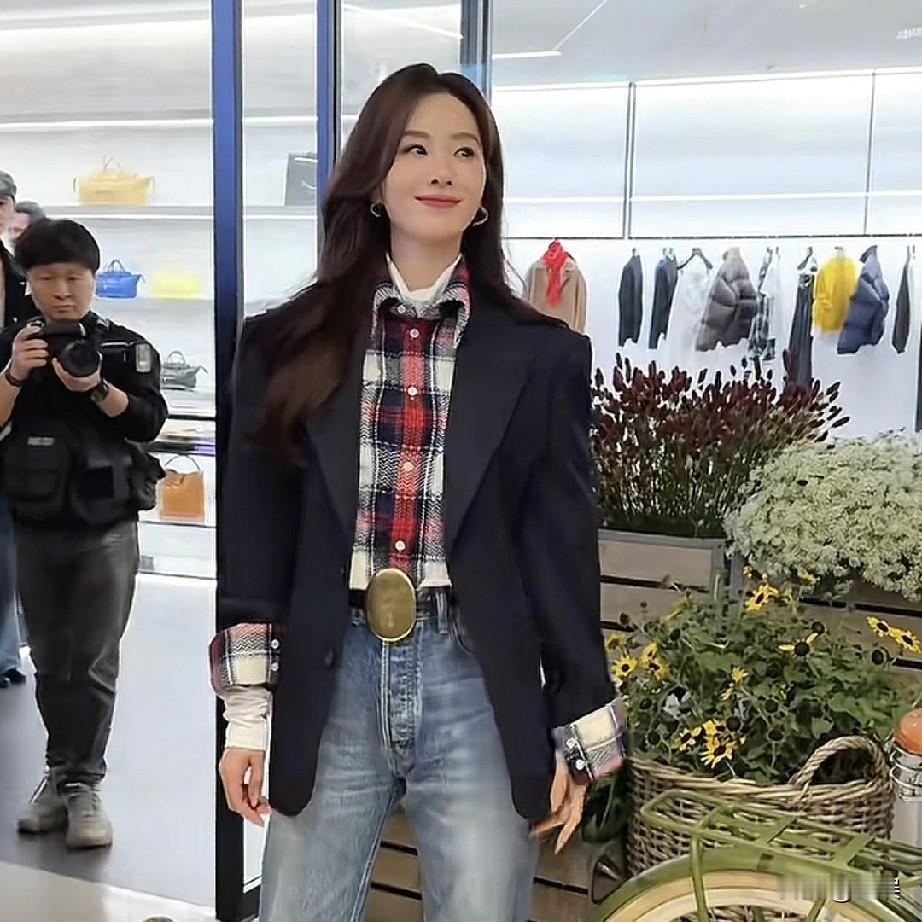 刘诗诗黑色西装外套干练利落,内搭格纹衬衫增添复古活力,搭配水洗蓝牛仔裤与尖头鞋