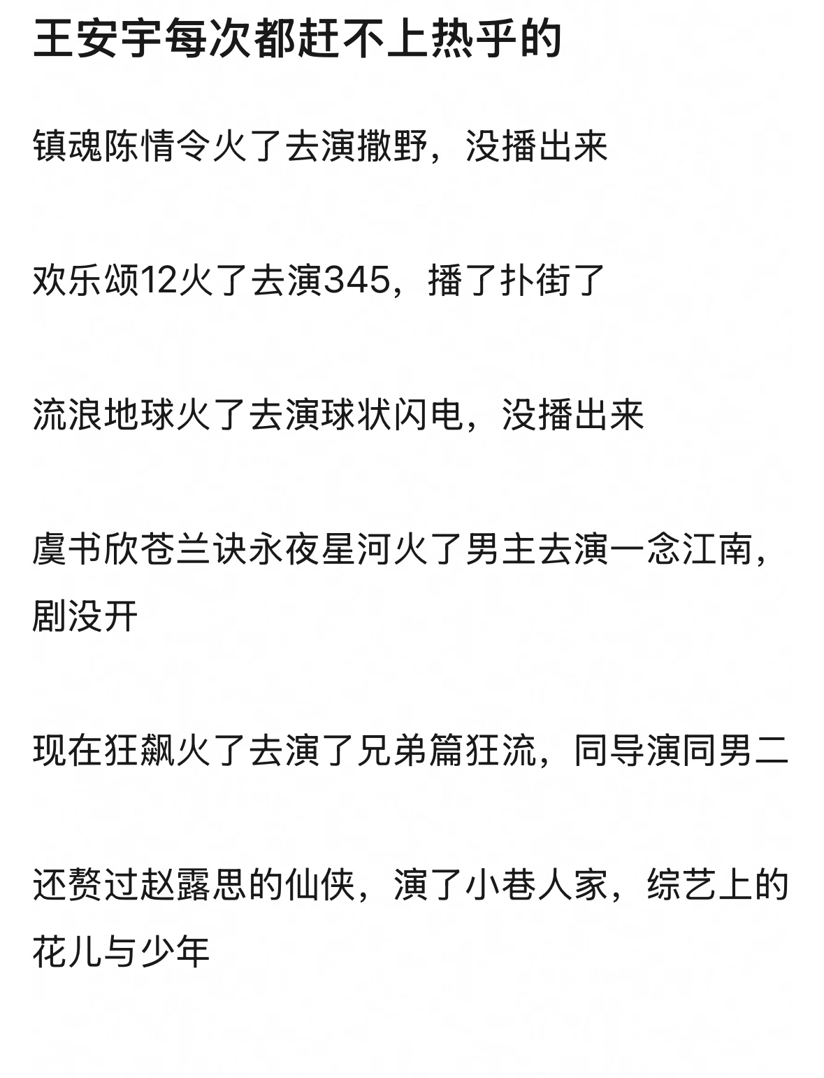 王安宇就算是作品、成绩全挂零,也不影响他后续接一些非偶好饼,真是资源咖里的资源咖