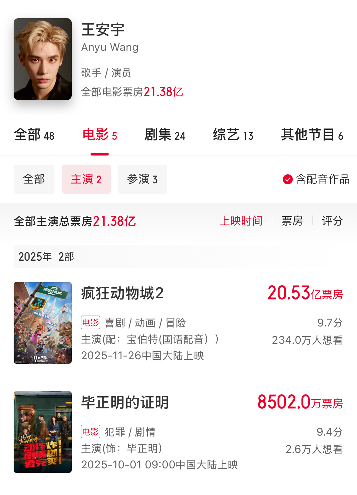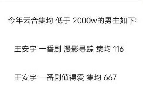 王安宇就算是作品、成绩全挂零,也不影响他后续接一些非偶好饼,真是资源咖里的资源咖。走的每一步壹心都用心捧,有大ip撒野、陷入我们的热恋,有电影球状闪电、毕正明的证明,现在又传狂飙2.0狂流……作品资源绝对是同期里非常靠前的,奈何本人不争气,要么播不出来,要么全扑:光今年的一番漫影寻踪集均才100出头、值得爱600多,二番陷入我们的热恋集均1500,国庆档一番电影照炒同期作品营销口碑黑马,结果票房没破亿,配音全球巨ip动物城,虽然有争议但是蹭到了,“主演总票房”已超20亿顶级资源咖一路扑一路捧,本子还越来越好,真的羡慕哭了……