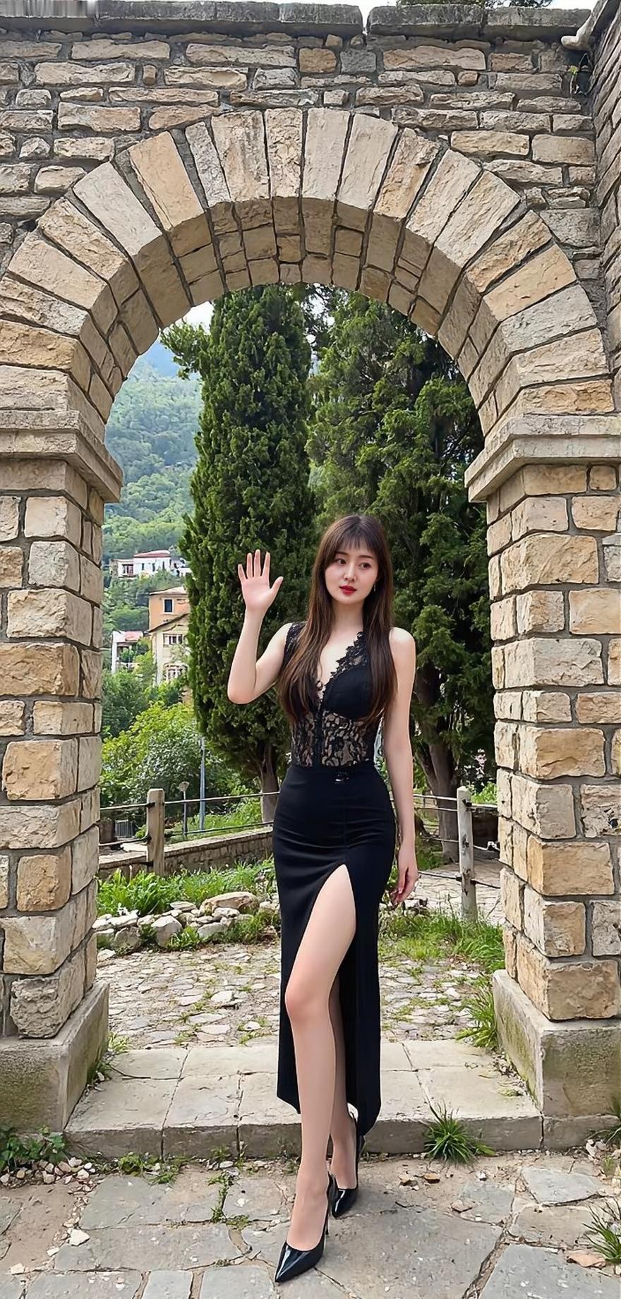 优雅黑裙,石拱门下,绿意盎然,时尚与自然的完美融合。