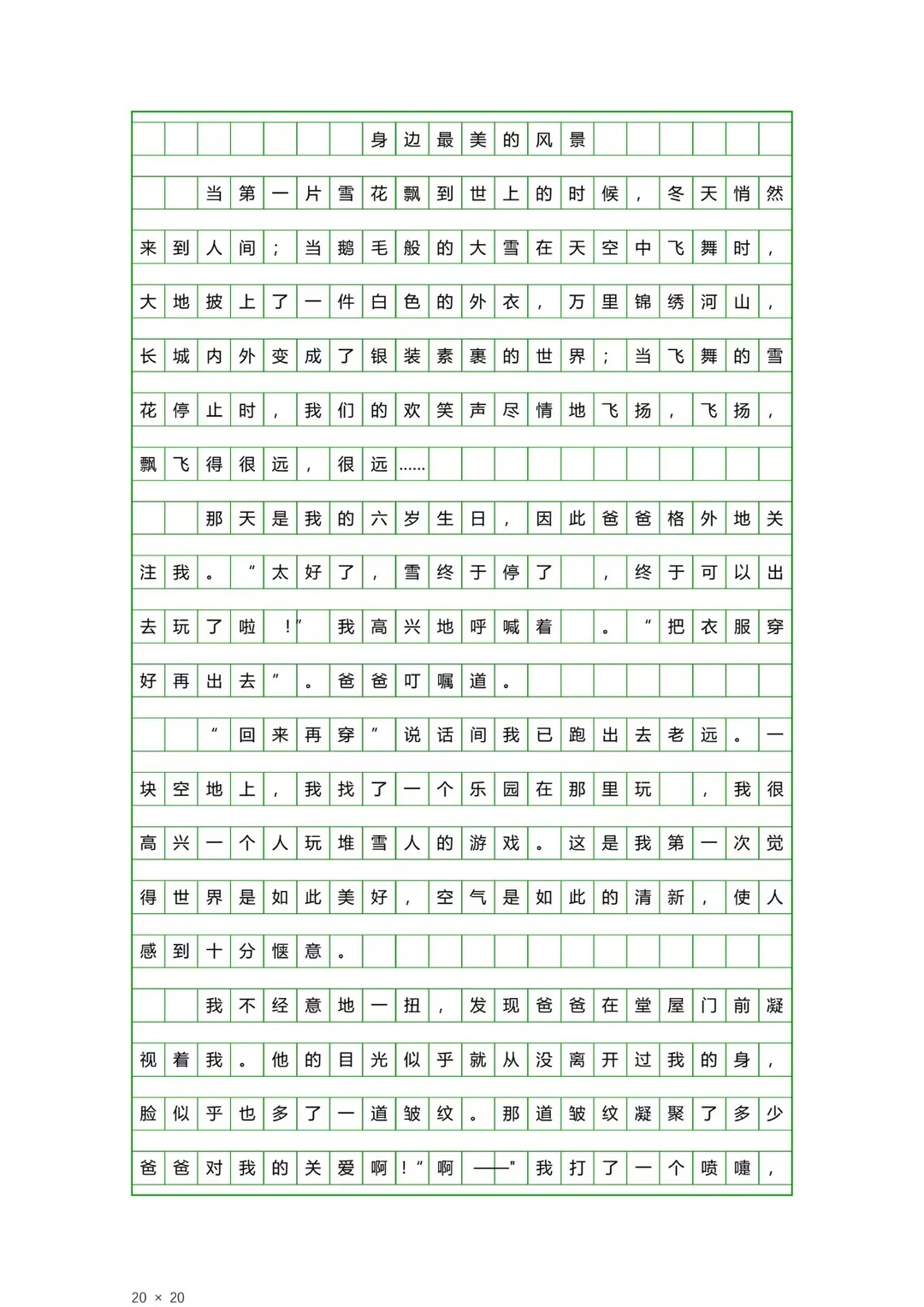 当第一片雪花飘到世上的时候,冬天悄然来到人间;当鹅毛般的大雪在天空中飞舞时,大地披上了一件白色的外衣,万里锦绣河山,长城内外变成了银装素裹的世界;当飞舞的雪花停止时,我们的欢笑声尽情地飞扬,飞扬,飘飞得很远,很远……