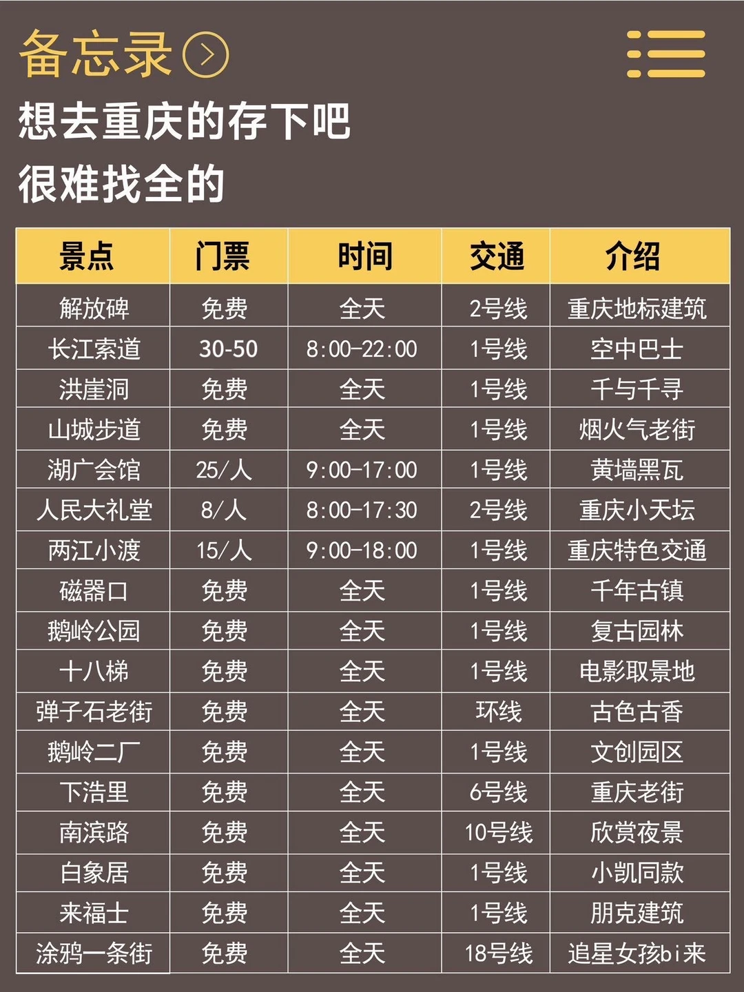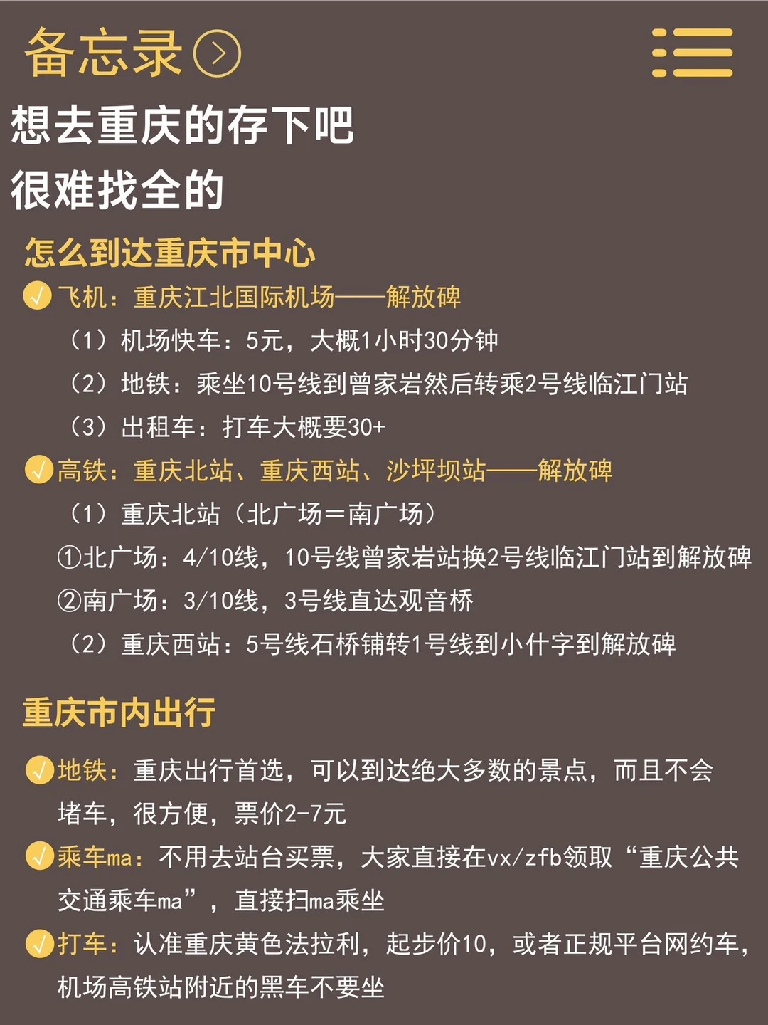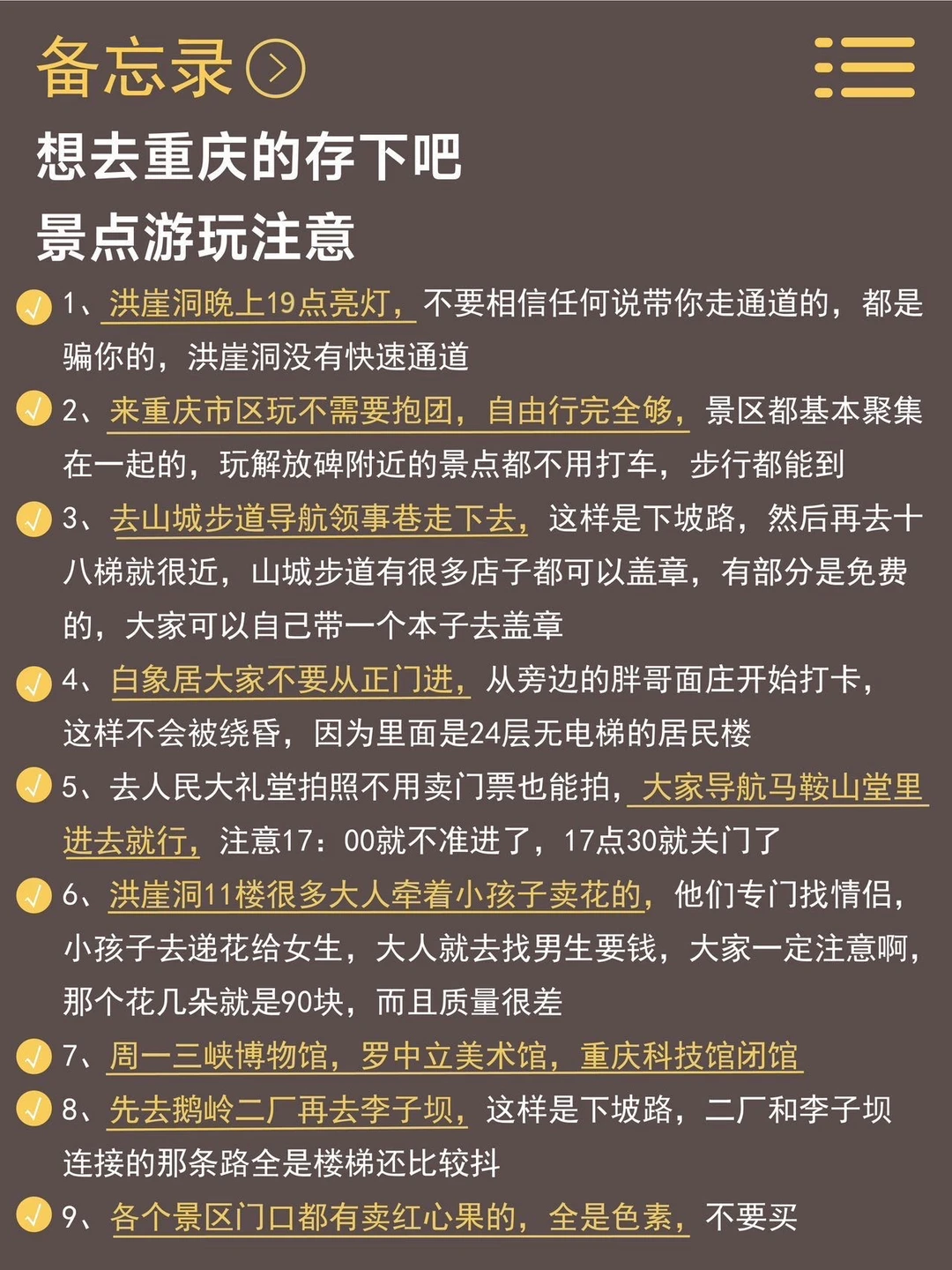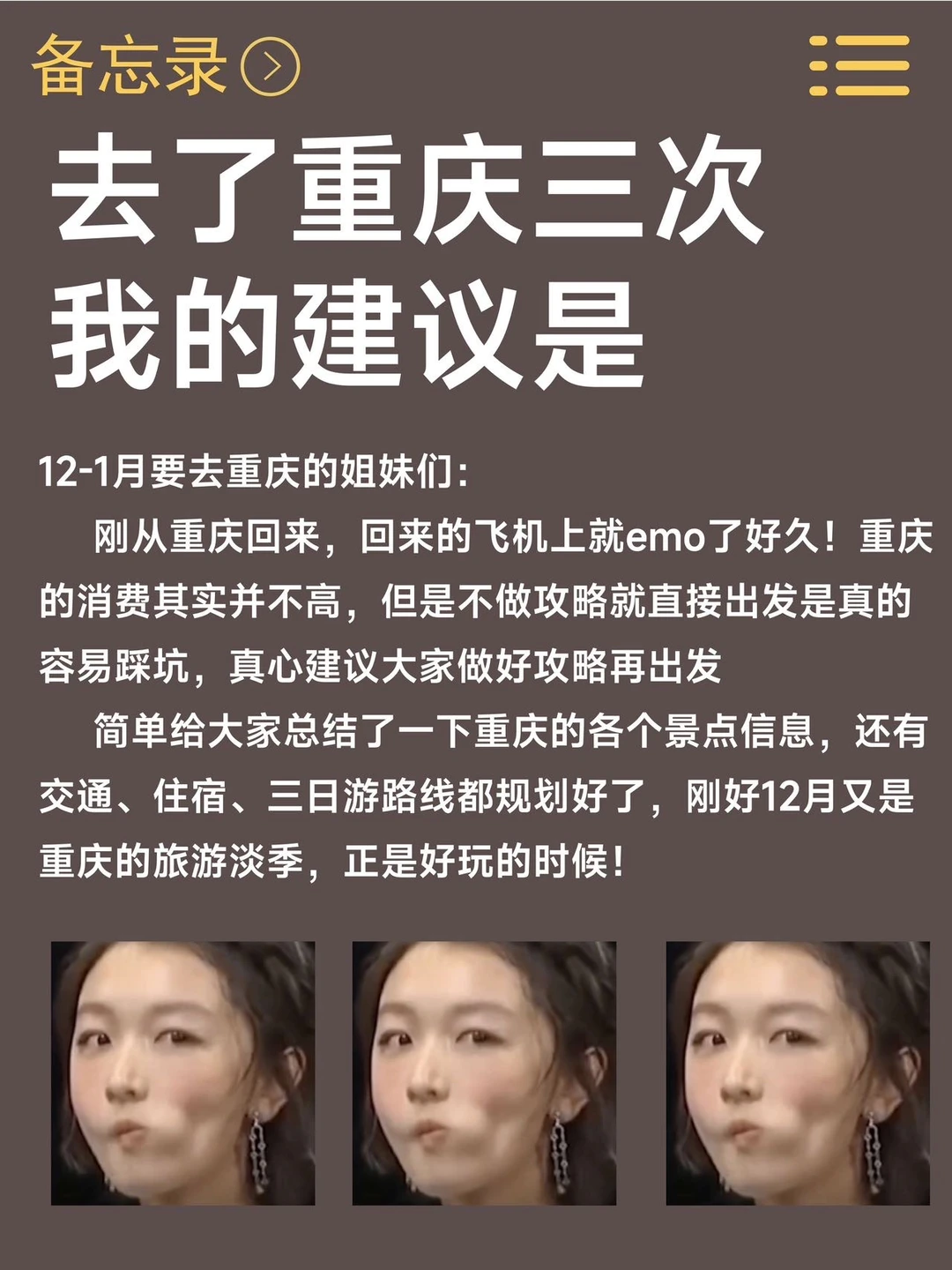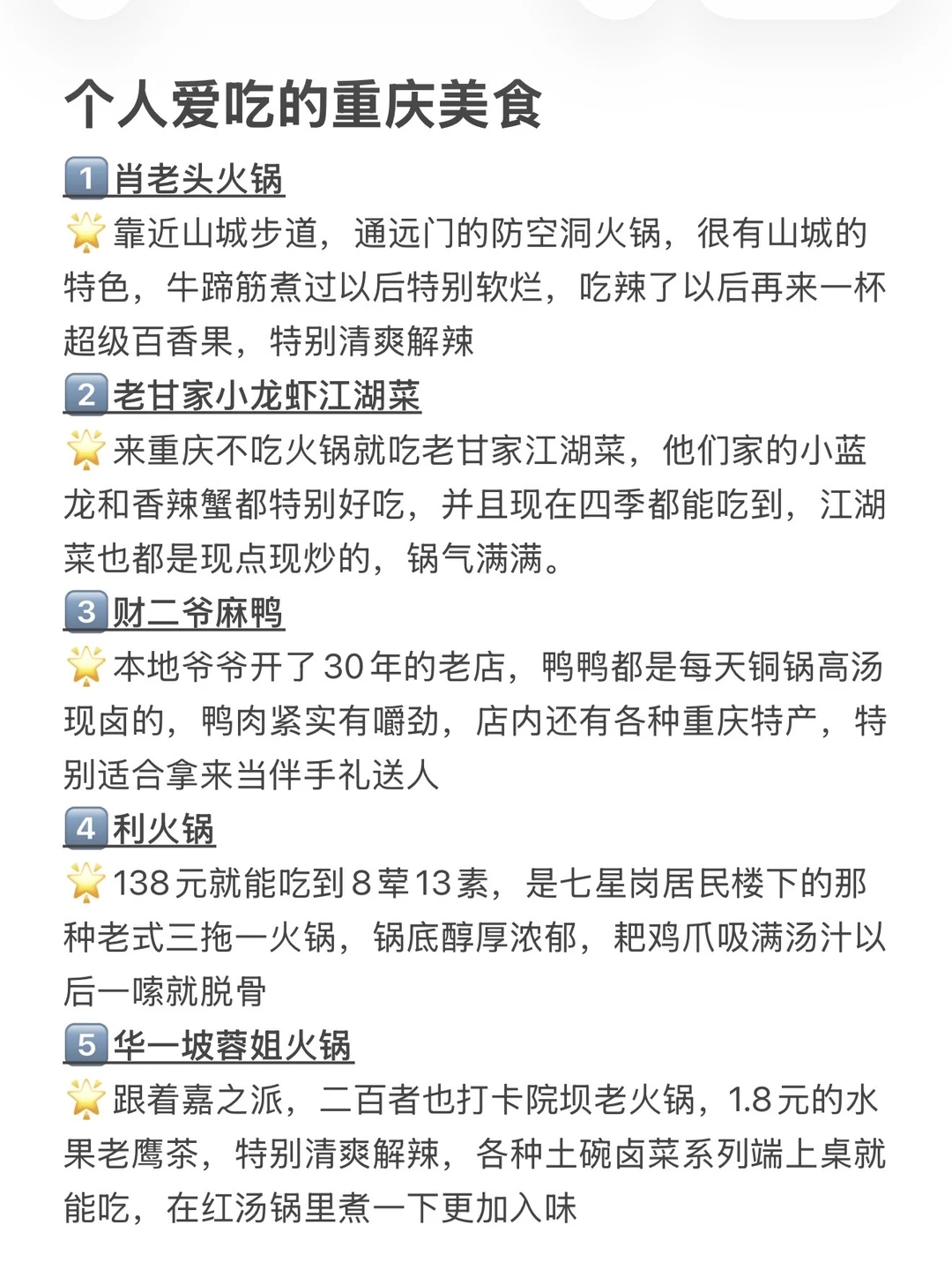虽然重庆近几天都在出太阳,白天不太冷,但是没有阳光照着的地方以及晚上是真的吹着冷啊...去之前没怎么做攻略有点后悔了,感觉真的花了很多冤枉钱😭走了很多冤枉路,现在把我的一些旅游小心得分享给大家参考参考 . 🥶关于重庆天气 重庆的冷属于湿冷,风吹着就感觉刺骨的冷,所以防风,打底保暖要做好,目前的温度是在15度左右,是需要穿大衣的,晚上吹风吹着感觉更冷雨伞建议也带一把 🏨关于重庆住宿 解放碑优先选,周围的景点又多,吃喝玩乐都很方便,观音桥也不错 . 重庆旅游重庆三日游重庆美食重庆火锅大声安利本地美食重庆旅游现状本地人爱吃重庆美食攻略重庆美食推荐本地人财二爷麻鸭老甘家