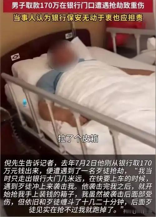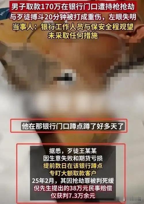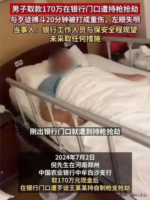 男子取170万被抢致失明! 银行职员冷眼旁观真寒心! 2024年7月,郑州倪先生从农行取了170万现金,刚出银行门就遭歹徒持枪抢劫。 他拼了命跟歹徒缠斗20分钟,脸被打烂,左眼直接瞎了,最后鉴定是重伤二级、八级伤残。 可气的是,银行里的工作人员和保安,就站在门口看着! 既不上前帮忙,也不报警,全程当看客。最后还是路过的陌生人报的警、叫的救护车。 歹徒早就蹲点好几天了,银行保安愣是没发现异常? 倪先生提前预约了大额取款,满心以为银行能护着点,结果落得这个下场。 后来歹徒判了死缓,可倪先生要的38万赔偿,只拿到7万多。 他找银行要说法,对方领导只会推诿,现在银保监局介入了,还没个结果。 律师都说银行没尽到安全义务,有过错。 咱就说,储户把钱存在银行,取大额现金时,银行难道不该多操点心? 哪怕提醒一句安全,或者临时送几步到车上,也不至于这样啊! 银行要是一直这么冷血,以后谁还敢放心去取钱?真心希望这事能有个公道结果,别让好人寒了心!
